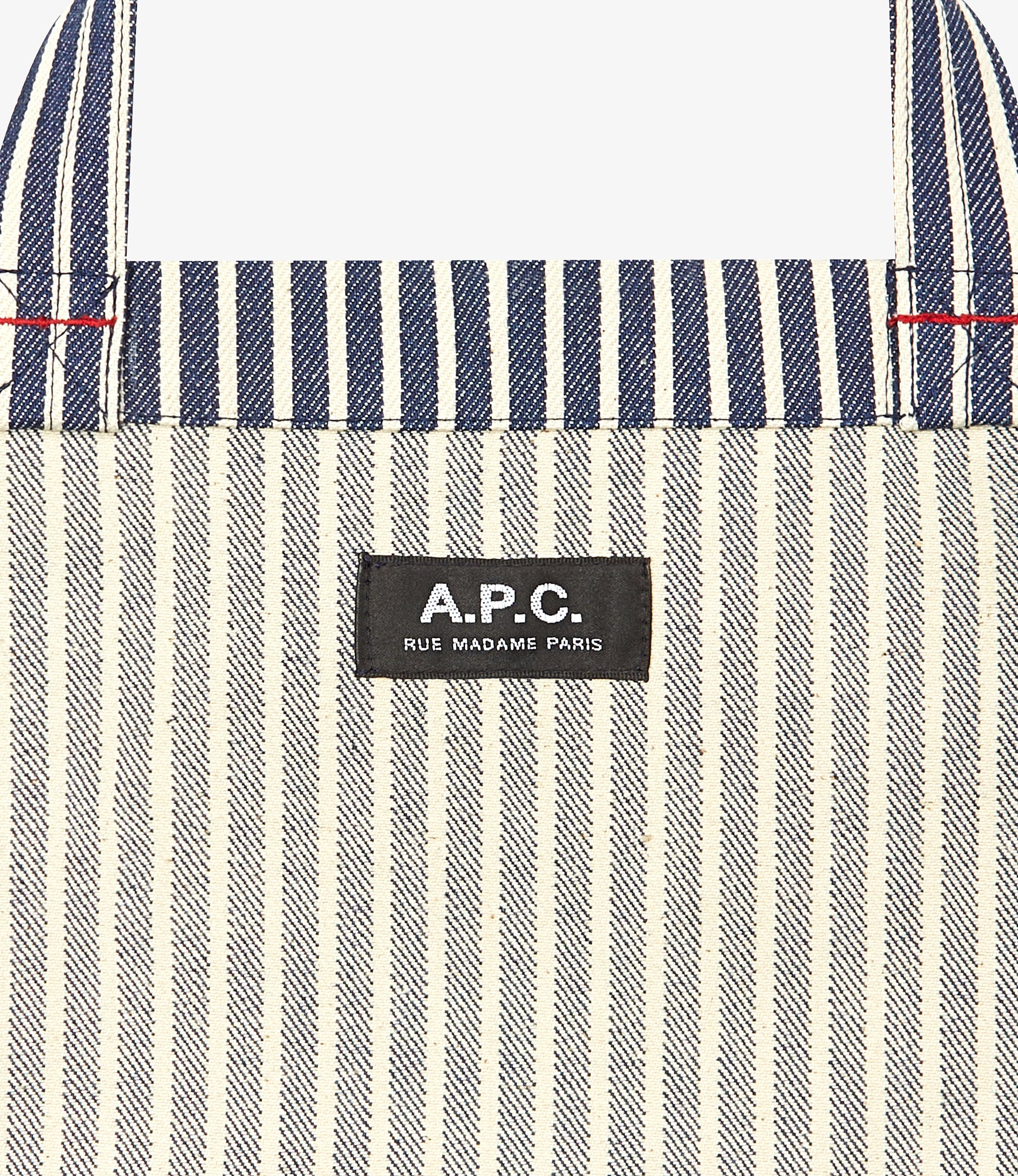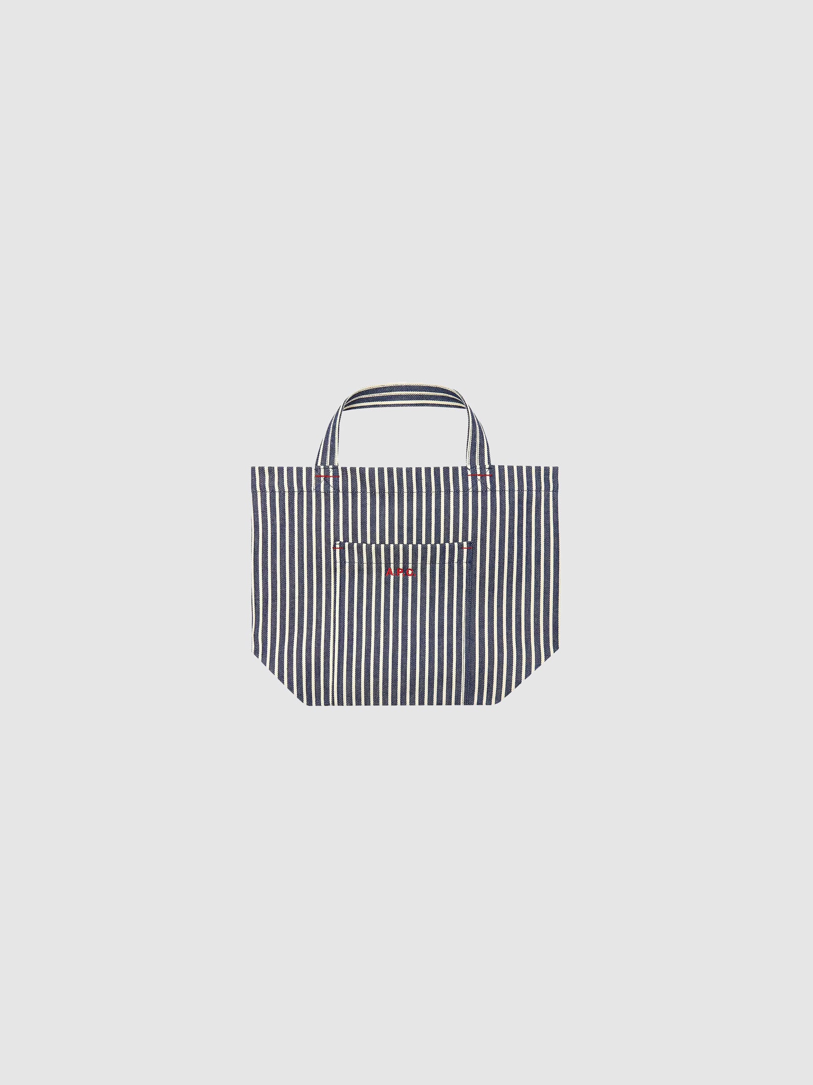 - Malá horizontální taška s modrými a bílými pruhy z těžké bavlny ve stylu pracovního oblečení.
