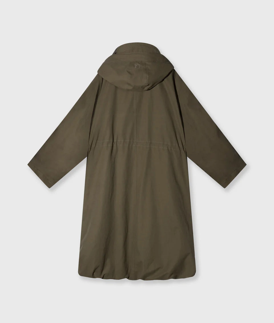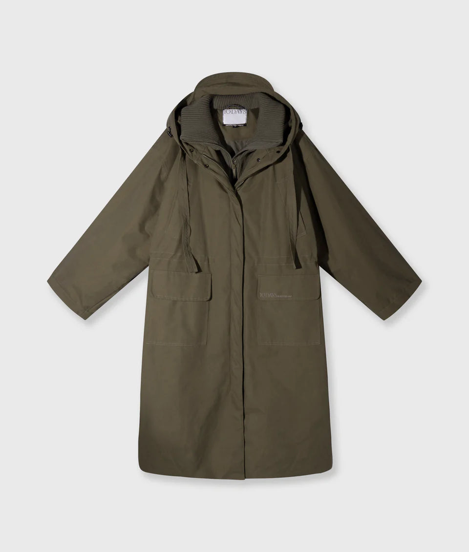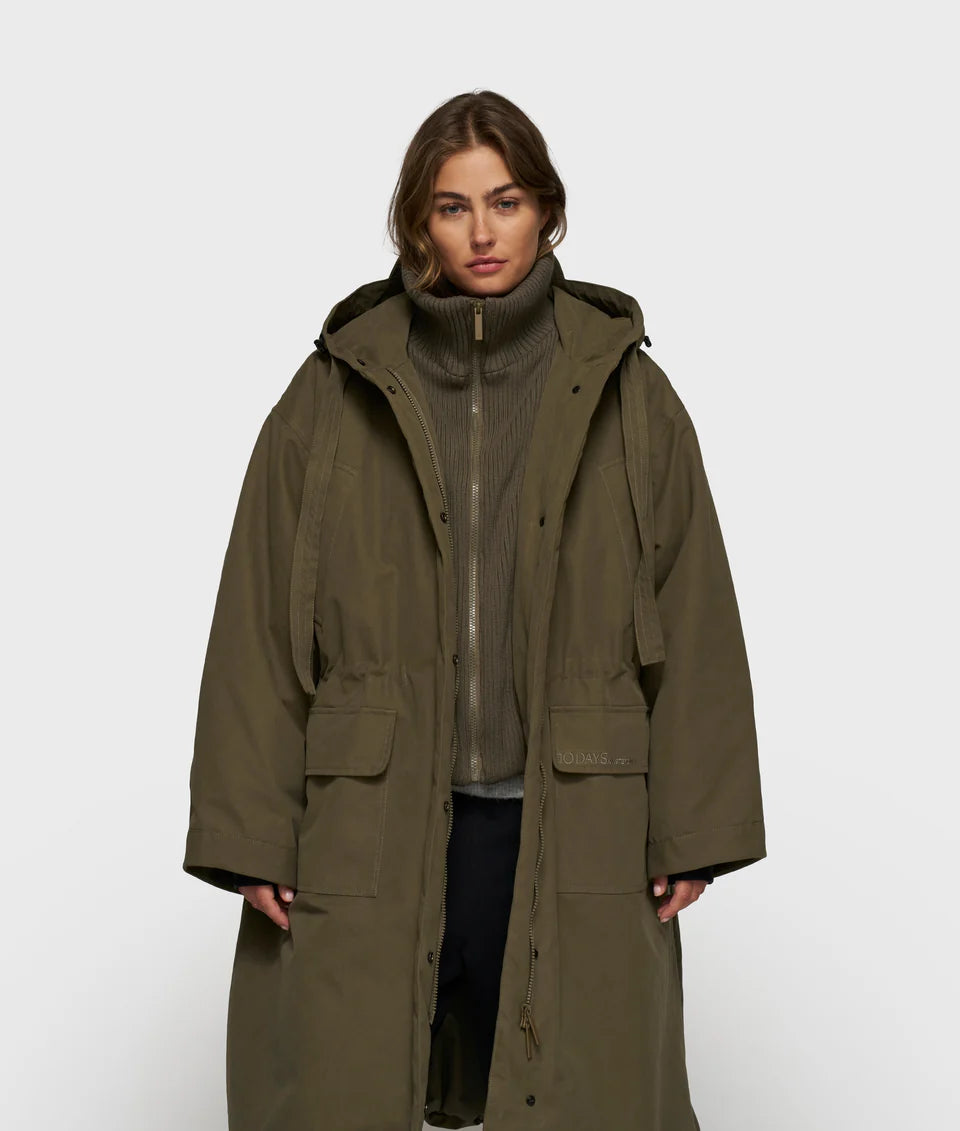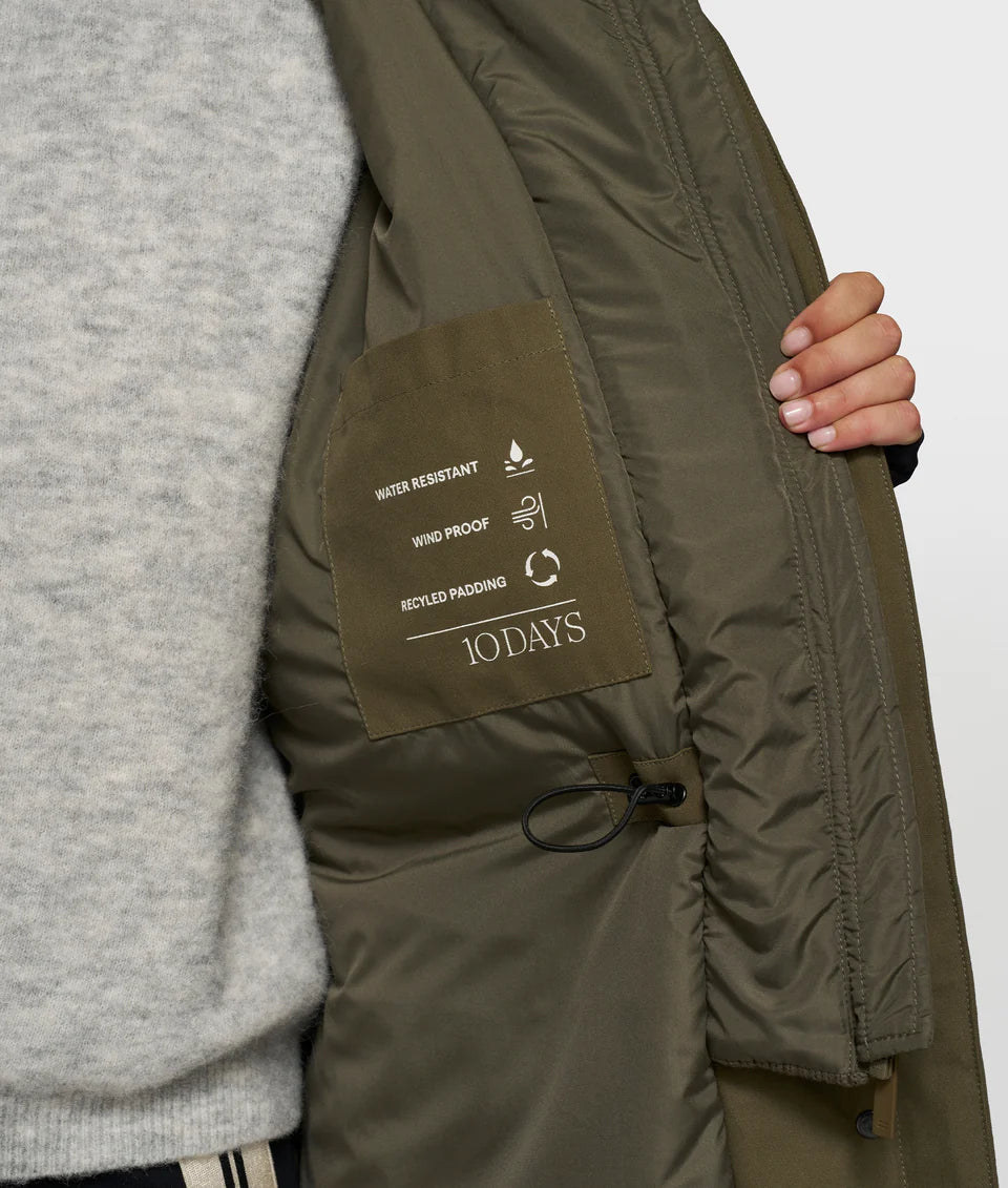 Parka z nepromokavé tkaniny s voděodolností 5 000 mm a svrškem z 50 % recyklovaného materiálu. S vnitřní bundou z extra vysokého žebrovaného úpletu, fleecovými kapsami a potápěčskými manžetami s otvory pro palce. Součástí je skrytá léga, přední ramínka, vnitřní nastavitelný elastický pas a kapuce se stahovacími šňůrkami. Dále má výšivku monogramu „10“ na kapuci, výšivku „10DAYS Amsterdam“ na kapse, dvě přední kapsy, vnitřní kapsu a charakteristické padákové popruhy 10DAYS pro nošení bez použití rukou.