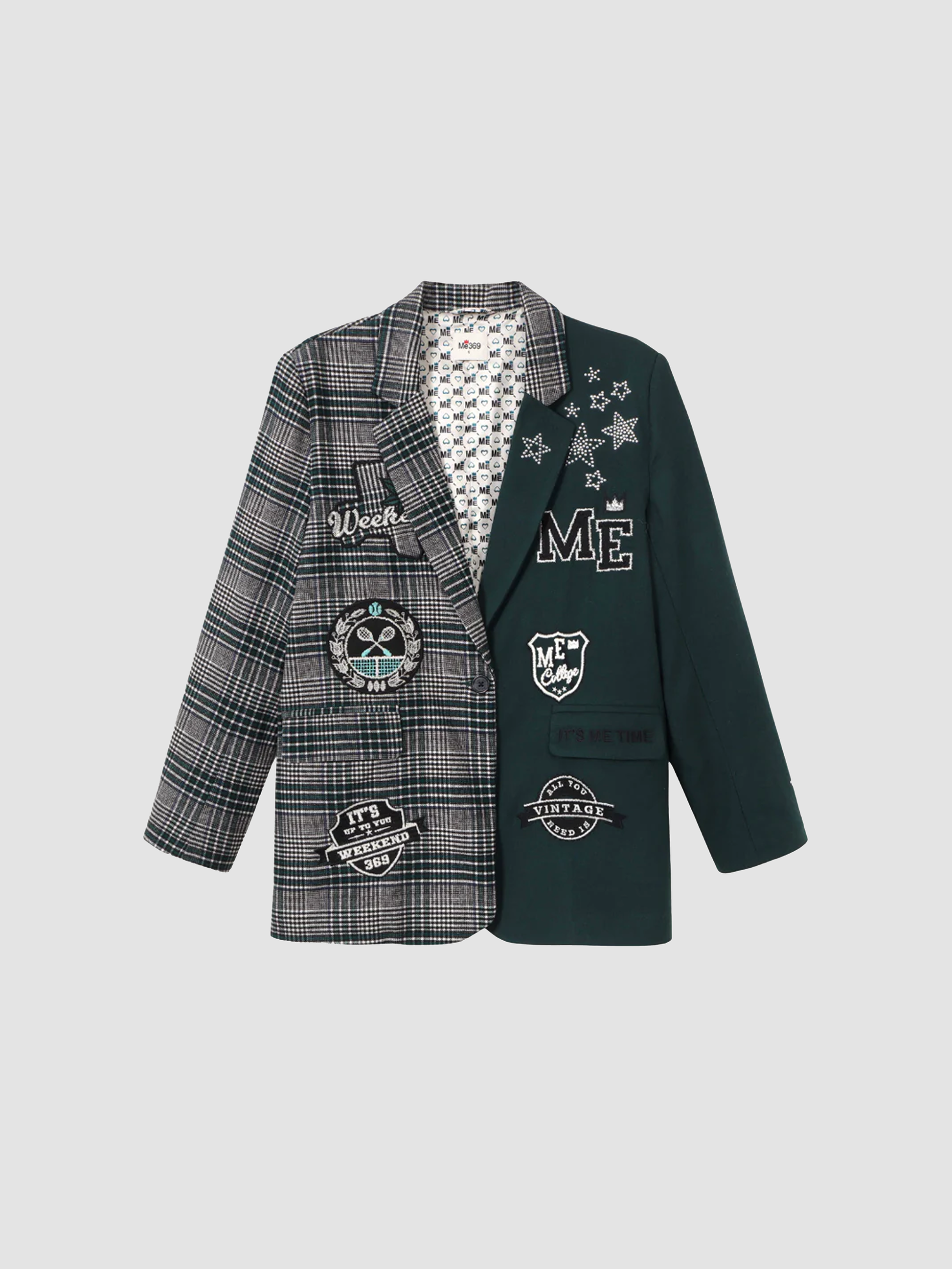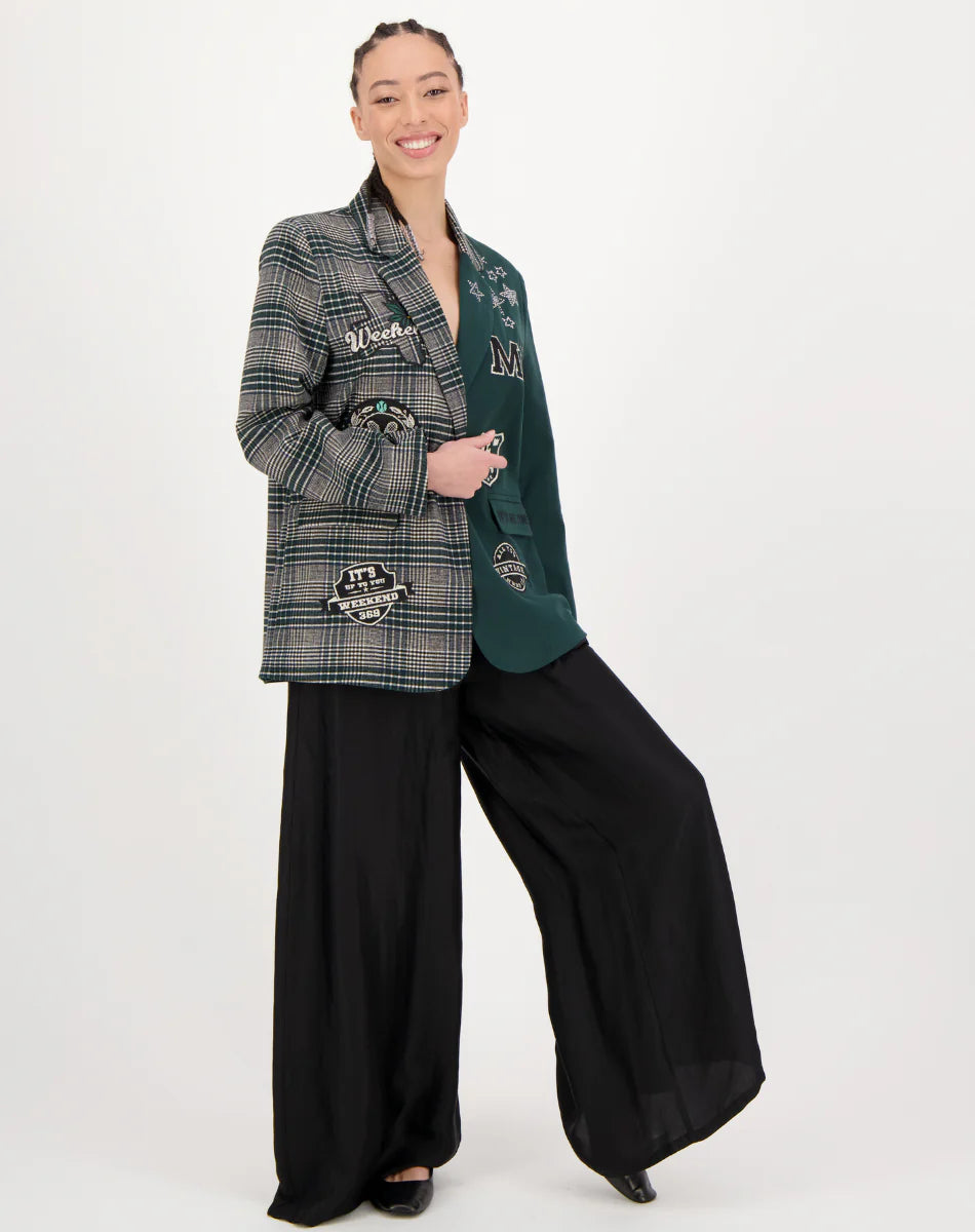 Vintage sako ve stylu saka s límečkem, klopou a dvěma klopami na kapsy. Jedna strana je šedě kostkovaná, druhá strana je smaragdově zelená. Zapínání na jeden knoflík vpředu, tři knoflíky na každém rukávu. Bunda má na přední straně retro vypadající nášivky zobrazující „JÁ“ a tenis a víkend. Zadní strana má velkou krásnou grafiku křídla v bílé barvě. Spárujte tuto bundu se svými oblíbenými kalhotami pro boho chic vzhled.