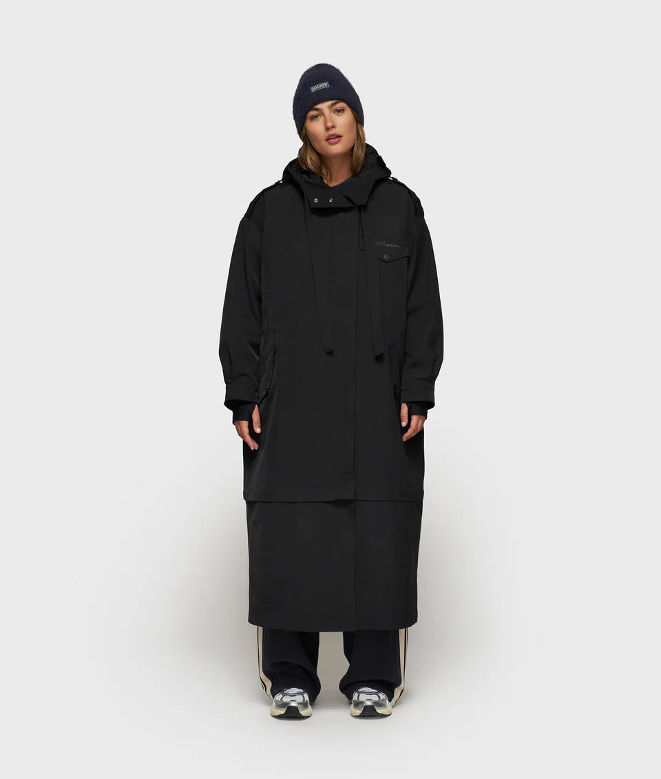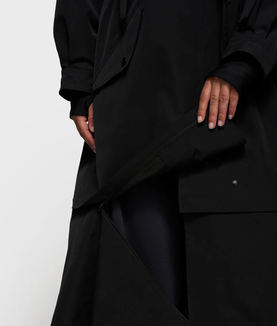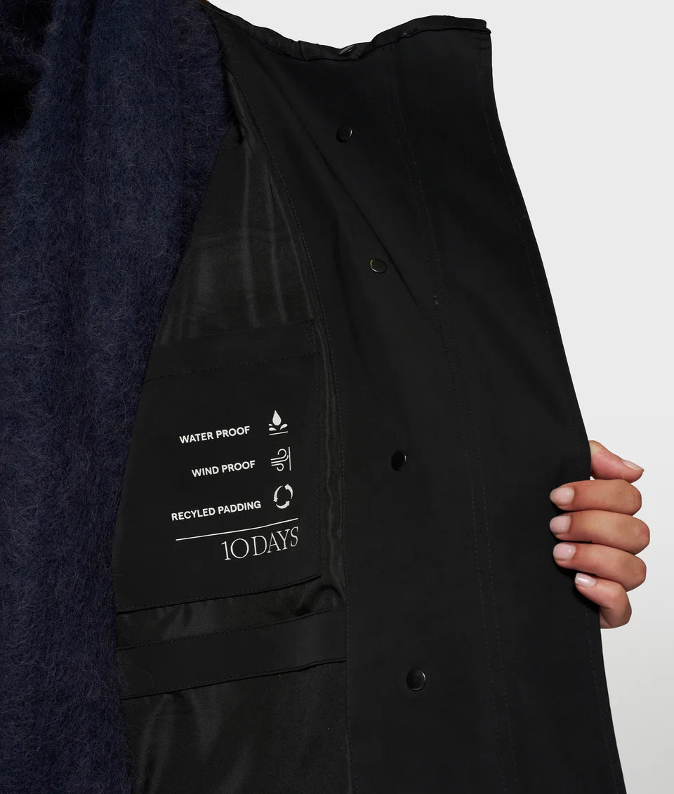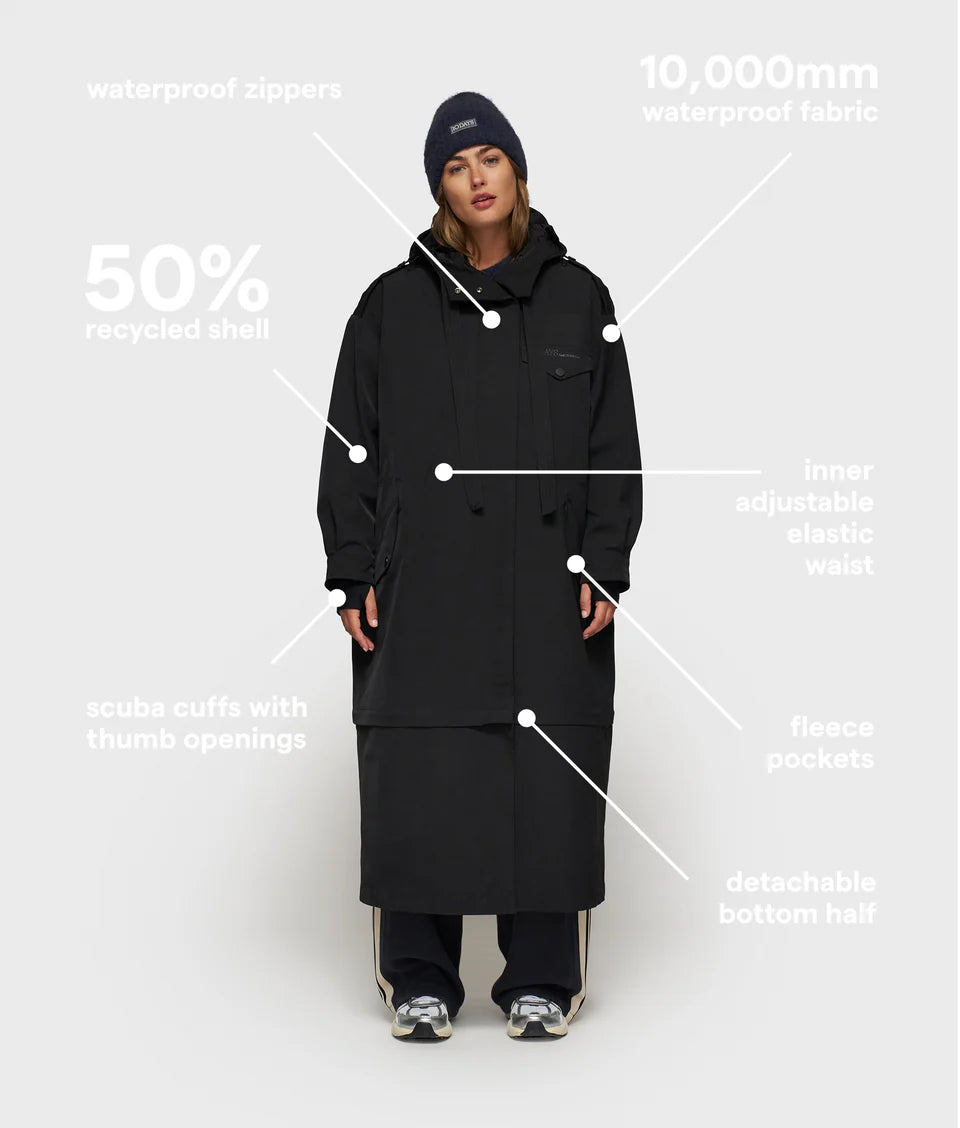 Klasická nepromokavá pláštěnka vyrobená z nepromokavé tkaniny s voděodolností 10 000 mm a 50% recyklovanou svrškem. Má odnímatelnou spodní polovinu, skrytý lem a nepromokavé zipy. Součástí jsou fleecové kapsy, potápěčské manžety s otvory pro palce, přední popruhy, vnitřní nastavitelný elastický pas a kapuce se stahovací šňůrkou. Dále má monogram „10“ na kapuci, potisk „10DAYS Amsterdam“ nad kapsou, dvě přední kapsy na knoflíky, vnitřní kapsu a charakteristické padákové popruhy 10DAYS pro nošení bez použití rukou.