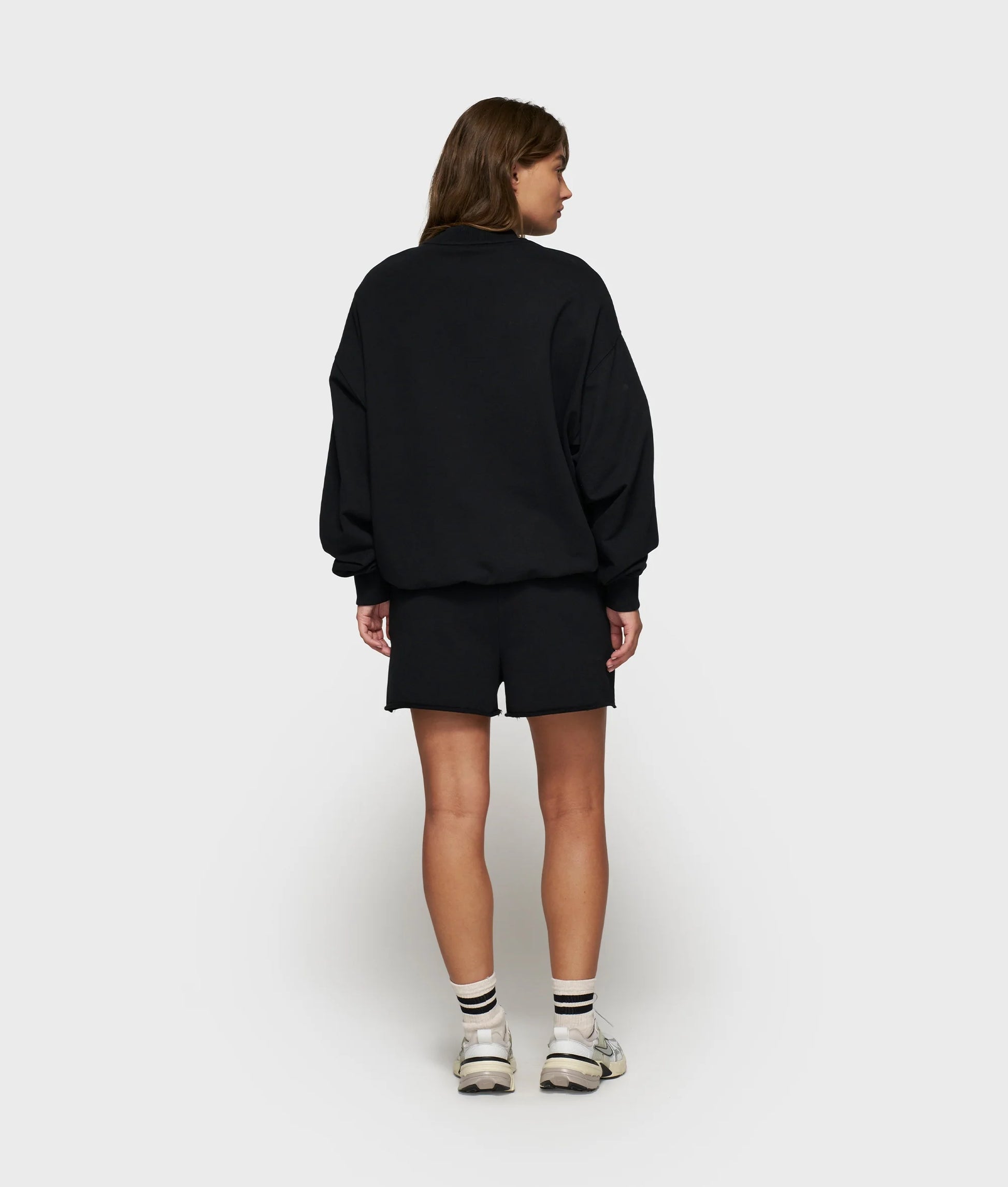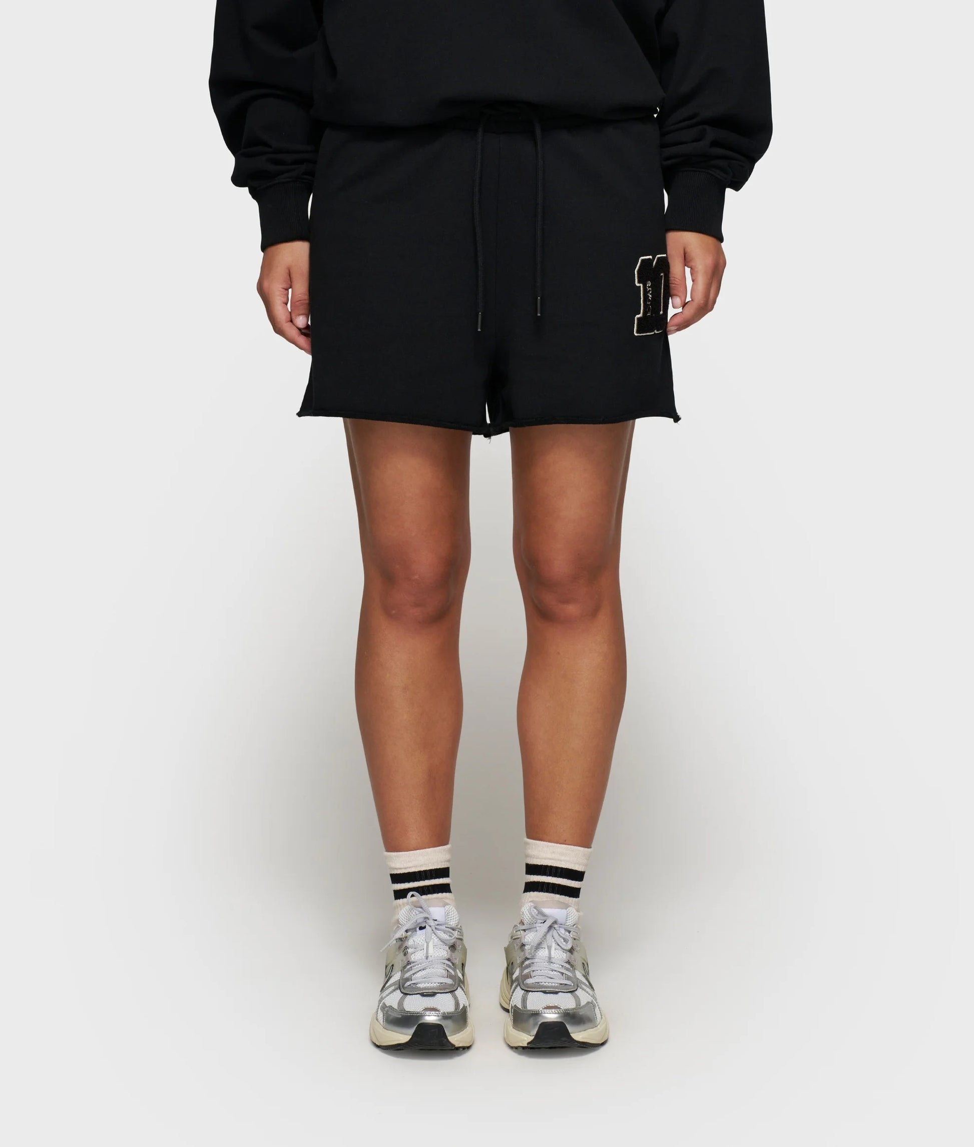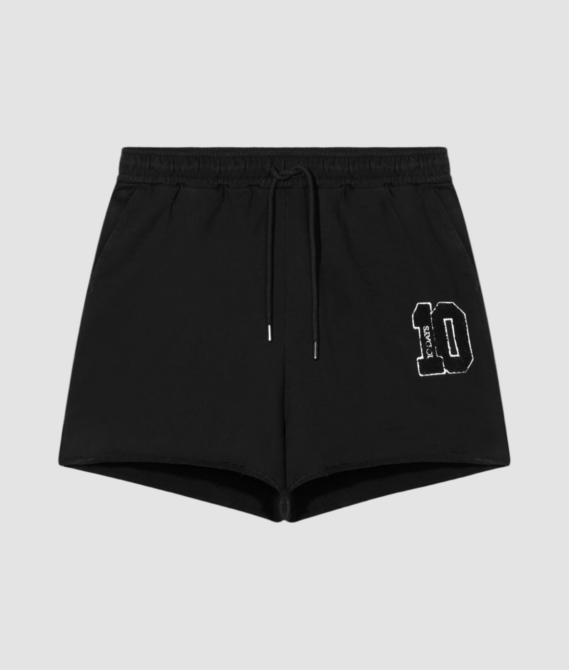 Volné šortky z měkké bavlny ve stylu fleece. Mají elastický pas se stahovací šňůrkou, šikmé kapsy po stranách, imitaci zadní kapsy, nohavice s nedokončeným lemem a střední nášivku s číslem „10“ na levé přední straně.