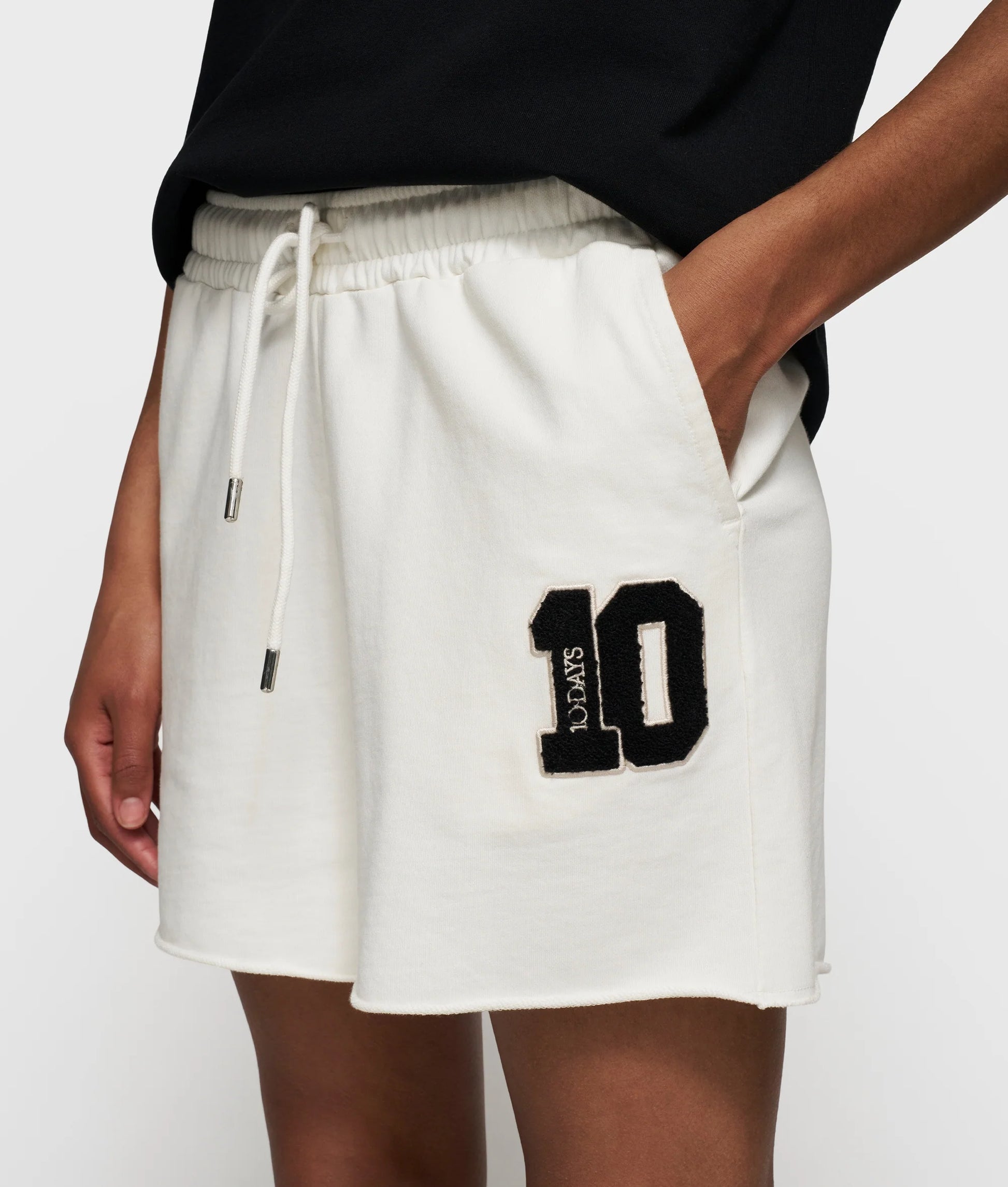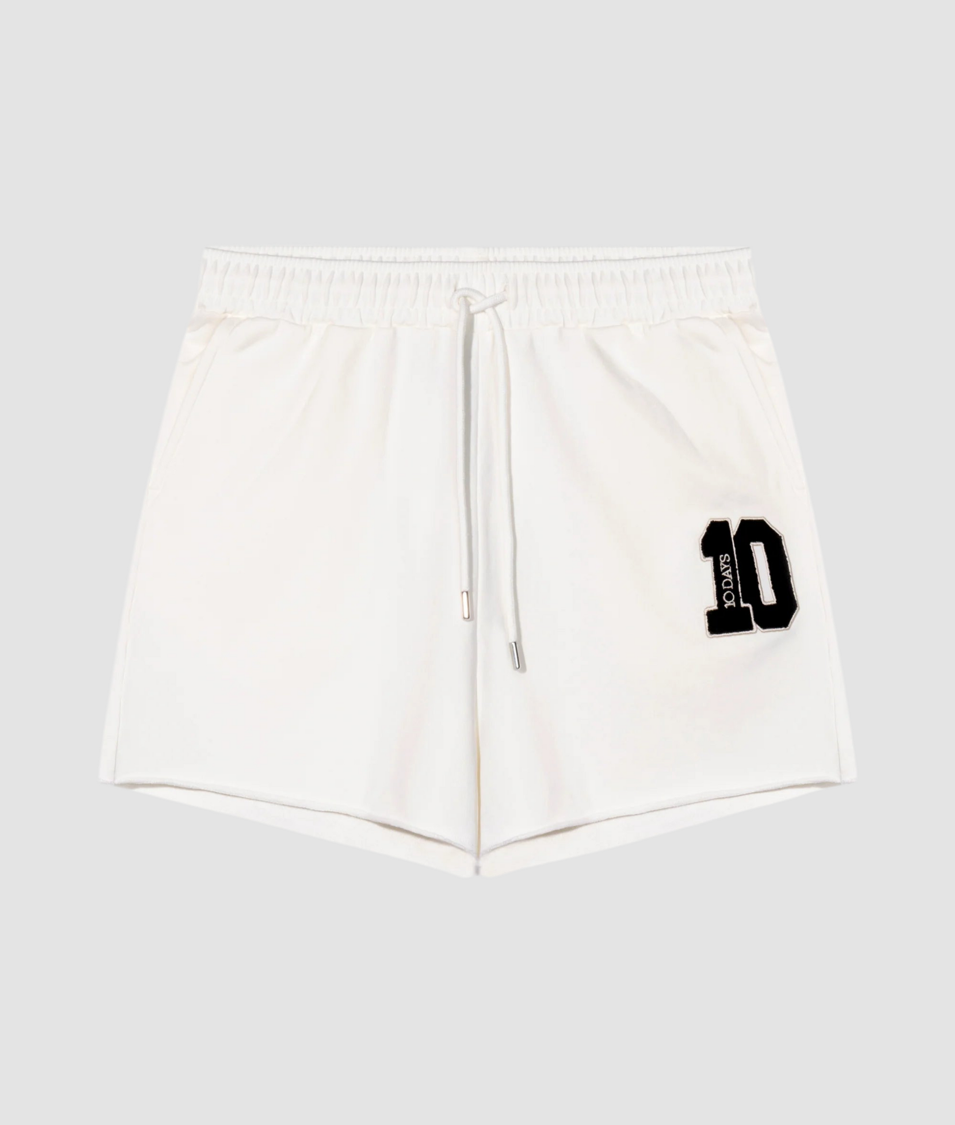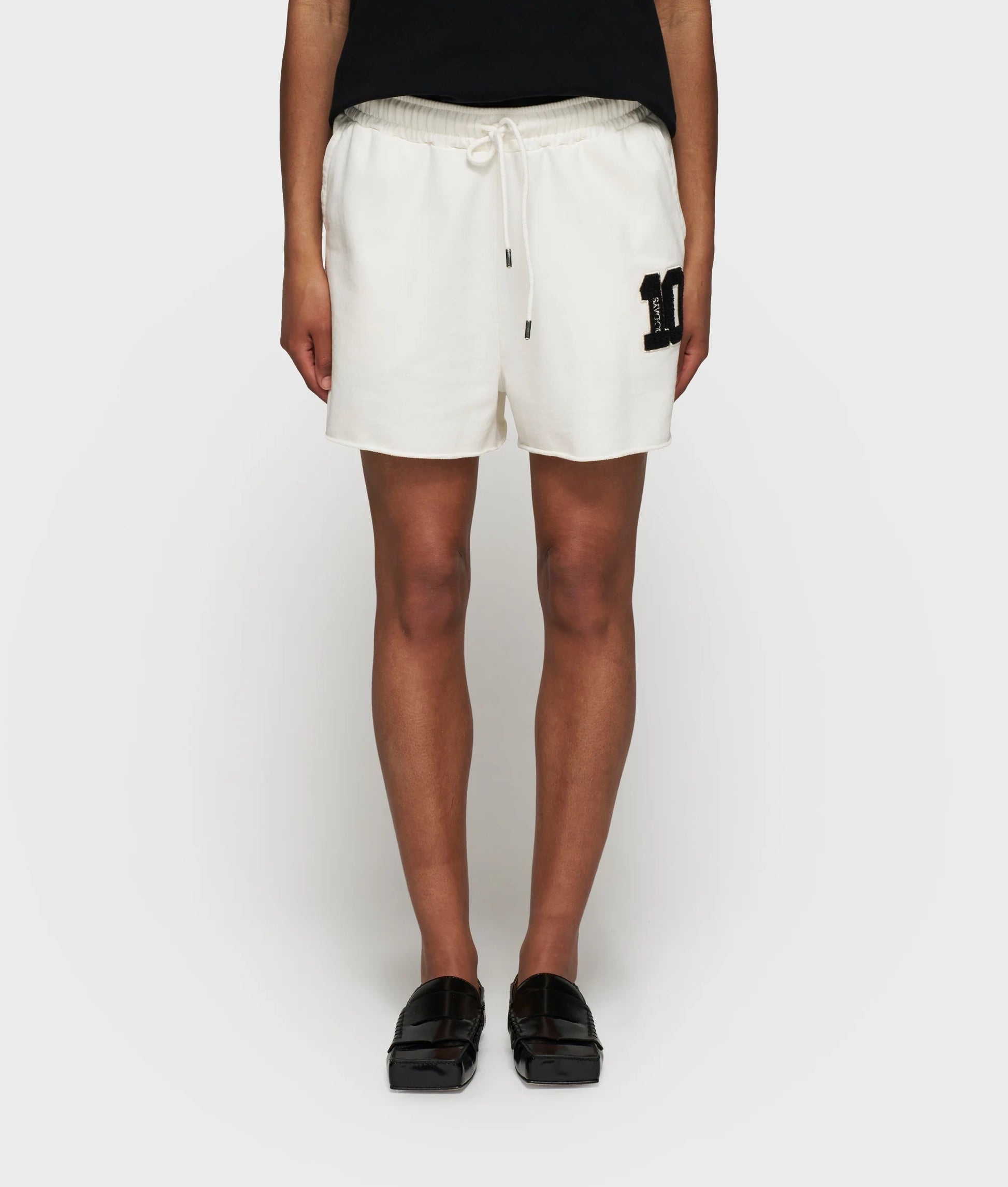 Volné šortky z měkké bavlny ve stylu fleece. Mají elastický pas se stahovací šňůrkou, šikmé kapsy po stranách, imitaci zadní kapsy, nohavice s nedokončeným lemem a střední nášivku s číslem „10“ na levé přední straně.