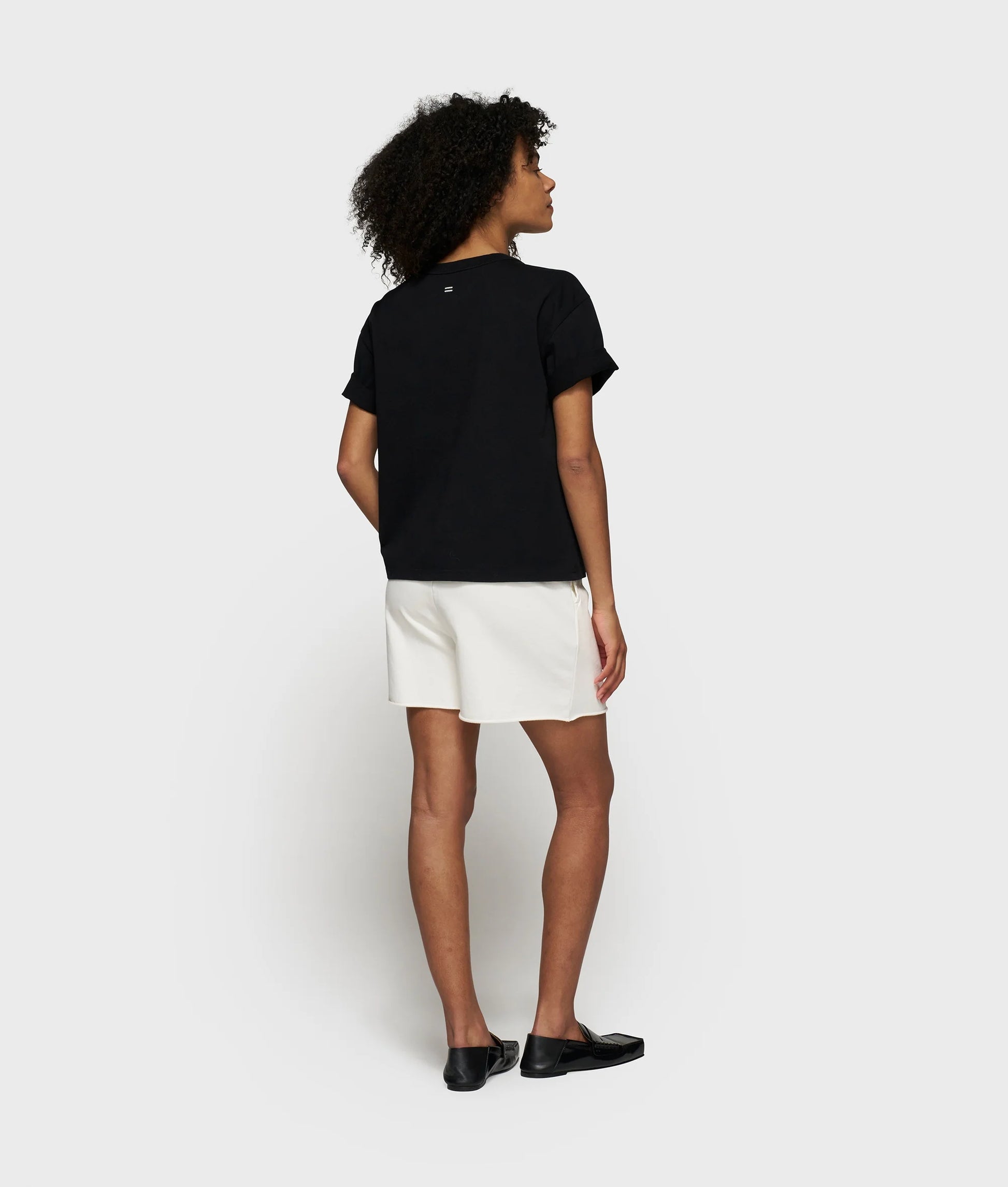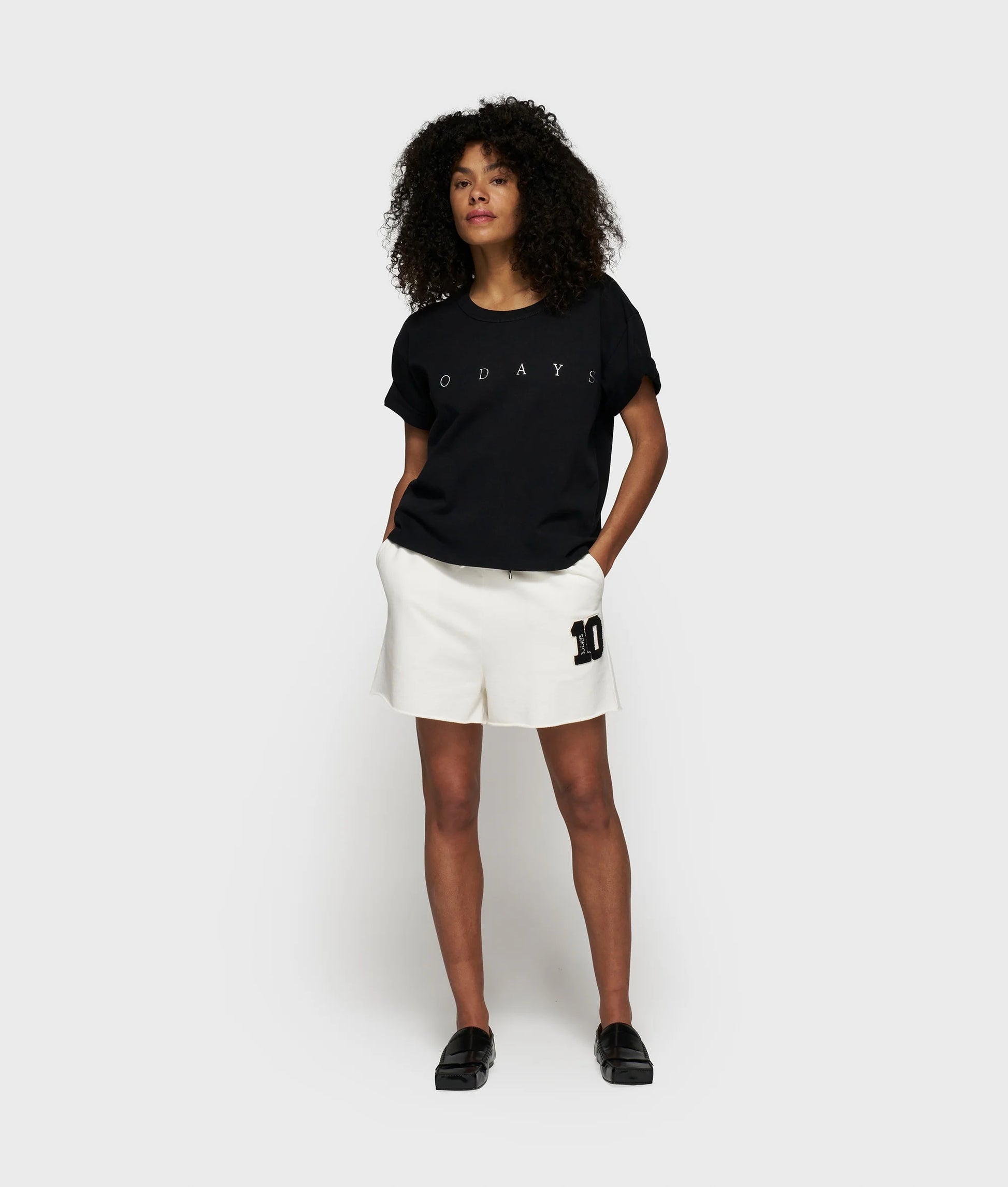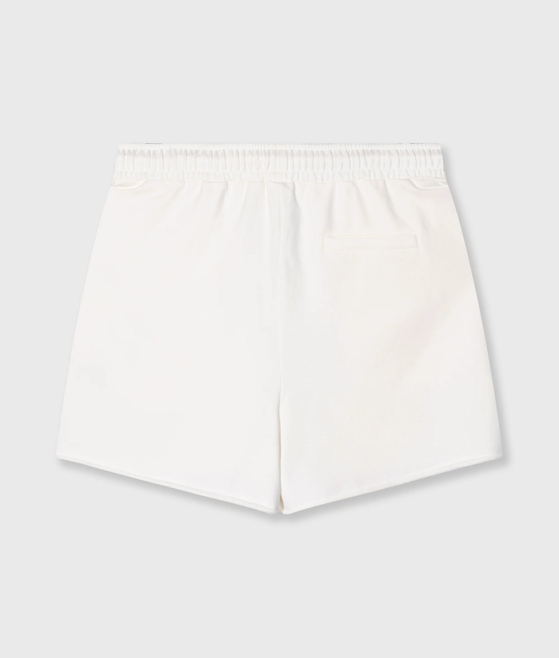 Volné šortky z měkké bavlny ve stylu fleece. Mají elastický pas se stahovací šňůrkou, šikmé kapsy po stranách, imitaci zadní kapsy, nohavice s nedokončeným lemem a střední nášivku s číslem „10“ na levé přední straně.