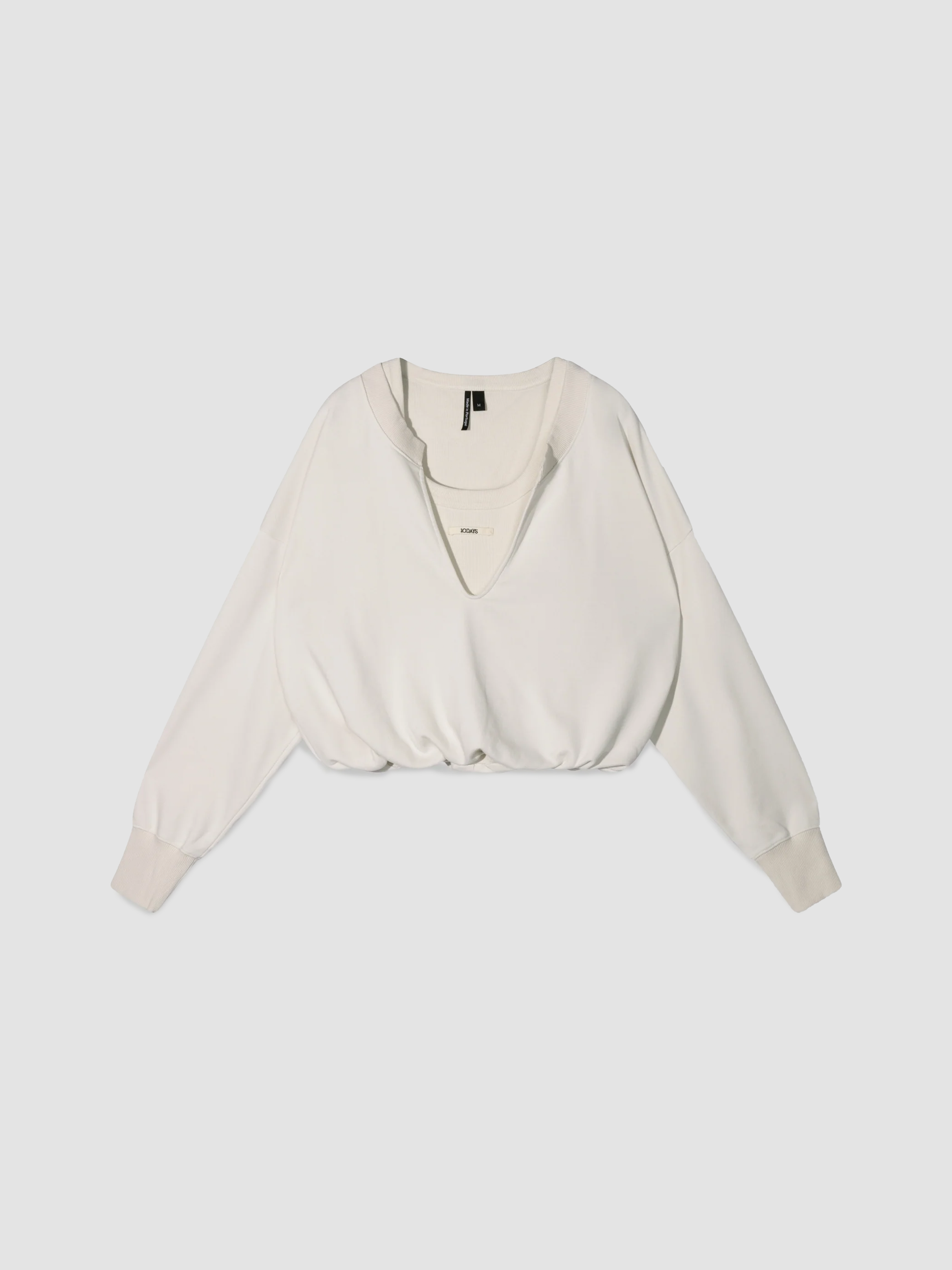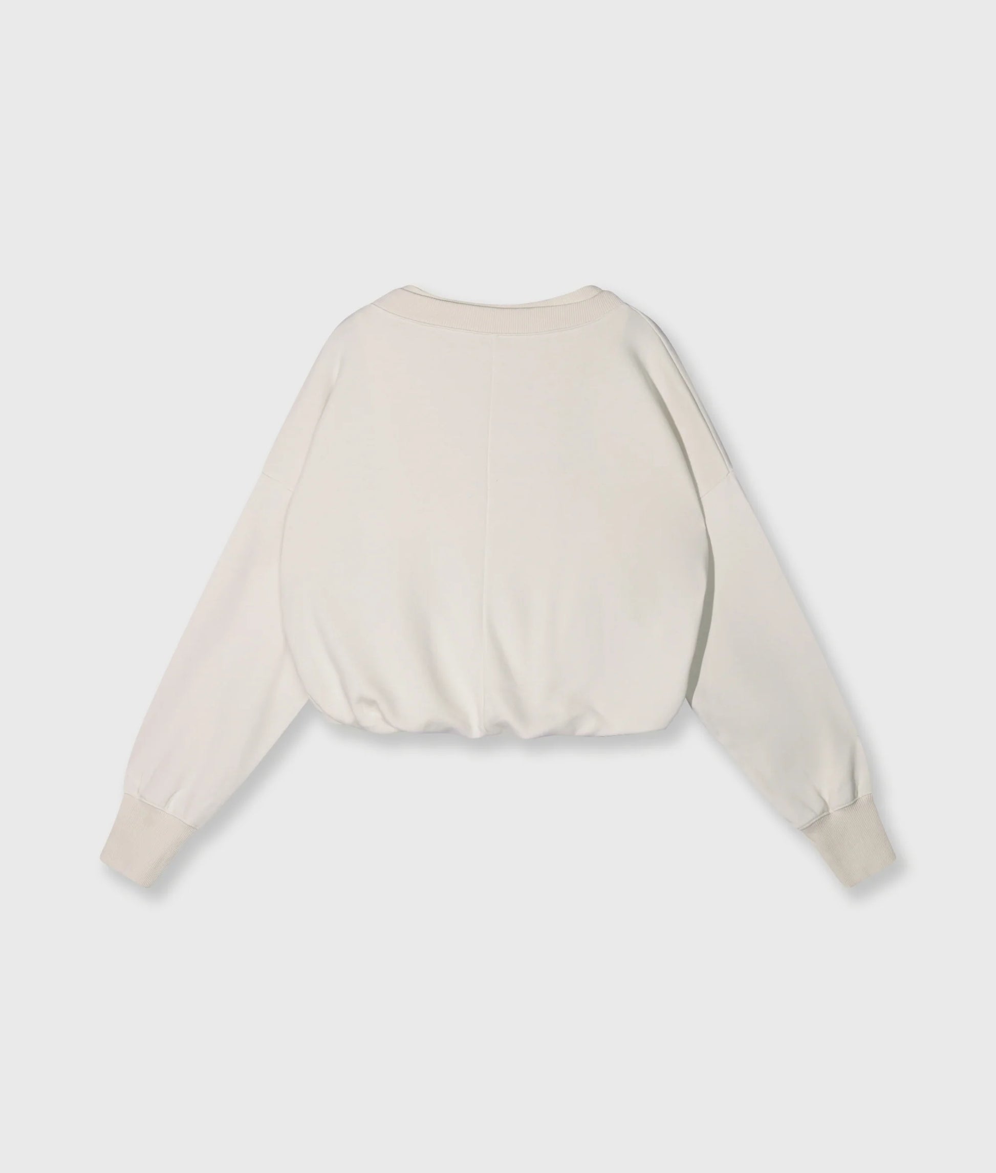 Svetr volného střihu s výstřihem do V, vyrobený z měkké bavlněné fleece. Má pevné vnitřní tílko s kulatým výstřihem, balónkovitý lem, žebrované lemování a plátěnou etiketu „10DAYS“ na přední straně tílka.