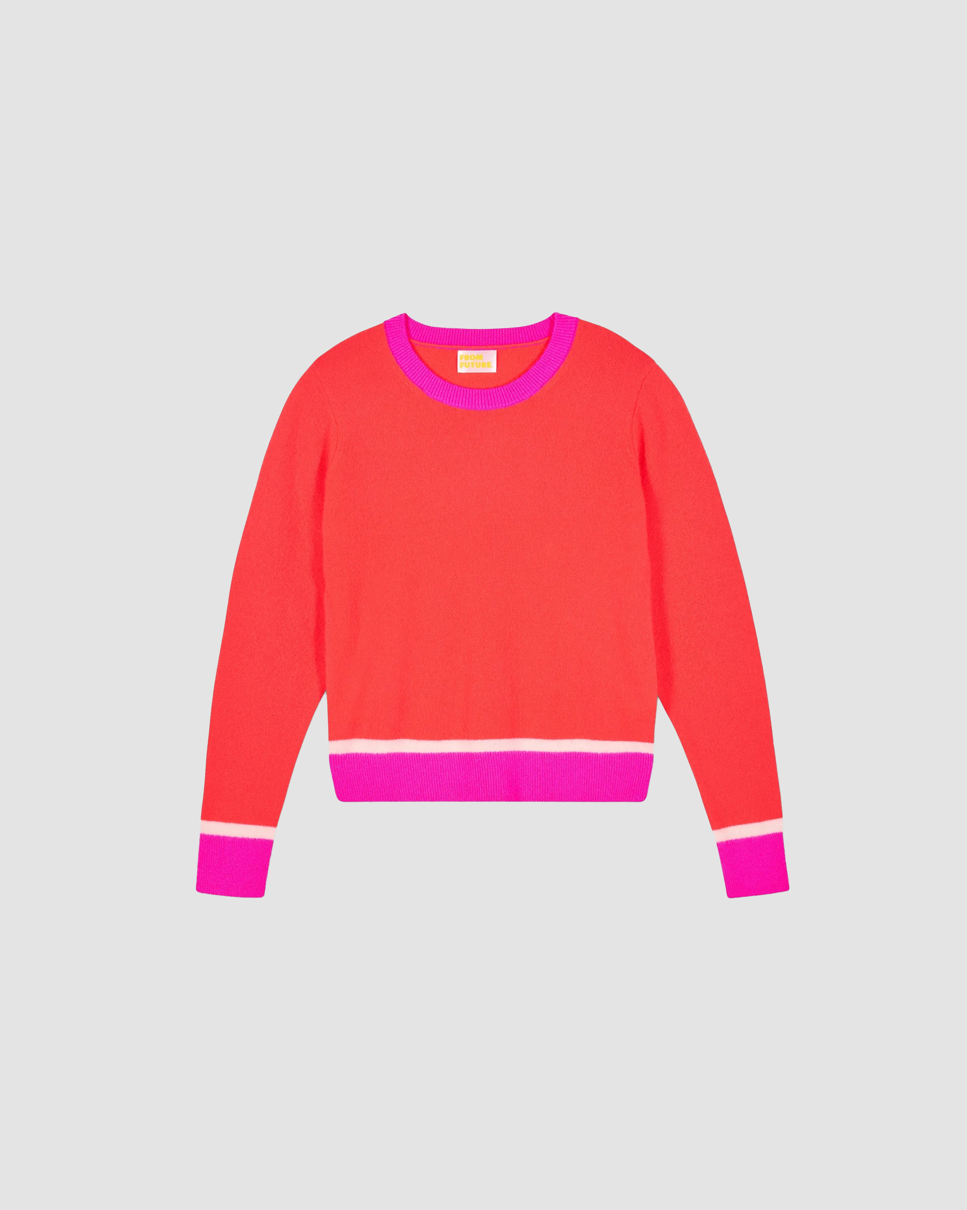 Měkký a lehký krátký svetr z kašmíru s kulatým výstřihem a dlouhými rukávy. Dvoubarevné žebrované lemy dodávají outfitu hravý nádech. Skvěle se kombinuje s oblíbenými džínami nebo splývavou sukní pro univerzální vzhled.