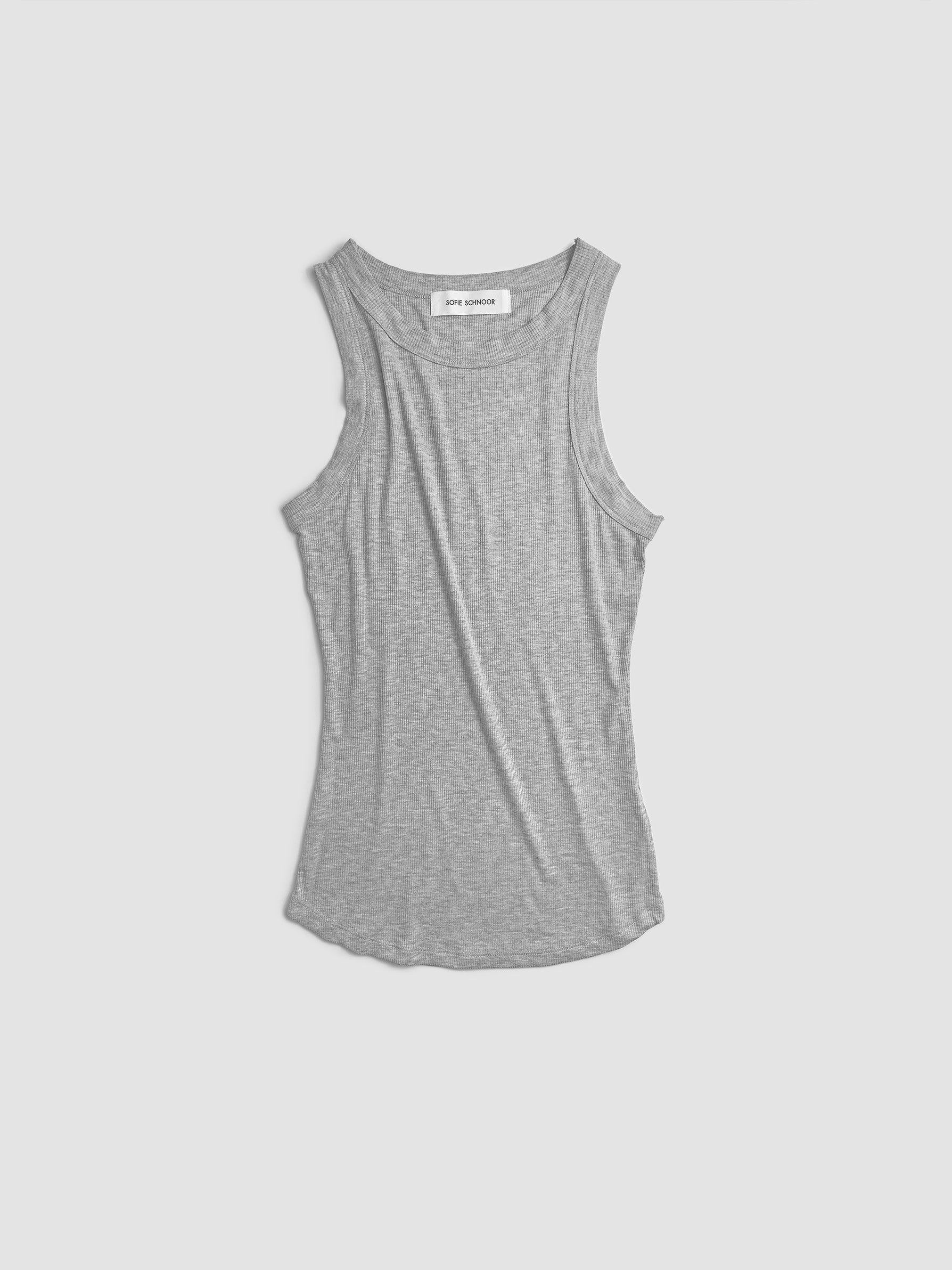 Základní top v šedé barvě s vysokým výstřihem, úzký střih.