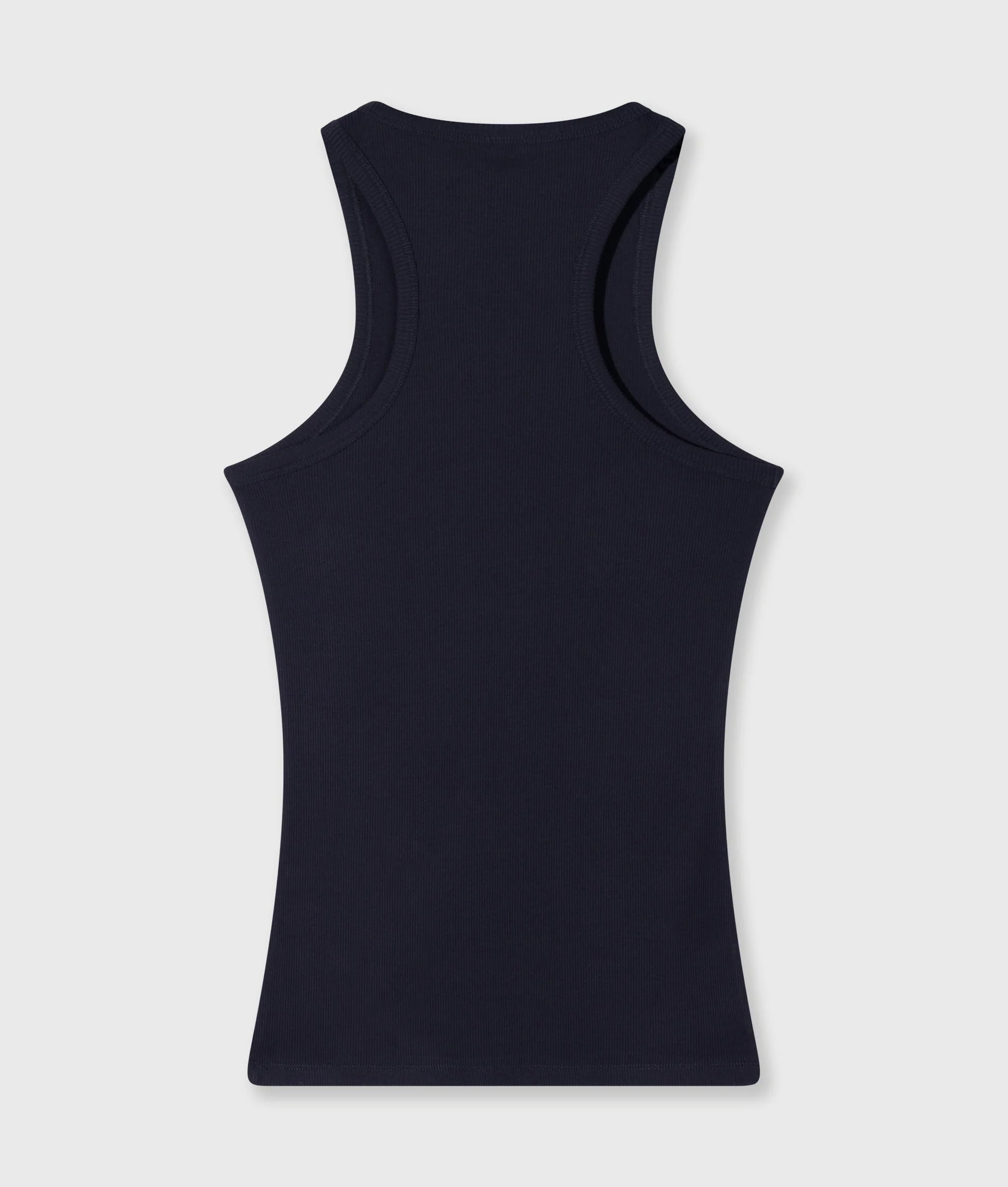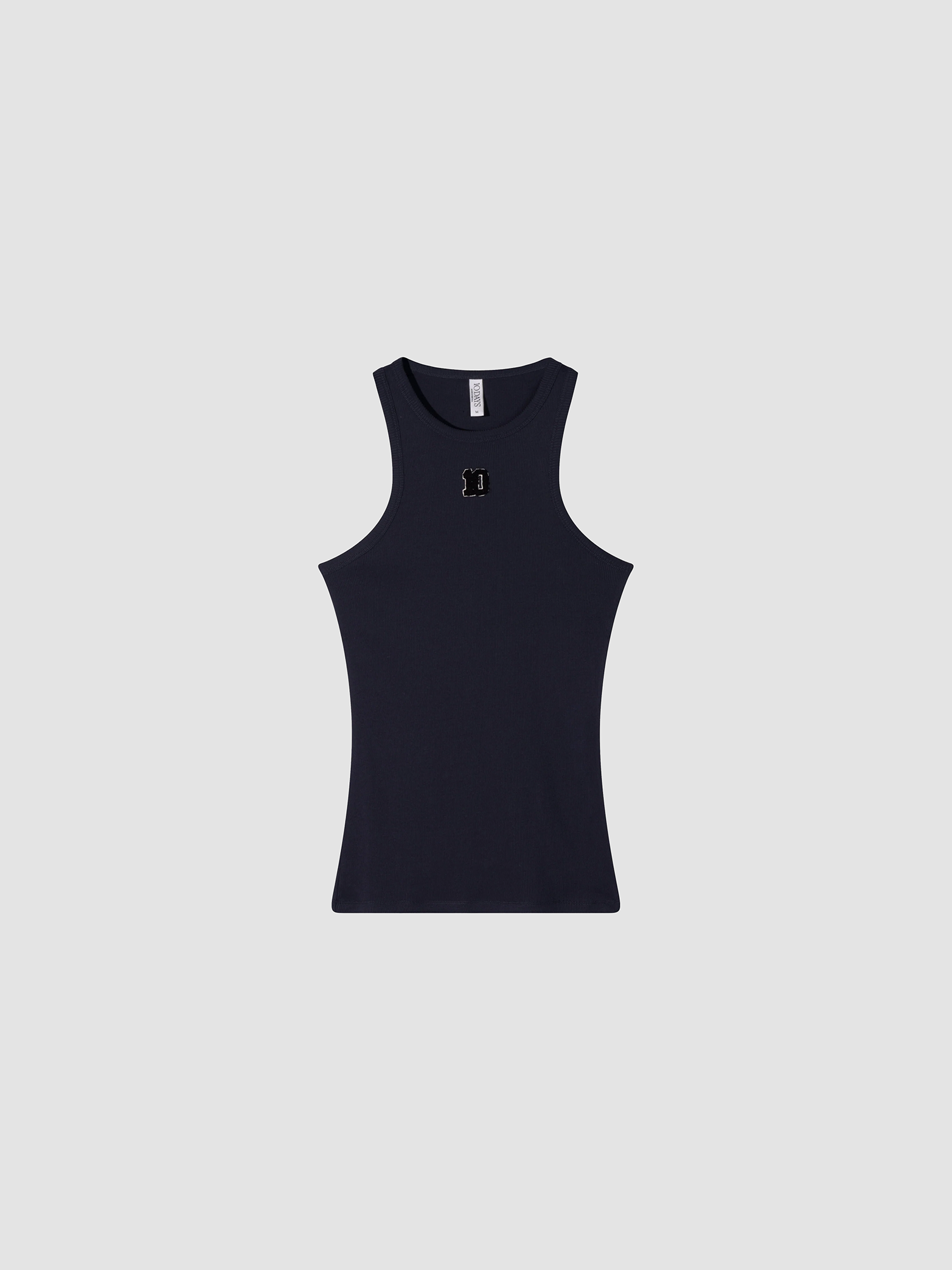 Tílko slim střihu vyrobené z organické bavlny s certifikací GOTS. S černou miniaturní nášivkou „10“ na hrudi a žebrovanými lemy kolem výstřihu a průramků.