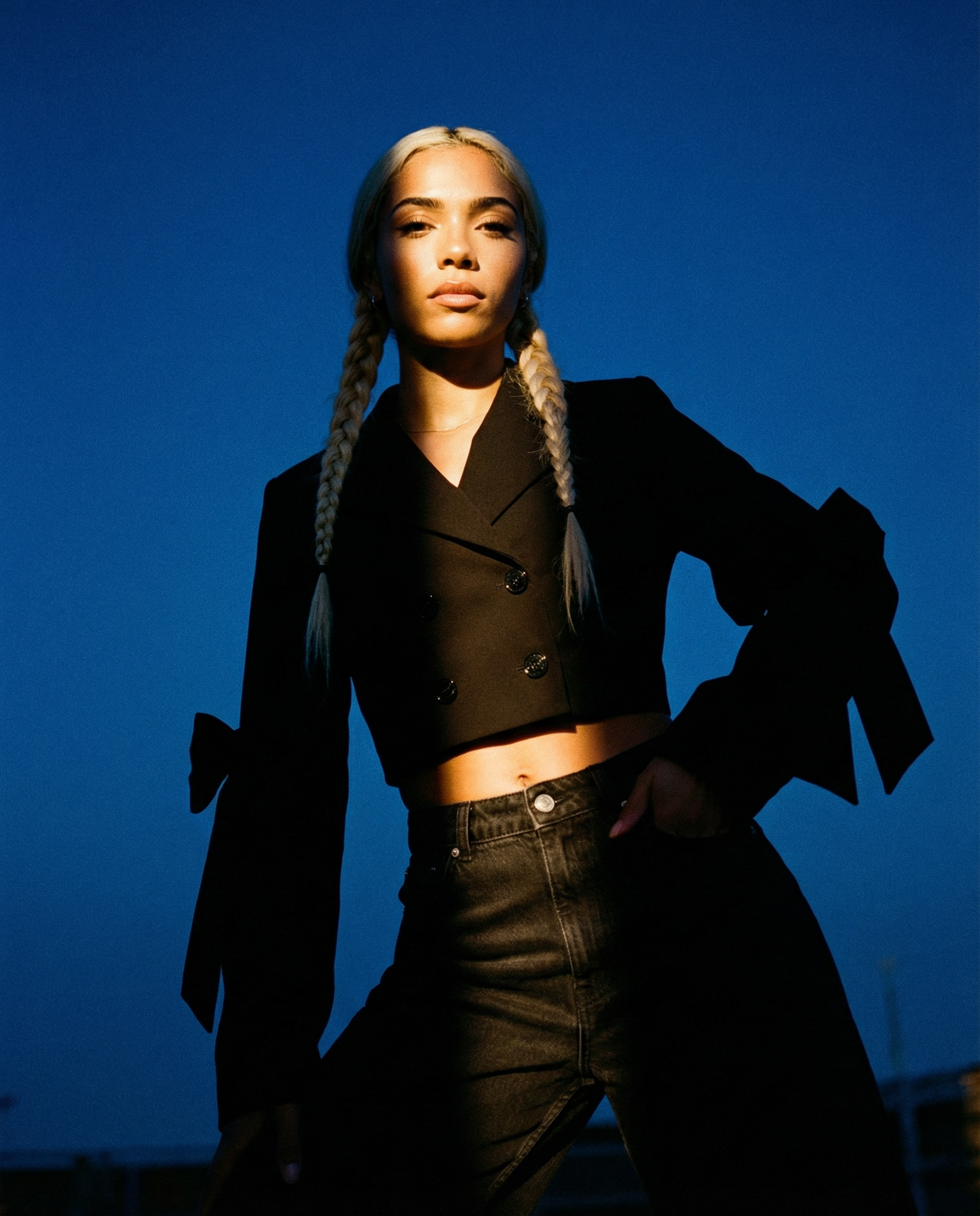 This blazer is a double-breasted piece cut to a cropped silhouette with bow details on both sleeves.