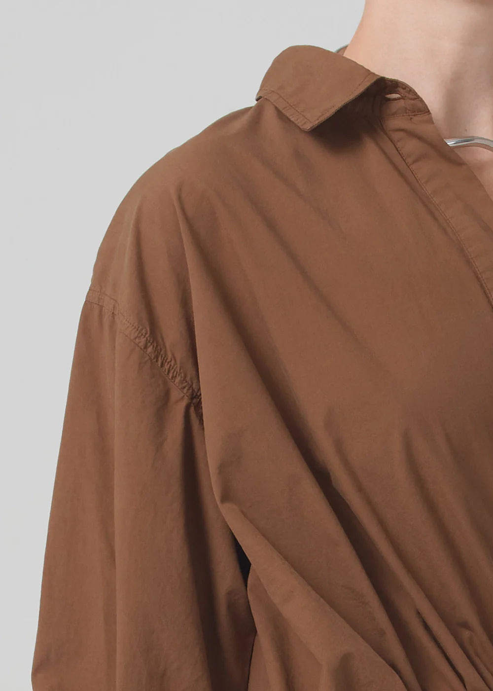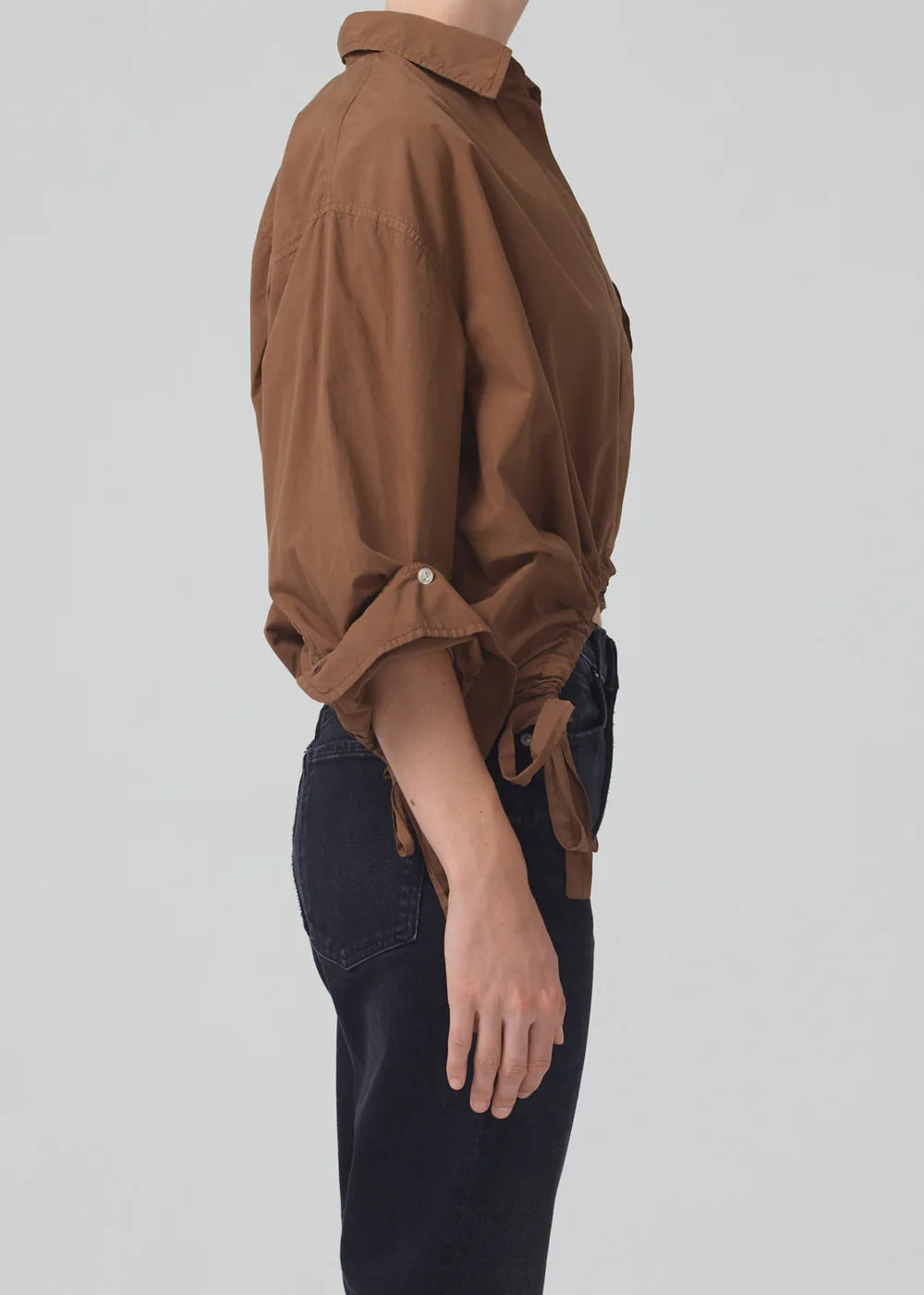 A new take on classic shirting. The Alexandra top features a cropped fit and cinched ties at the side.
