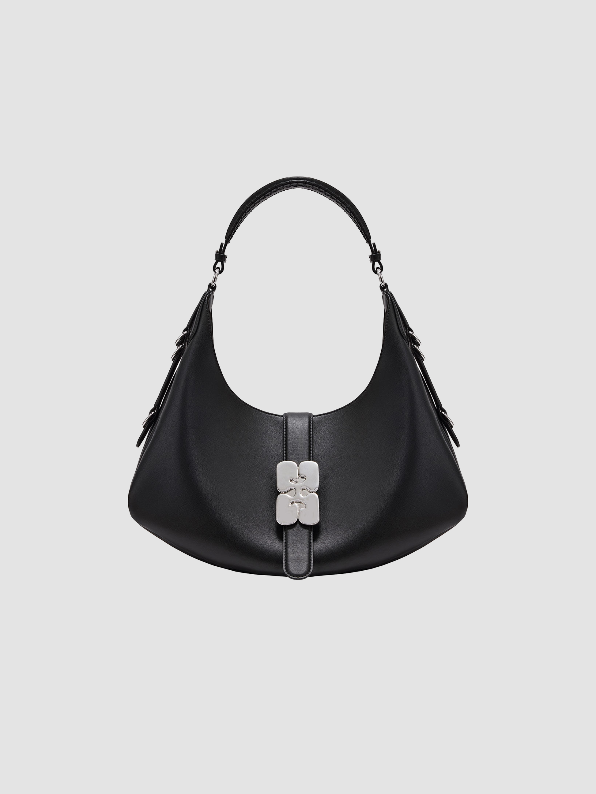 This bag features a accordian-style silhouette, a shoulder strap and D-ring detailing at the side. The bag has a closure tab with the signature GANNI Butterfly clasp in silver-tone, 1 main compartment and an inside open pocket.