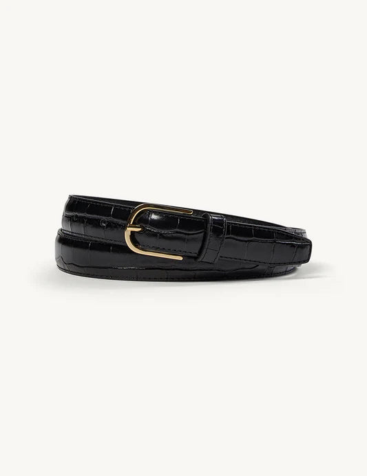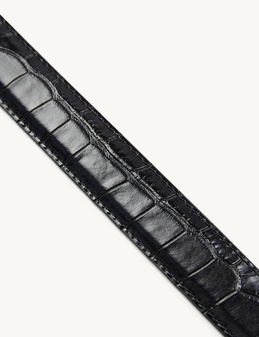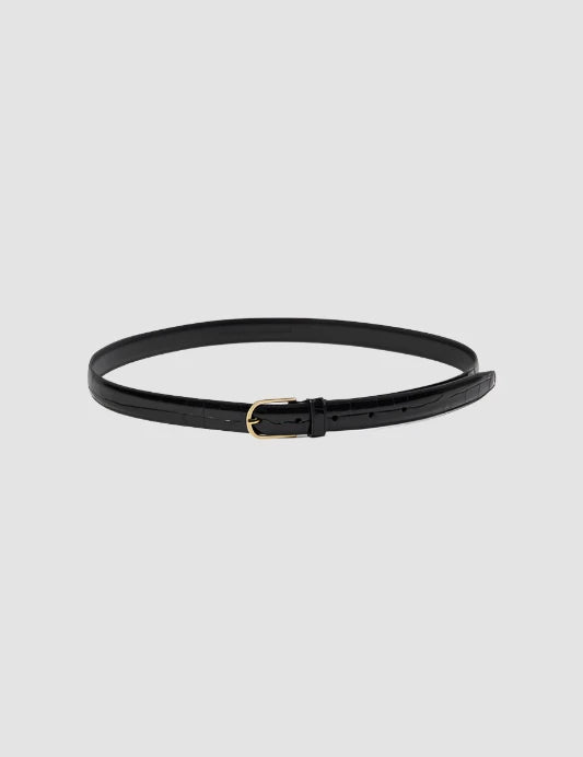 THE KAJA BELT IS A TIMELESS WARDROBE ESSENTIAL, FEATURING A CLASSIC SLIM SILHOUETTE IN BLACK WITH A CROC PATTERN, CRAFTED FROM 100% CALF LEATHER. FINISHED WITH SUBTLE SOPHISTICATION, IT FEATURES OUR ENGRAVED THE . GARMENT LOGO ON THE TOP SIDE OF THE BUCKLE.