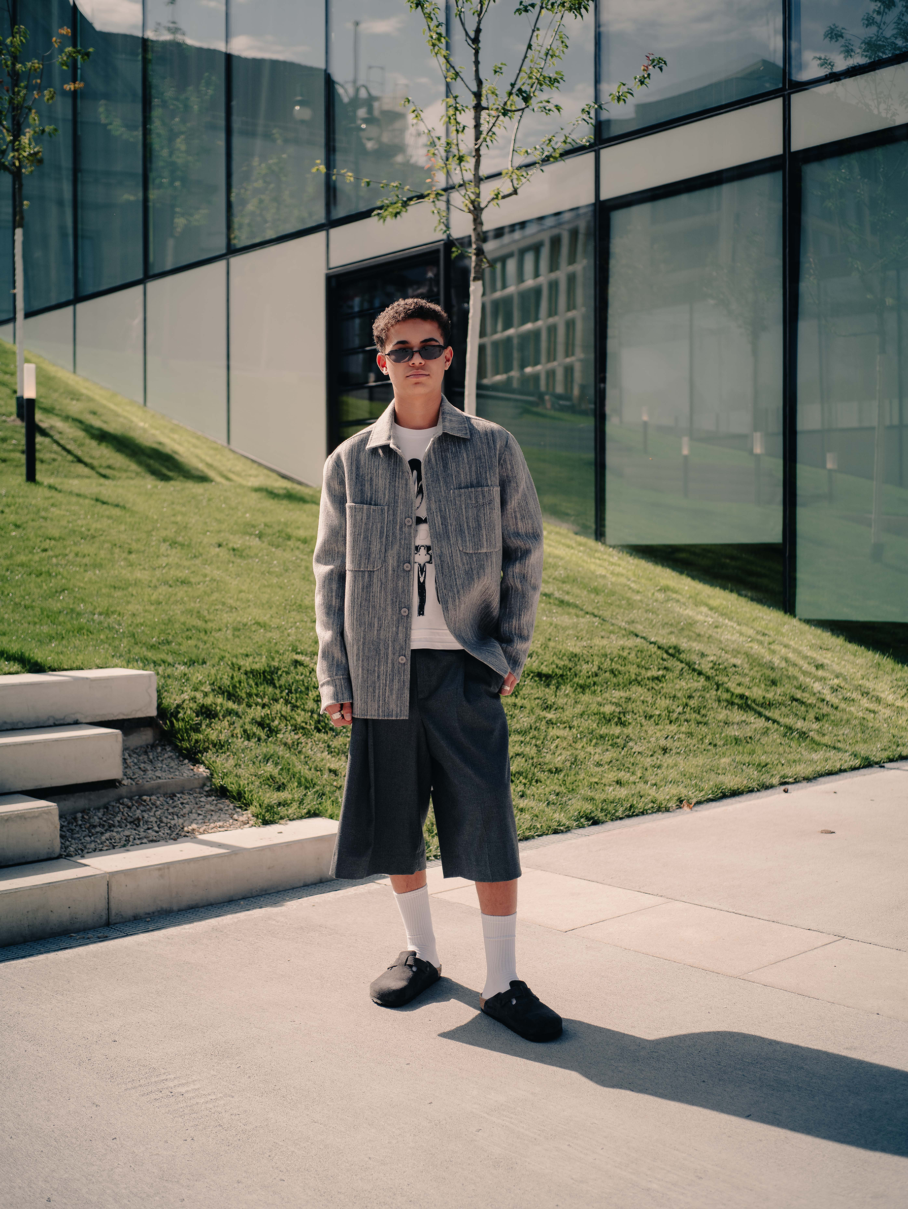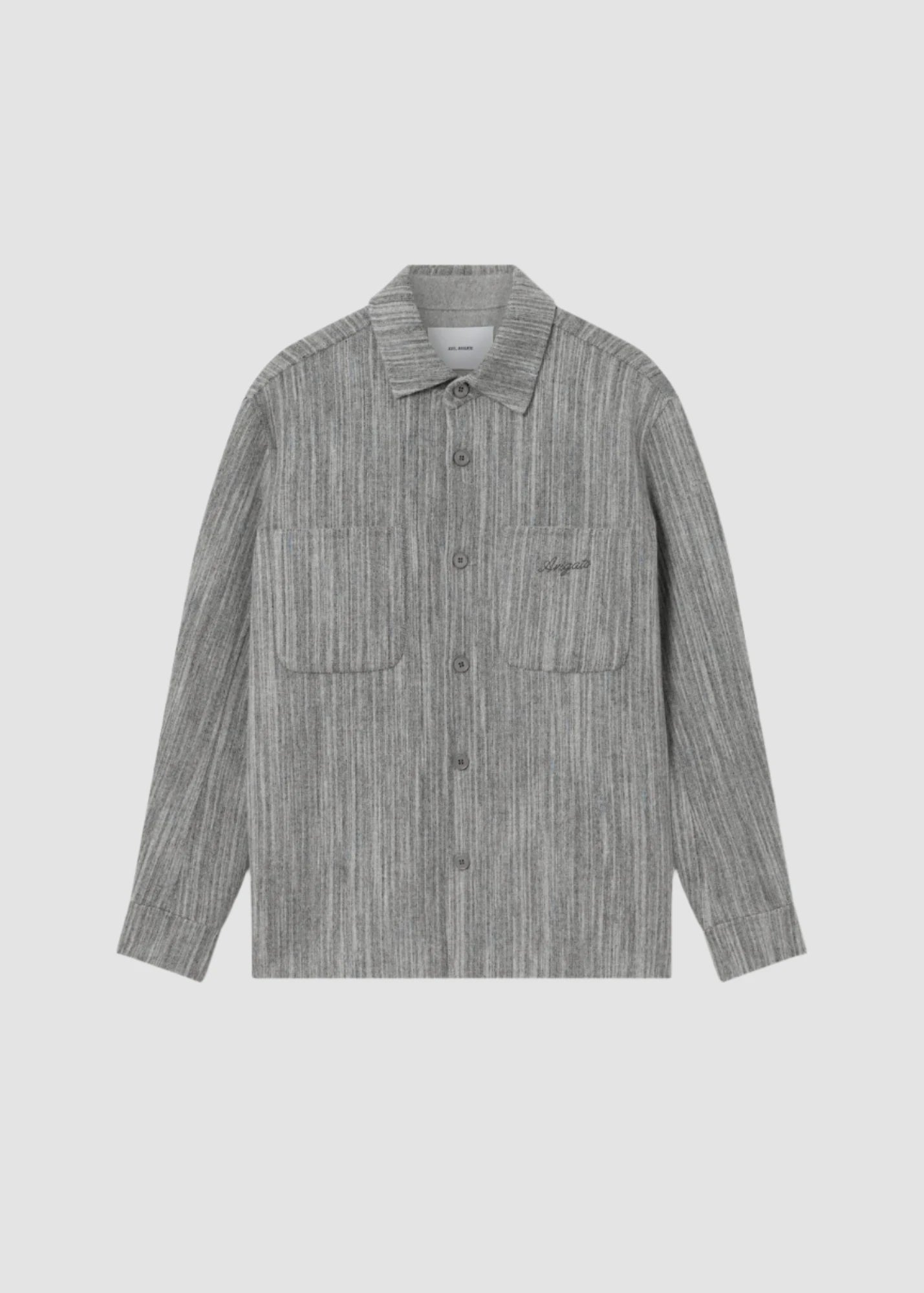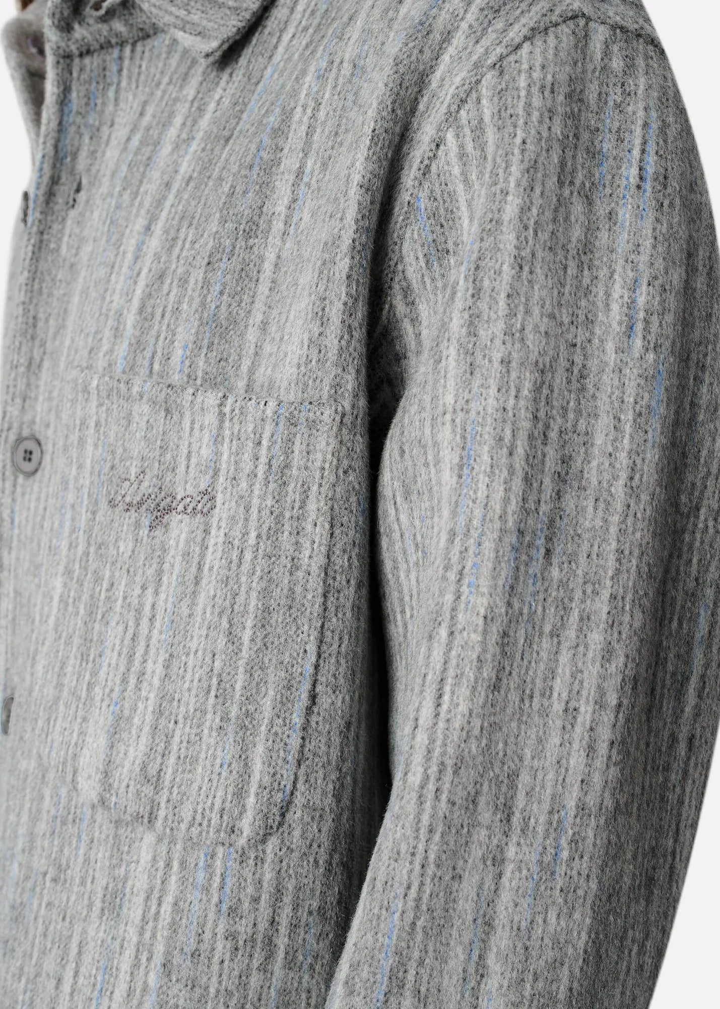The Aidan shirt is cut from a double-faced wool-blend with a striped finish. ‘Arigato’ embroidery details the chest pock.