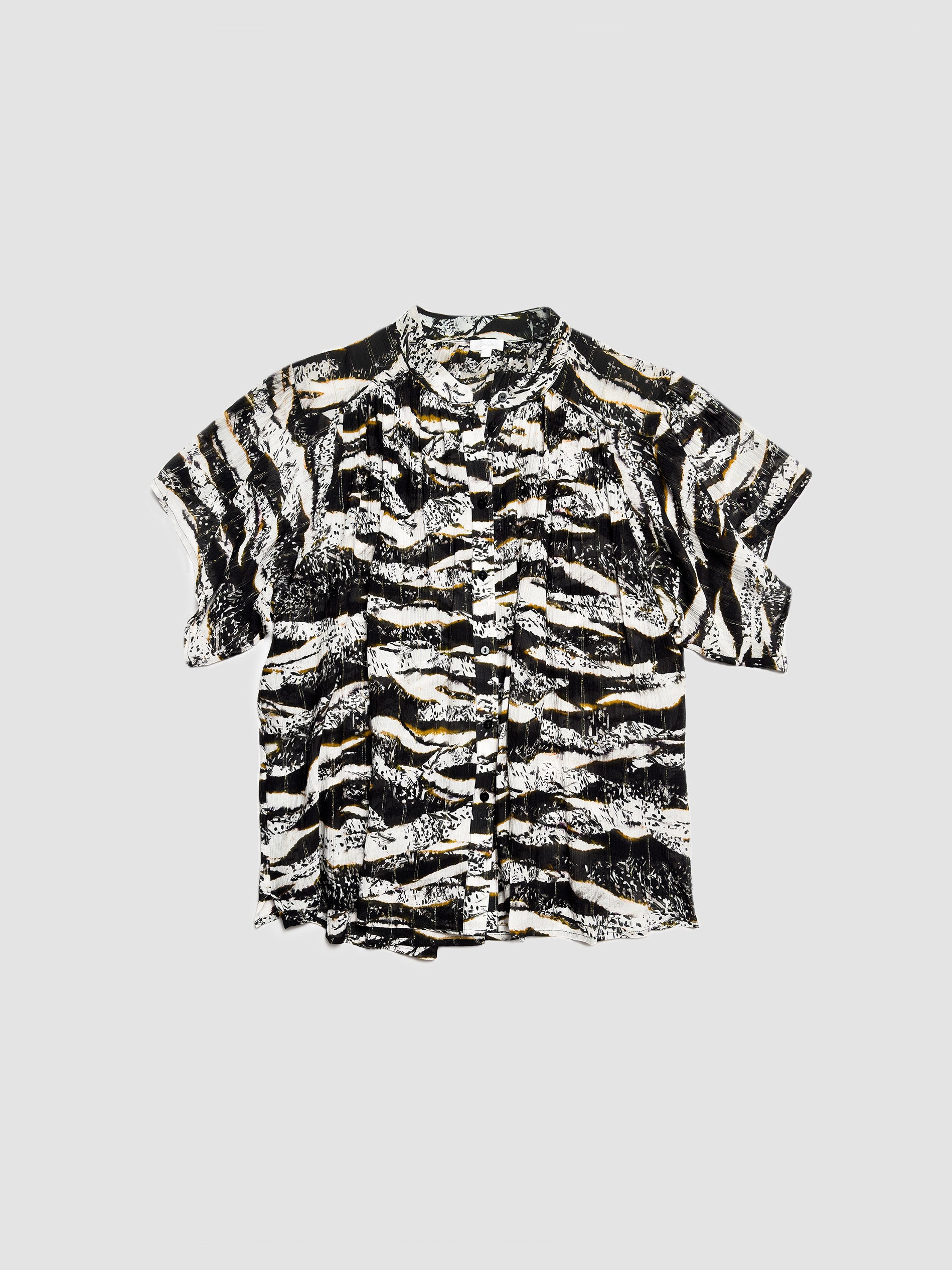 Baylen is a feminine, ultra-light blouse. Black and white tones and warm naturals blend into a vivid zebra wave pattern with delicate lurex details on the soft viscose fabric.