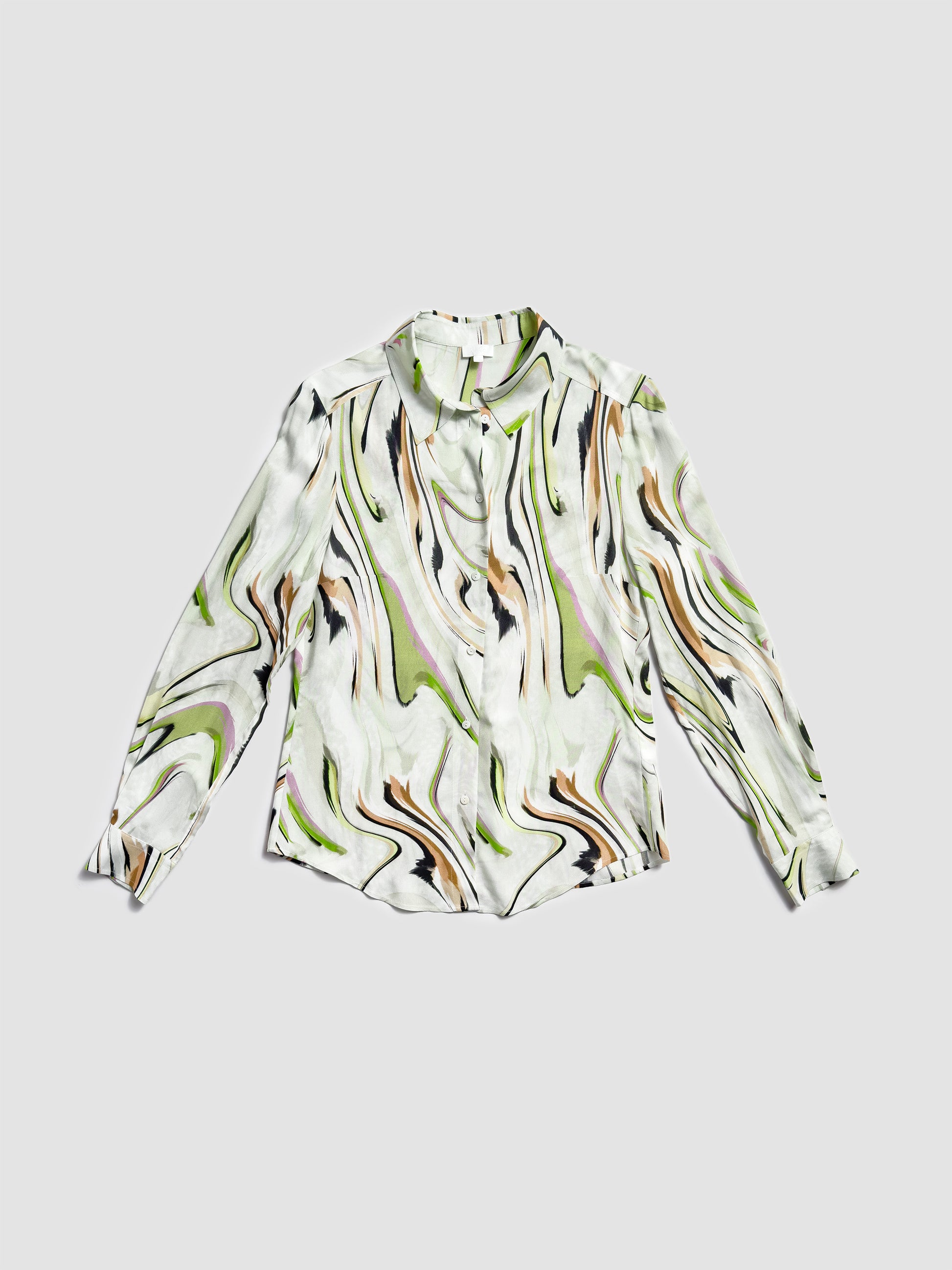 We love the flowy viscose material and swirly marble wave print of this easygoing shirt blouse. Byka pairs wonderfully with Pants Perla to create a cool pyjama look.