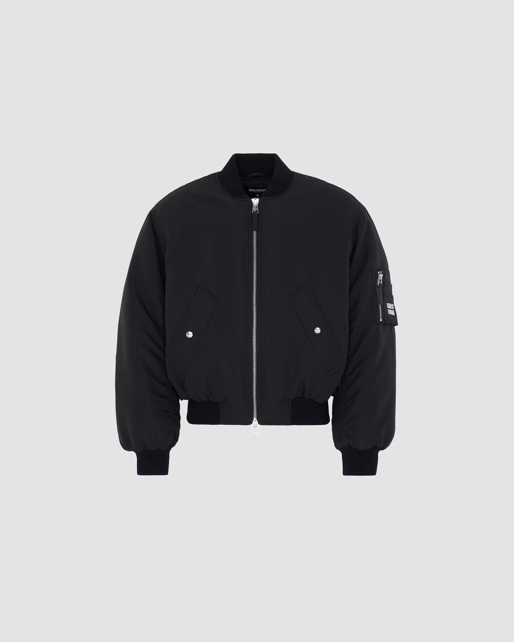 A classic unisex bomber jacket with a timeless cut, perfect for everyday wear. Features a WB press-stud fastening, a metal appliqué detail, and a sleeve pocket with zip closure for added functionality and style.
