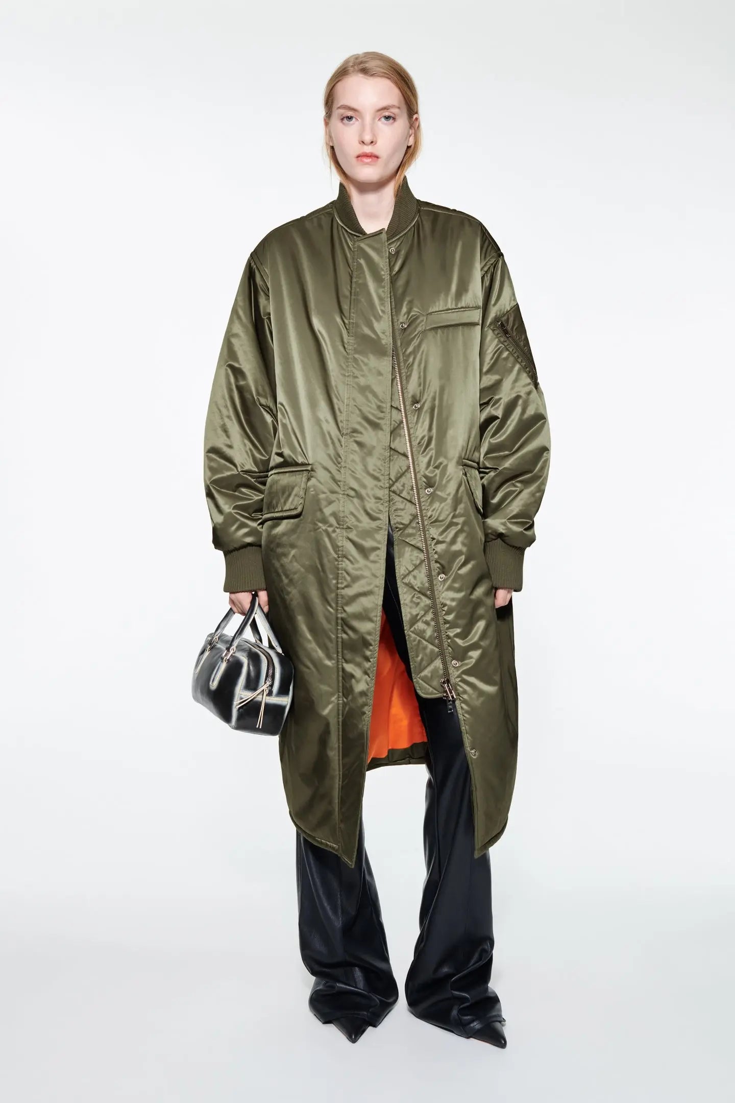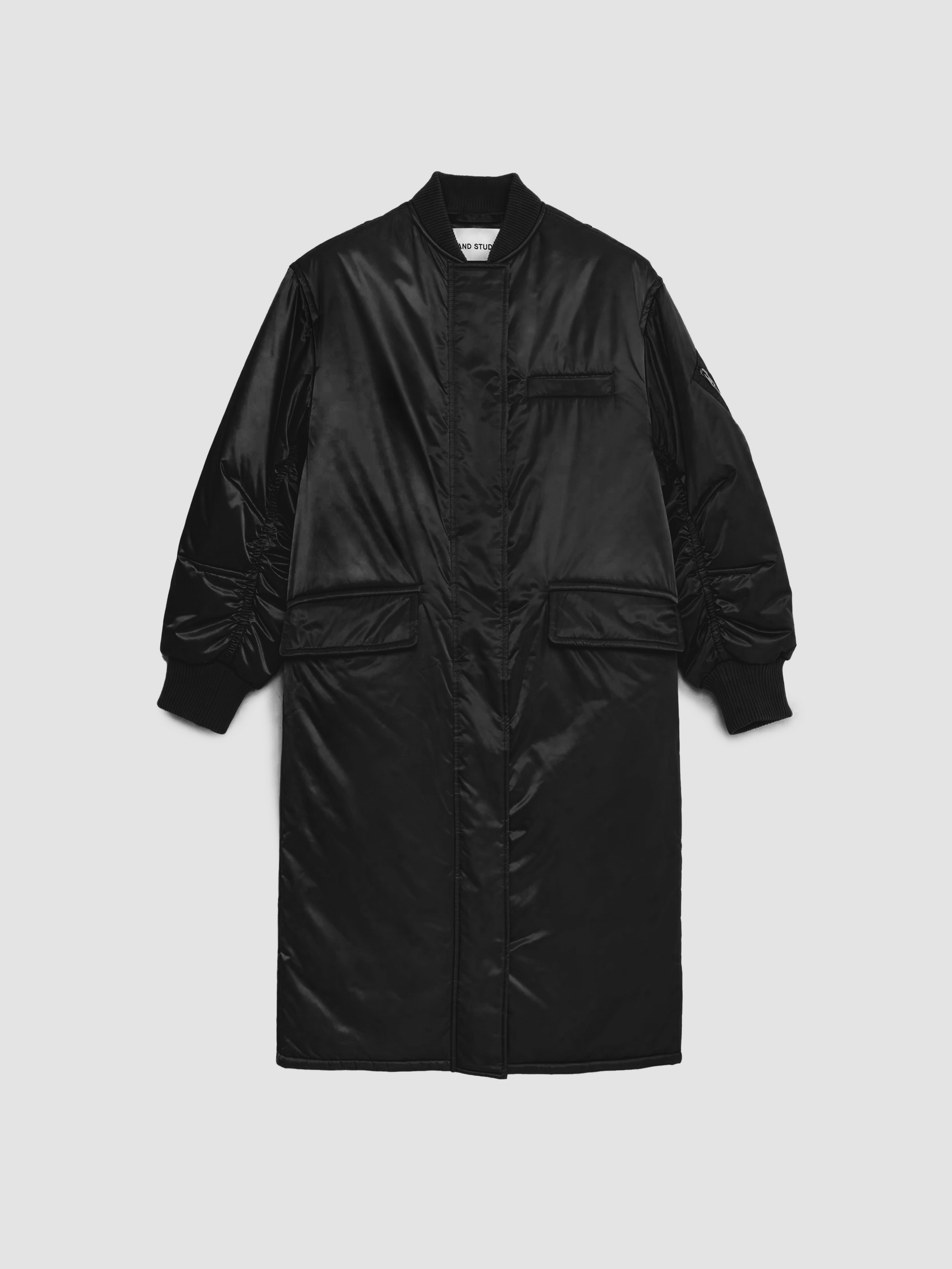 Abbie is a longline bomber jacket filled with recycled down and cut to an oversized, cocoon-shaped silhouette. Details include neck- and cuff ribbings and a sleeve patch pocket with zip closure.