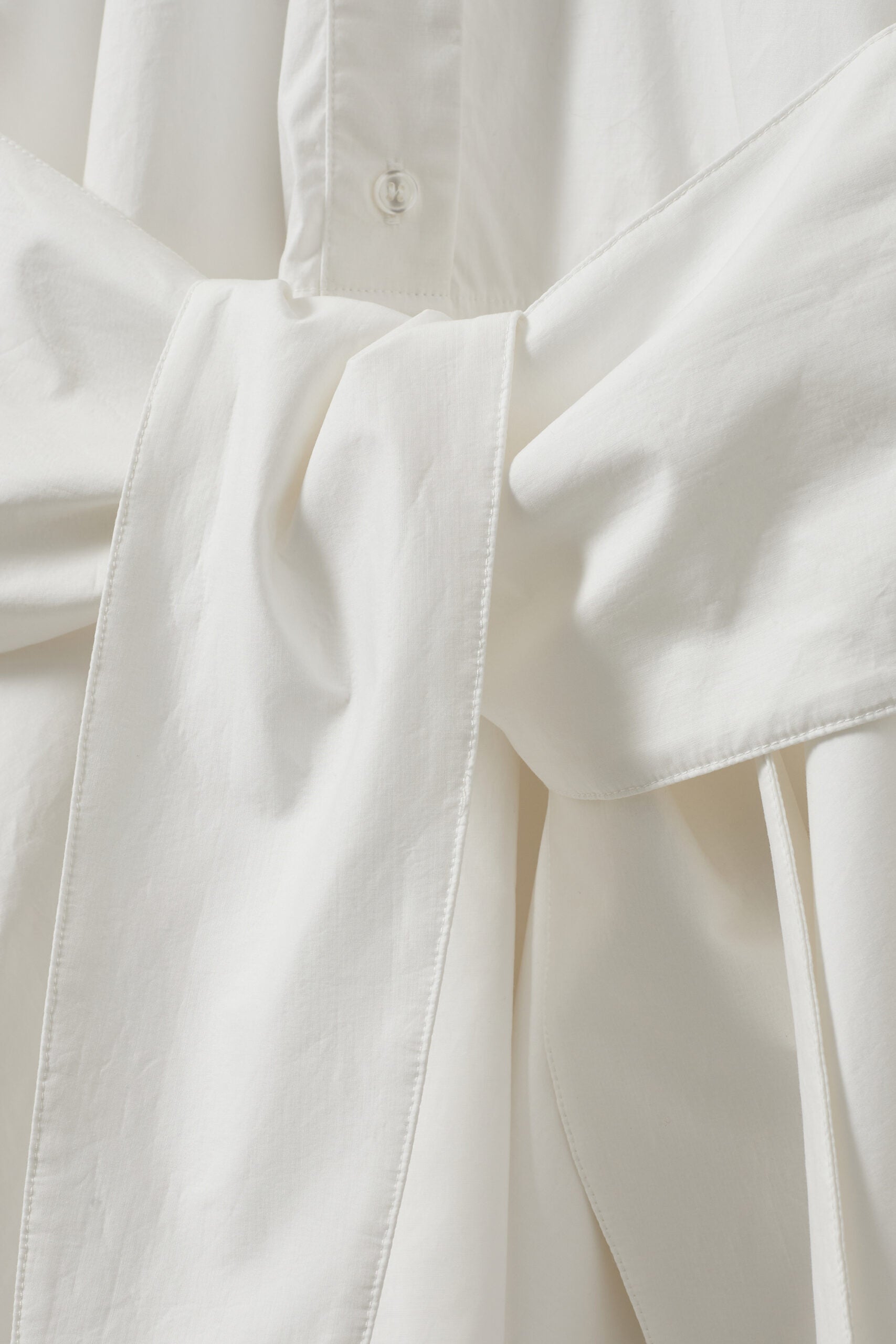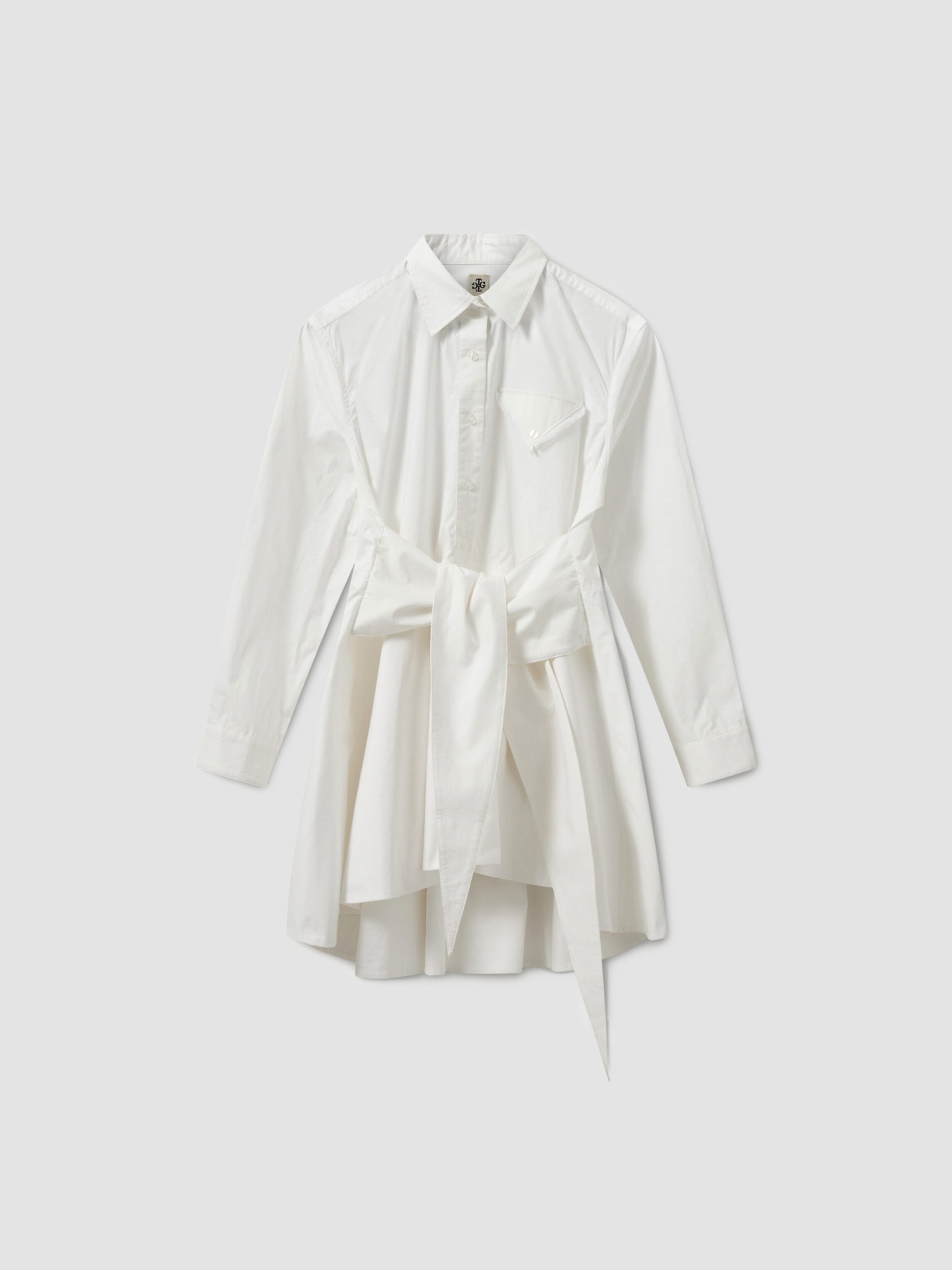 The Cyprus Pocket Dress is a loose-fitting white dress made from 98% organic cotton. It features an integrated belt detail around the waist, adding a tailored touch to its relaxed silhouette.