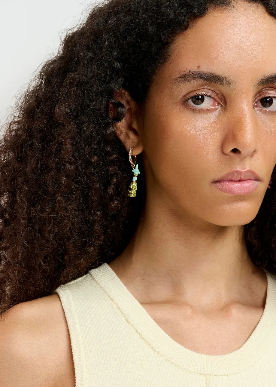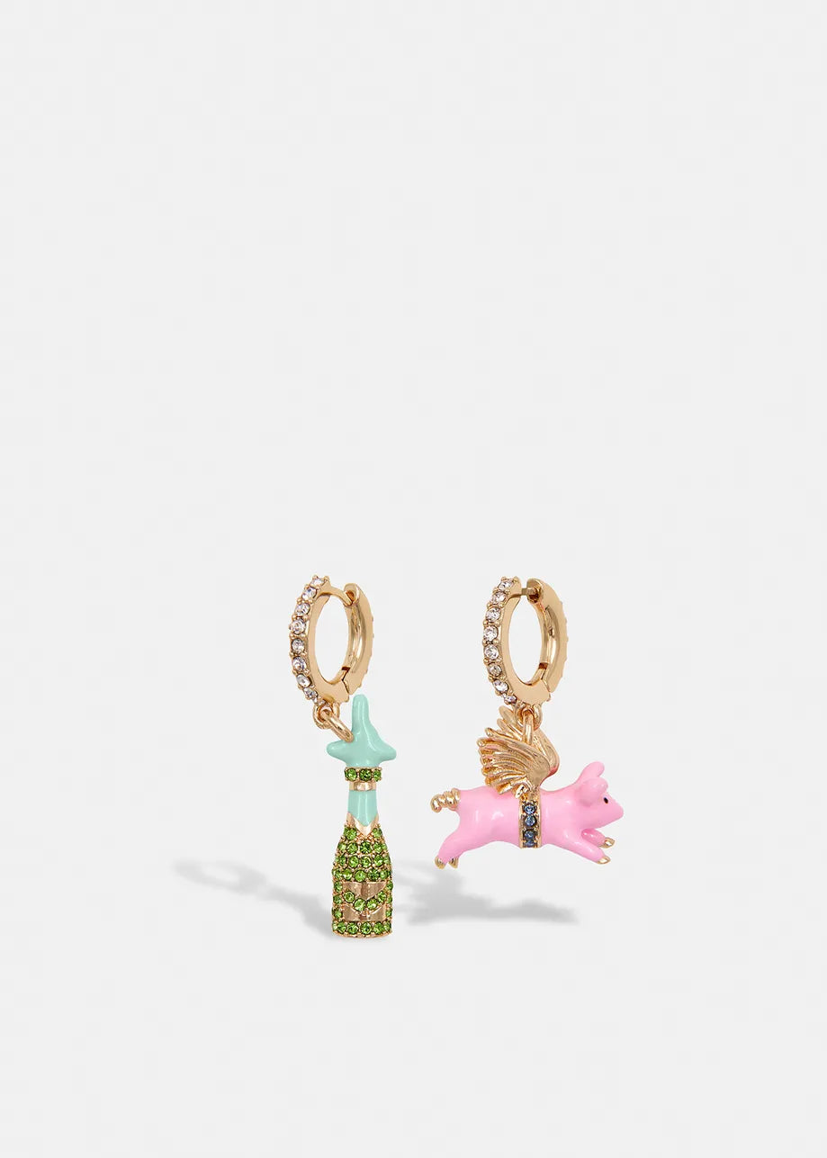 Let your outfit soar to new heights. This mismatched pair of small hoop earrings is strung with a rhinestone-encrusted champagne bottle and an enamel flying pig-shaped pendant.