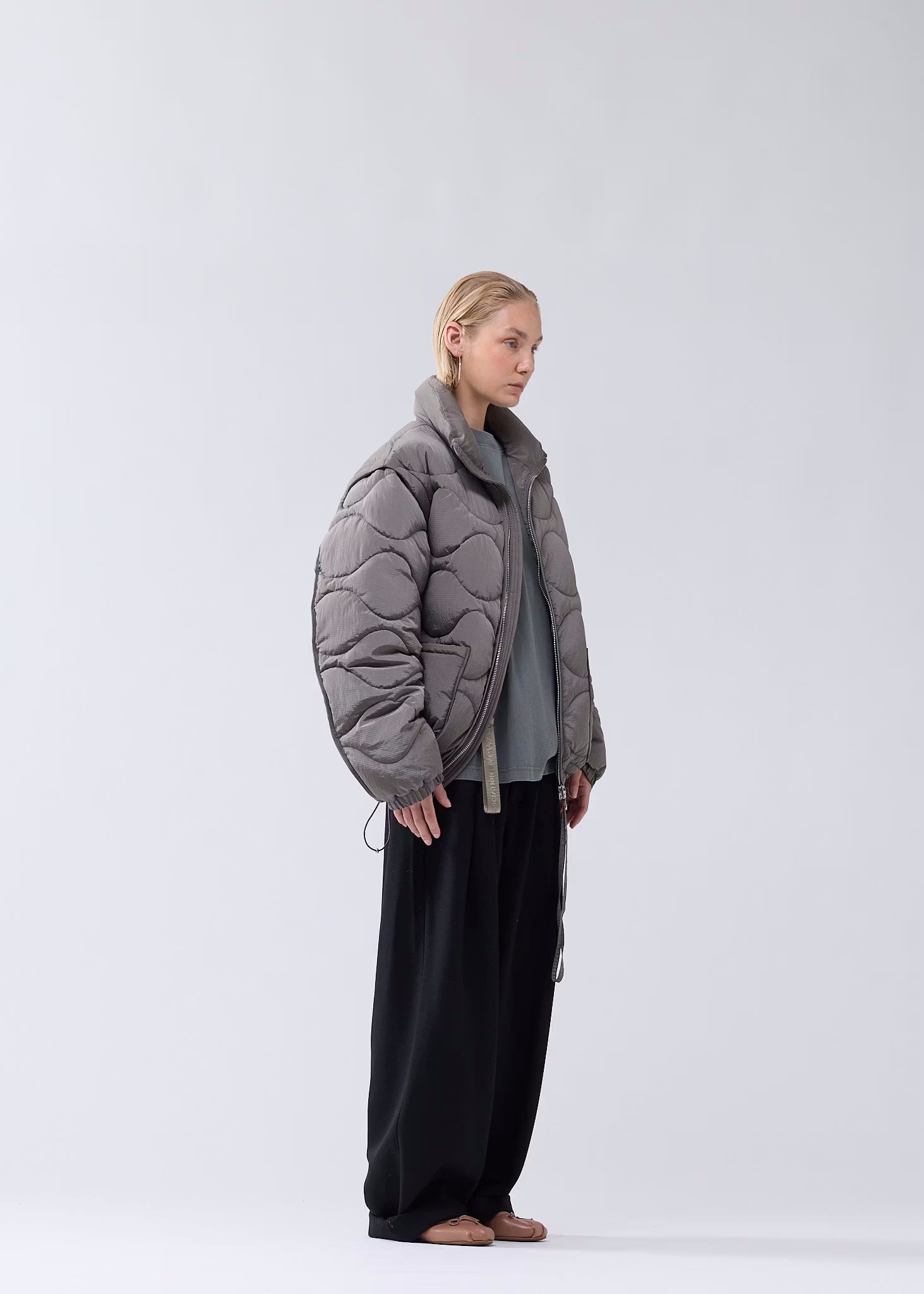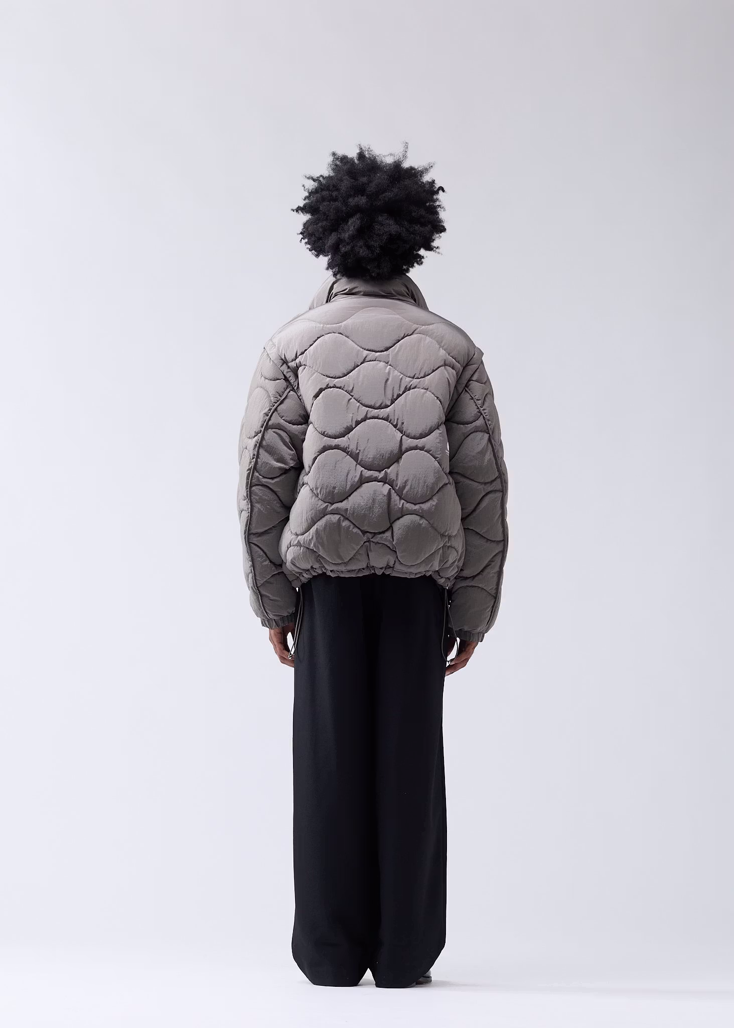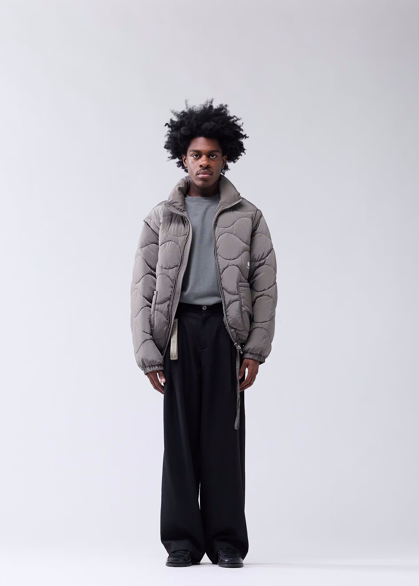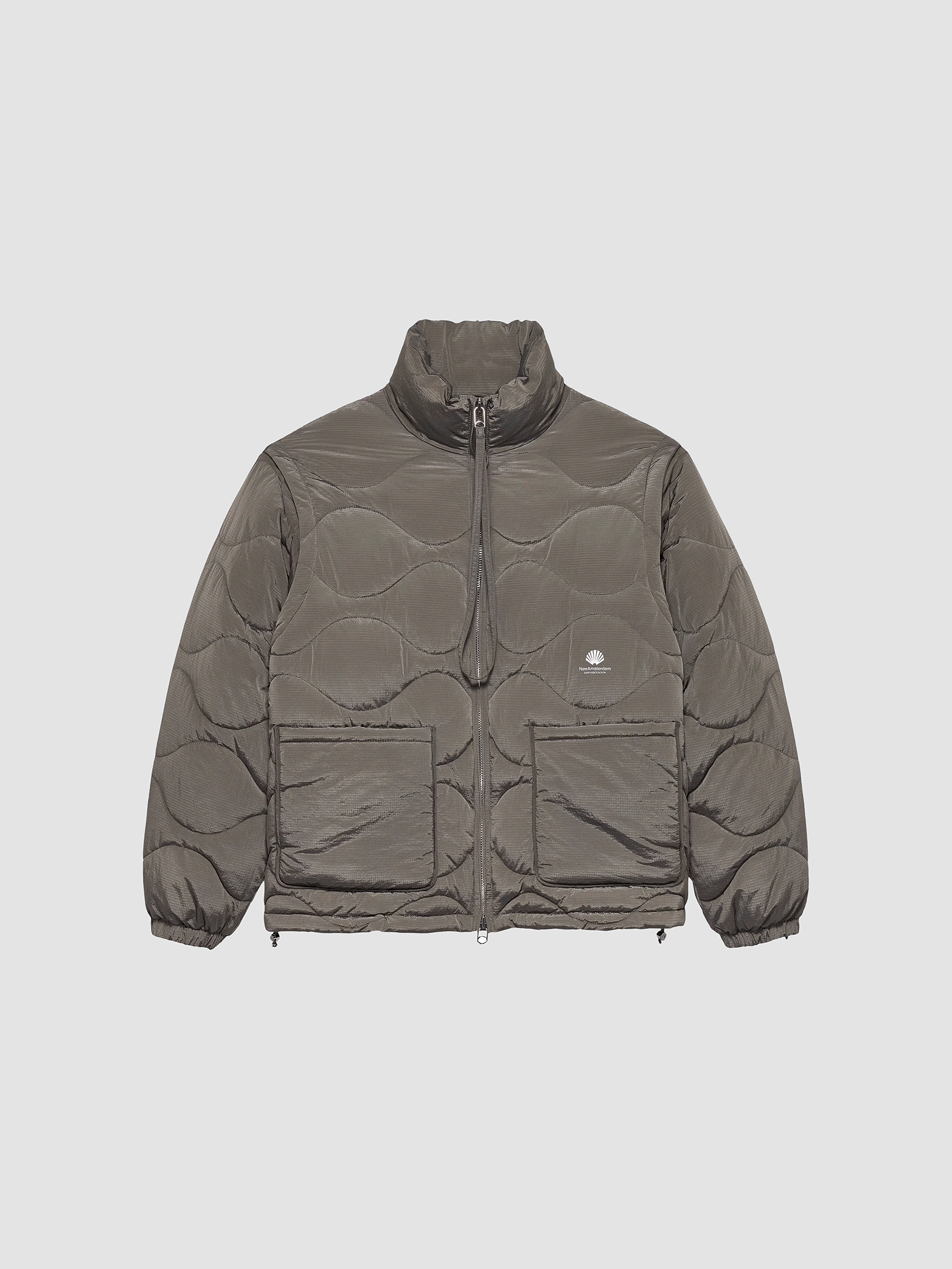 This jacket is made out of a shiny ripstop nylon. It is styled with a metal double zipper front patch pockets and a classic onion quilt. Front and back of the jacket are branded with a white screenprint logo. The bottom hem contains an elastic drawcord with branded cordstoppers. The jacket has got a regular unisex fit with padded silhouette.