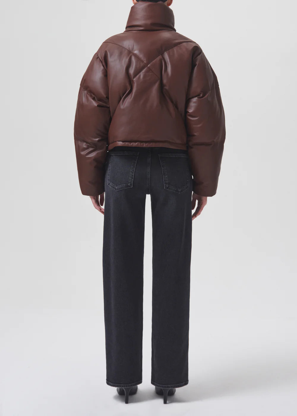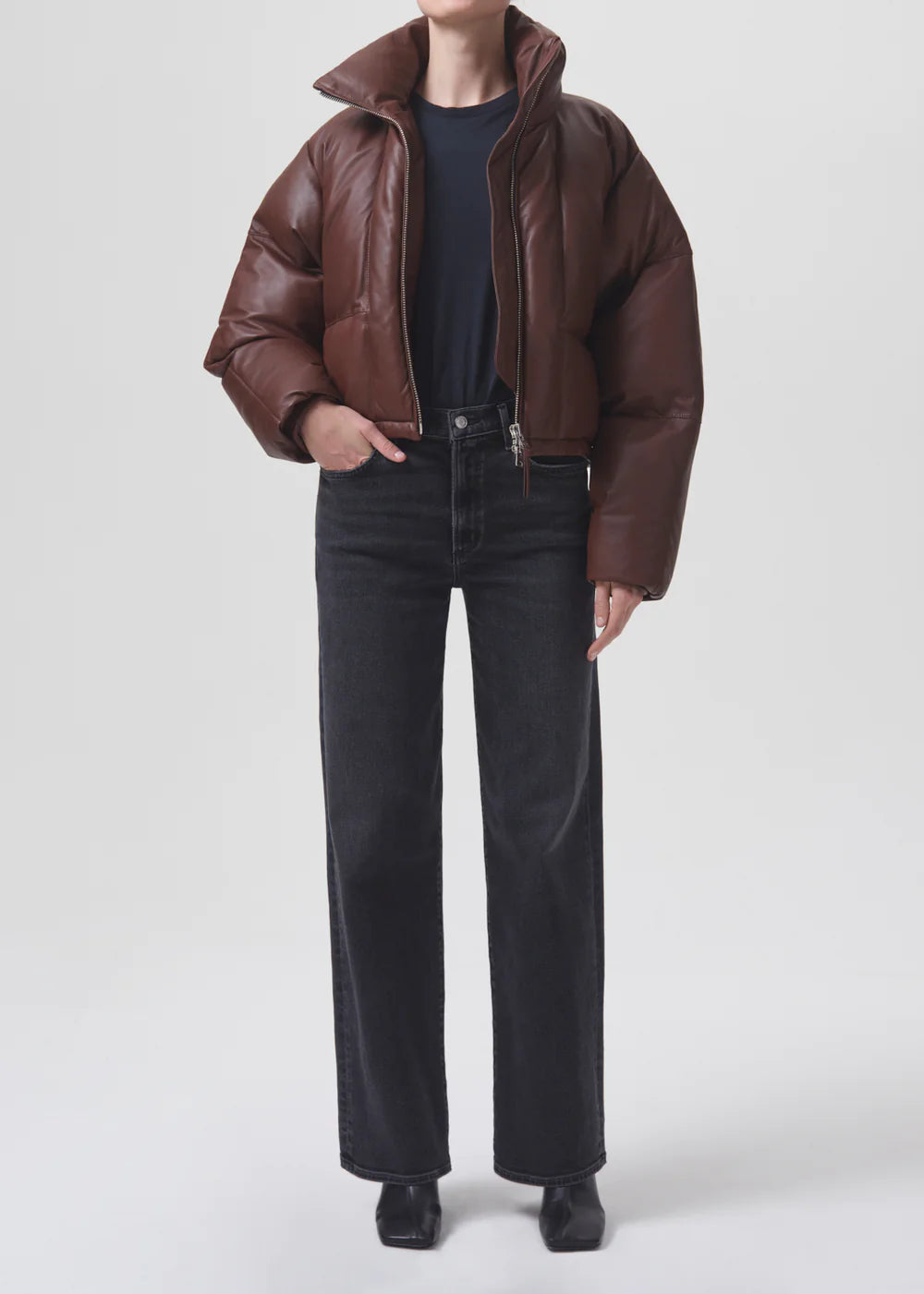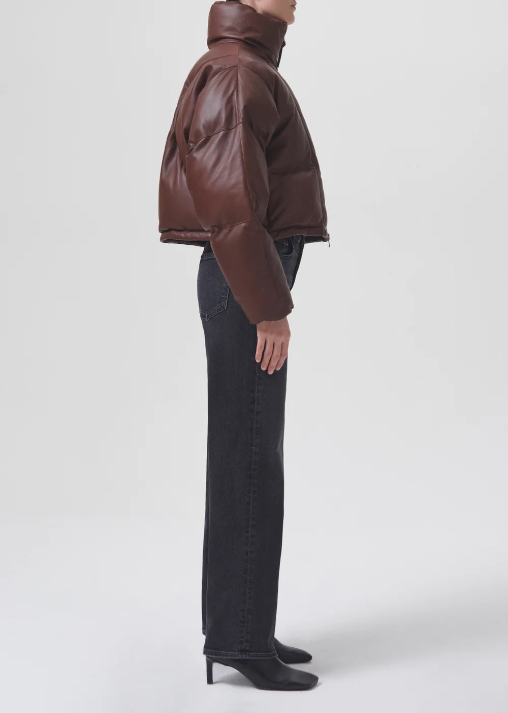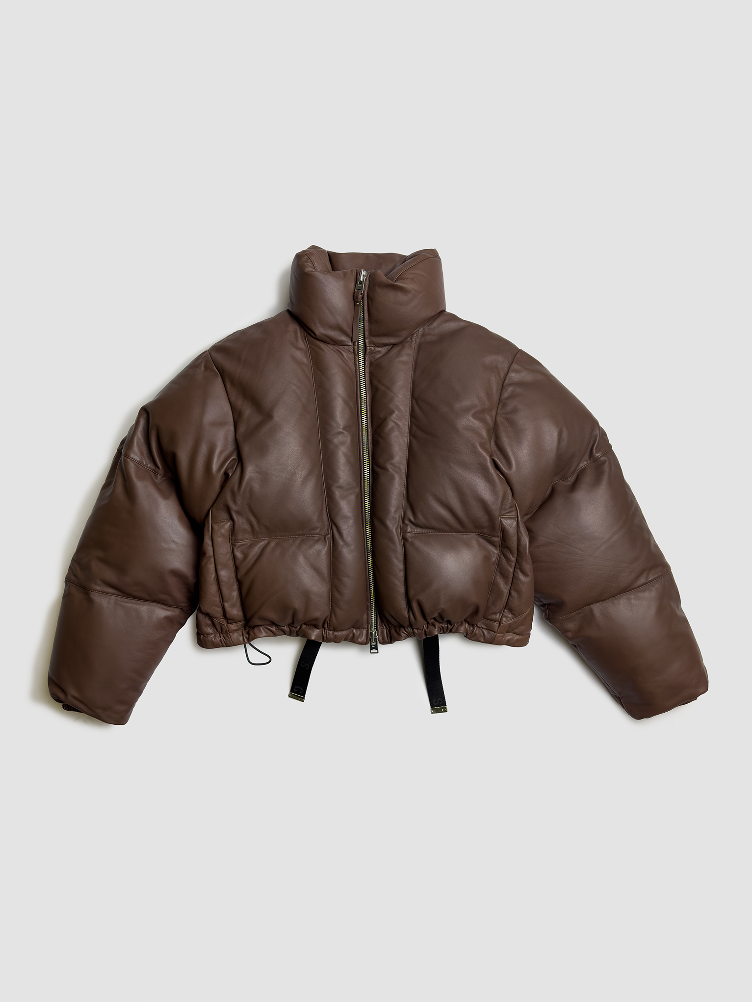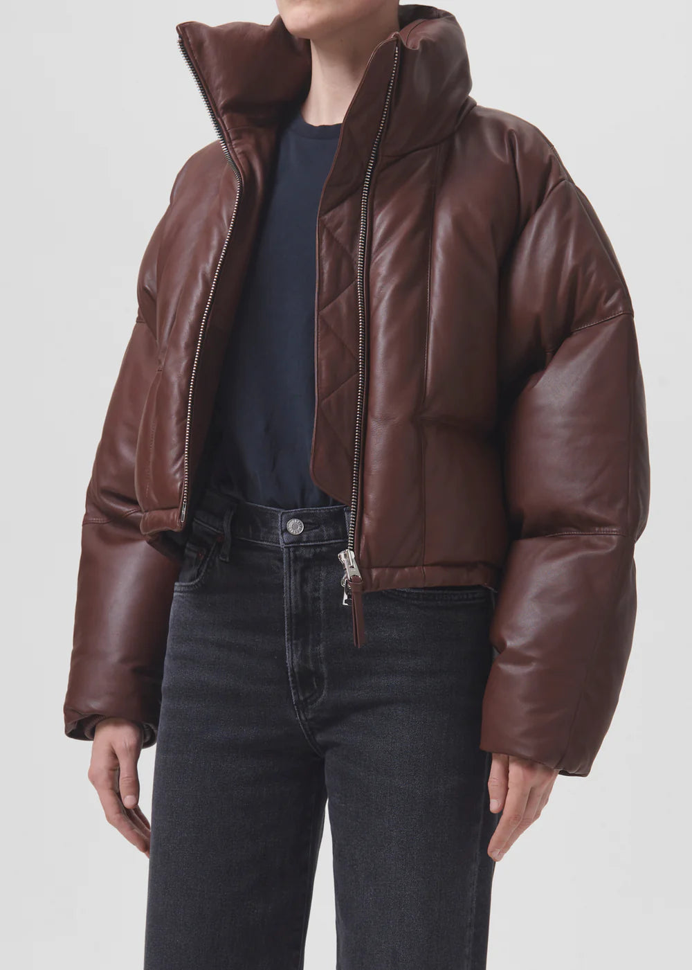 The Edie Puffer is cut from a luxe leather and designed with a cropped silhouette and an exaggerated stand collar, layer yours with a slim long sleeve tee and denim.