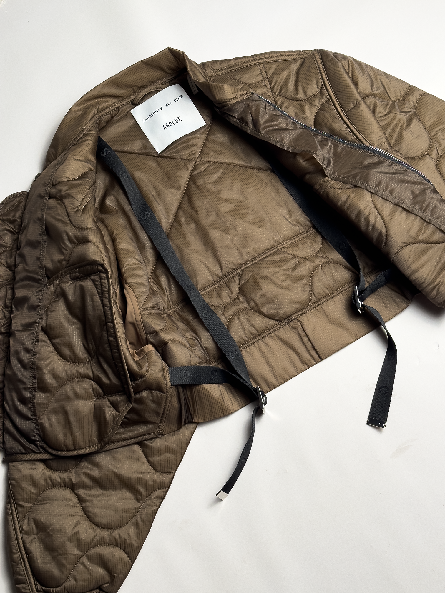 The ultimate layering piece from the West Coast to East London. Iona Quilted Jacket will layer on to your everyday rotation to create a versatile statement silhouette. Crafted from nylon ripstop and lightly quilted with recycled fibers, it’s cut to a bomber-inspired silhouette with voluminous sleeves. Note the internal signature harness, so you can wear off-shoulder or just carry with you if the sun comes back out.