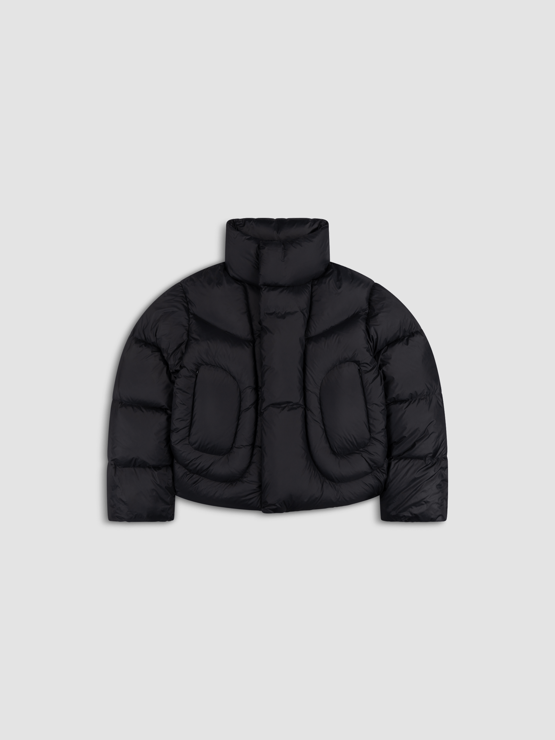 The Puff Puff puffer jacket is crafted from recycled nylon and filled with repurposed down. Its oversized silhouette features a branded zipper and concealed pockets.