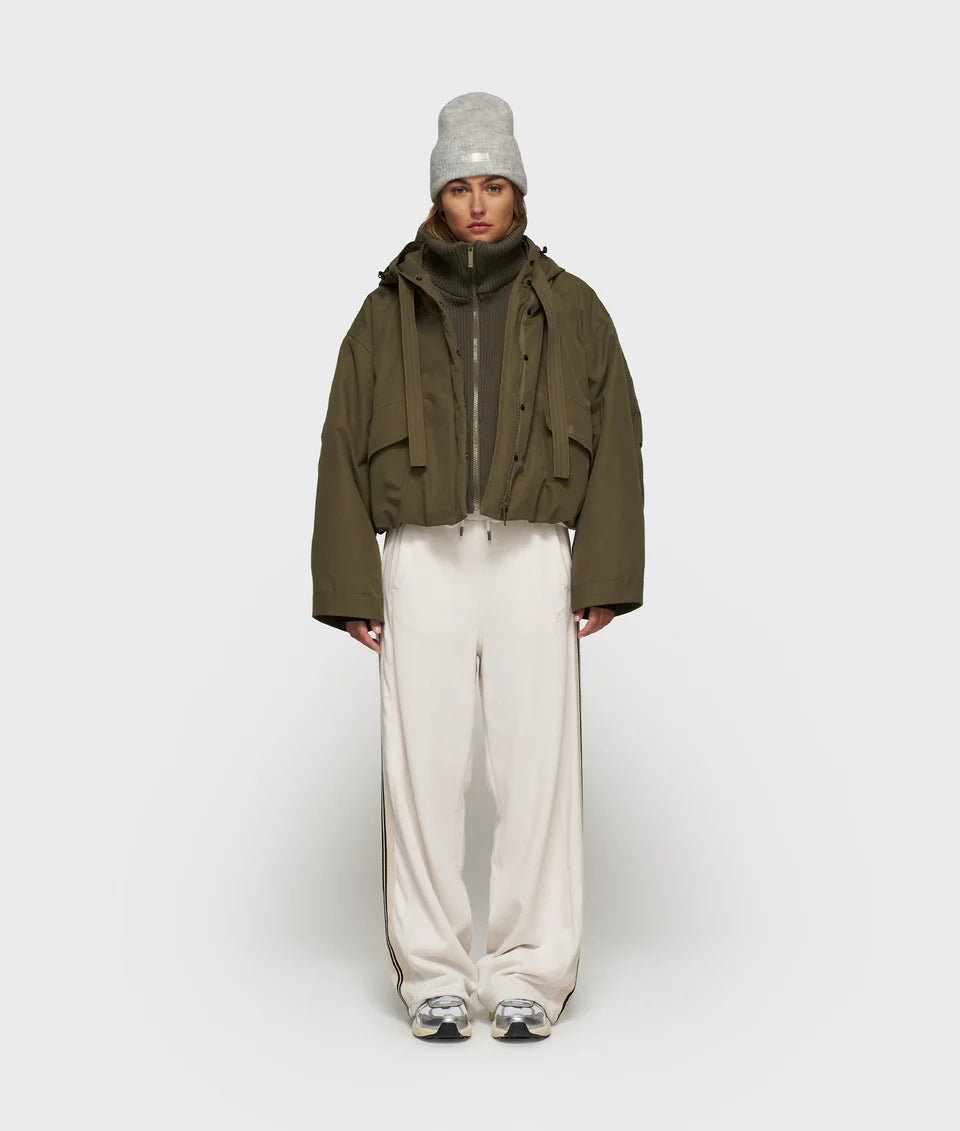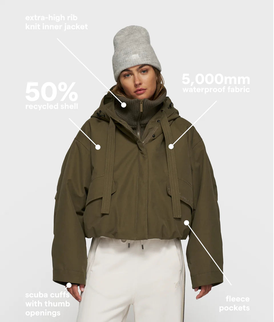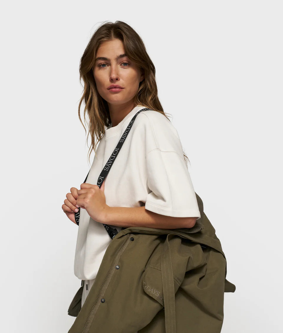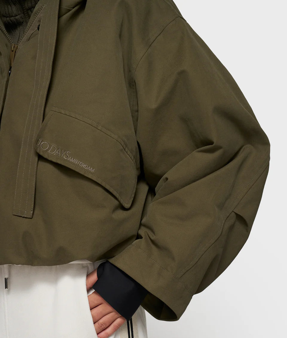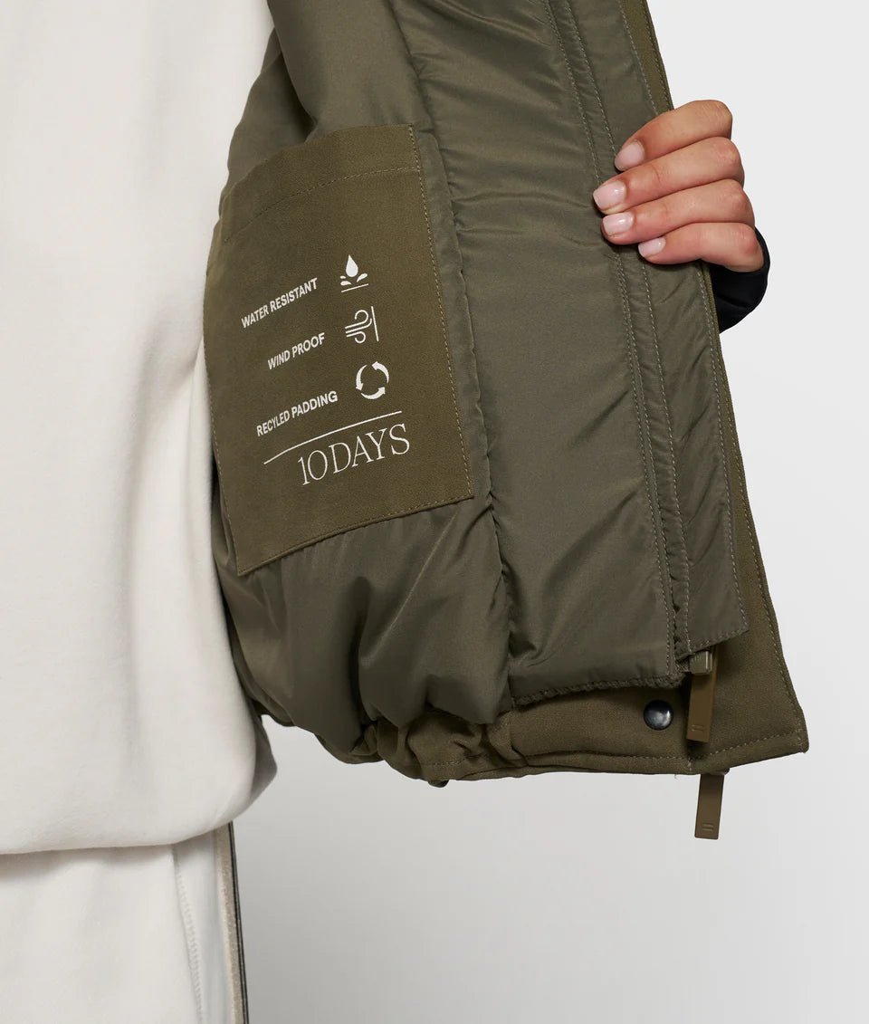 Parka jacket, made with 5,000mm waterproof fabric, and a 50% recycled shell, featuring an extra-high rib knit inner jacket, fleece pockets, and scuba cuffs with thumb openings. Includes a blind placket, front straps, an inner adjustable elastic waist and a capped hood with drawcords. As well as a ‘10’ monogram embroidery on the hood, ‘10DAYS Amsterdam’ embroidery above the pocket, two front pockets, an inside pocket, and signature 10DAYS parachute straps for hands-free carrying.