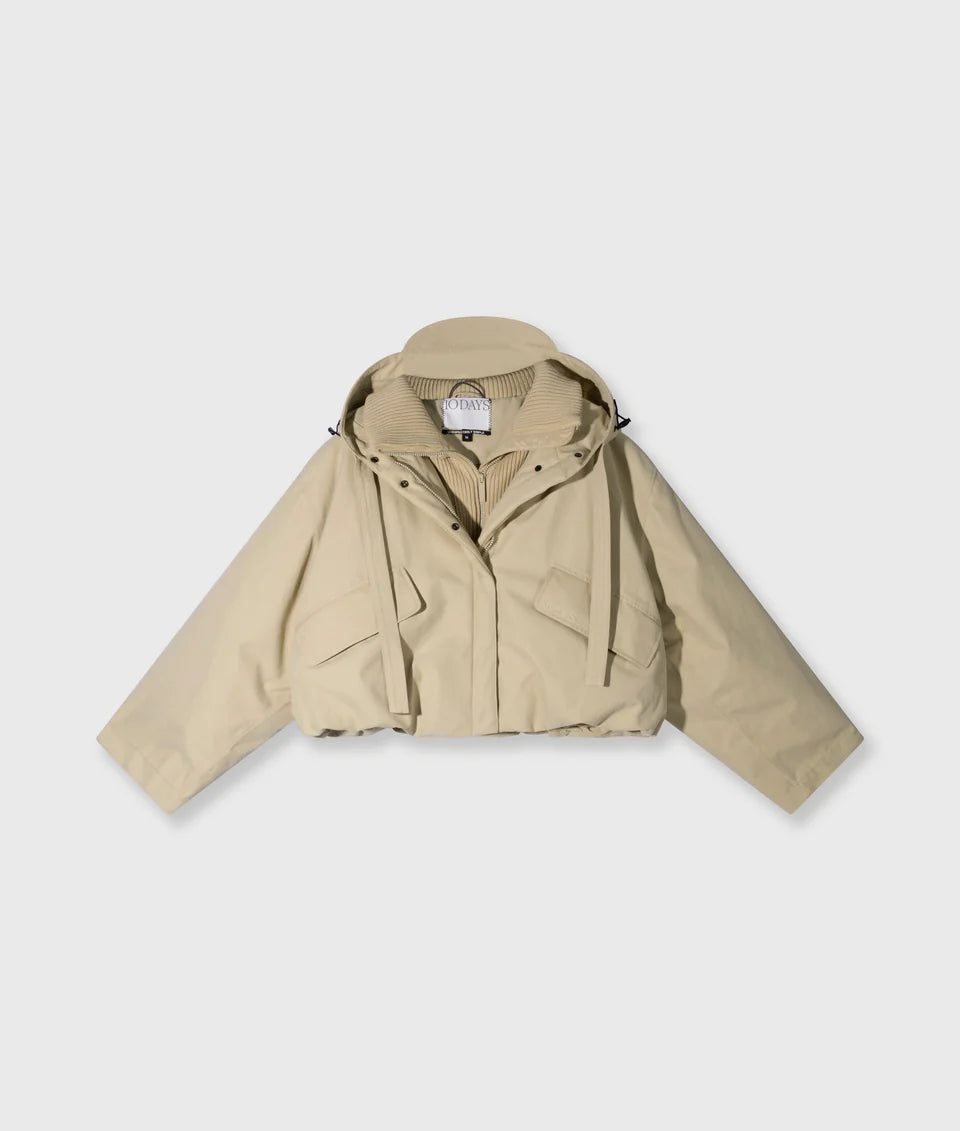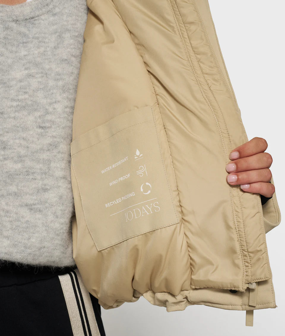 Parka jacket, made with 5,000mm waterproof fabric, and a 50% recycled shell, featuring an extra-high rib knit inner jacket, fleece pockets, and scuba cuffs with thumb openings. Includes a blind placket, front straps, an inner adjustable elastic waist and a capped hood with drawcords. As well as a ‘10’ monogram embroidery on the hood, ‘10DAYS Amsterdam’ embroidery above the pocket, two front pockets, an inside pocket, and signature 10DAYS parachute straps for hands-free carrying.
