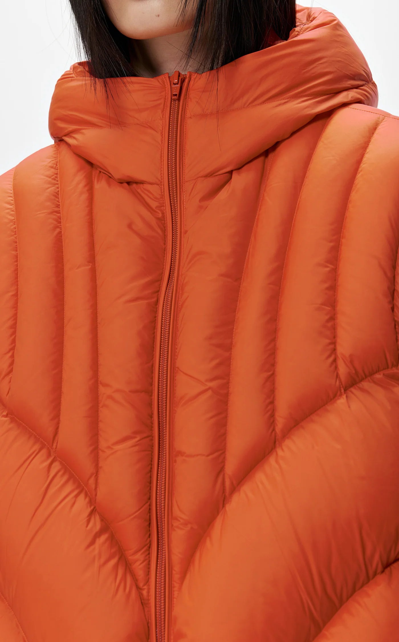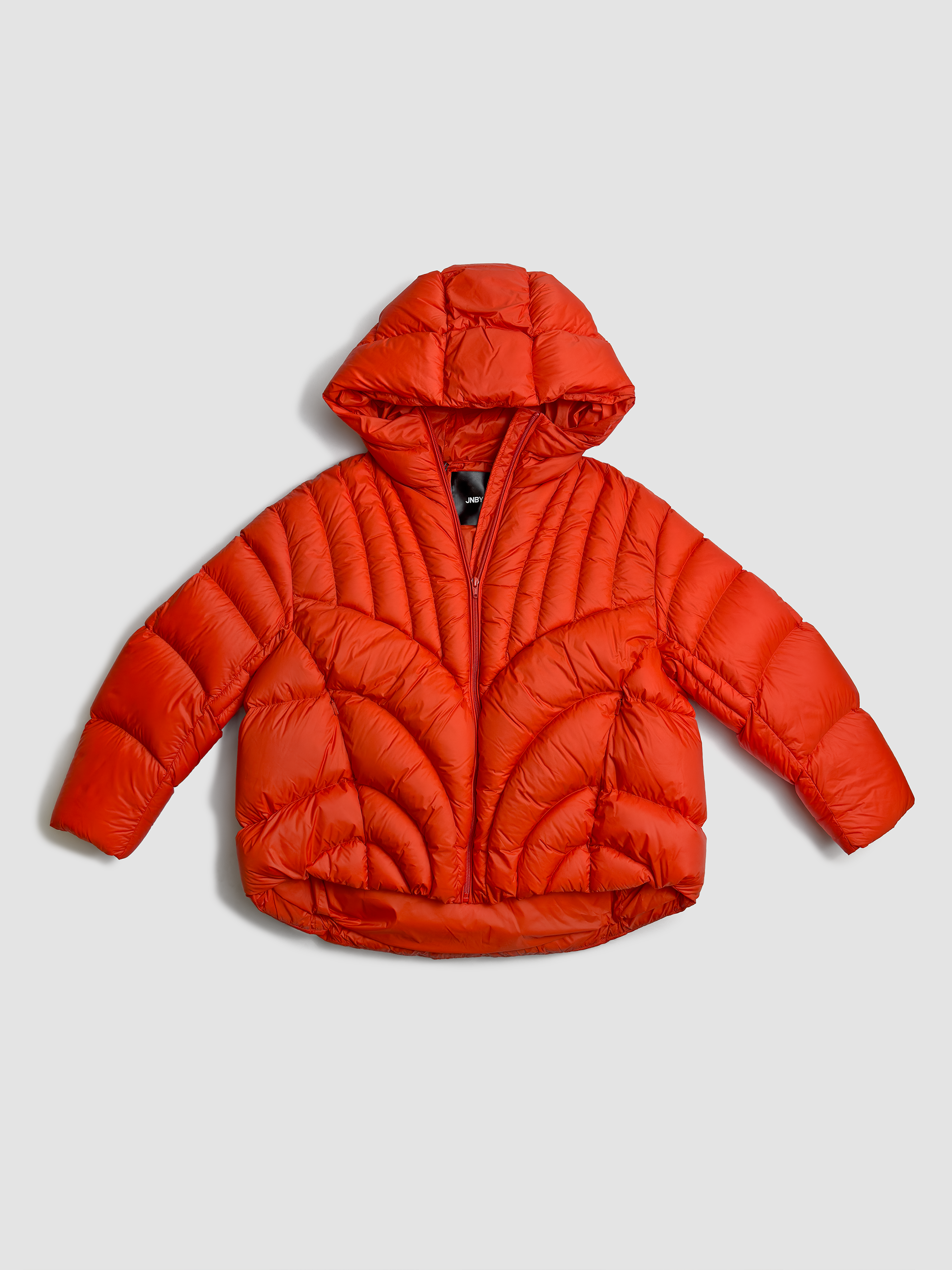 Down jacket in a casual balloon style. The striking, unusual quilting promises attention. The hood and drawstring inside provide wind protection, while the down provides warmth on cold days.