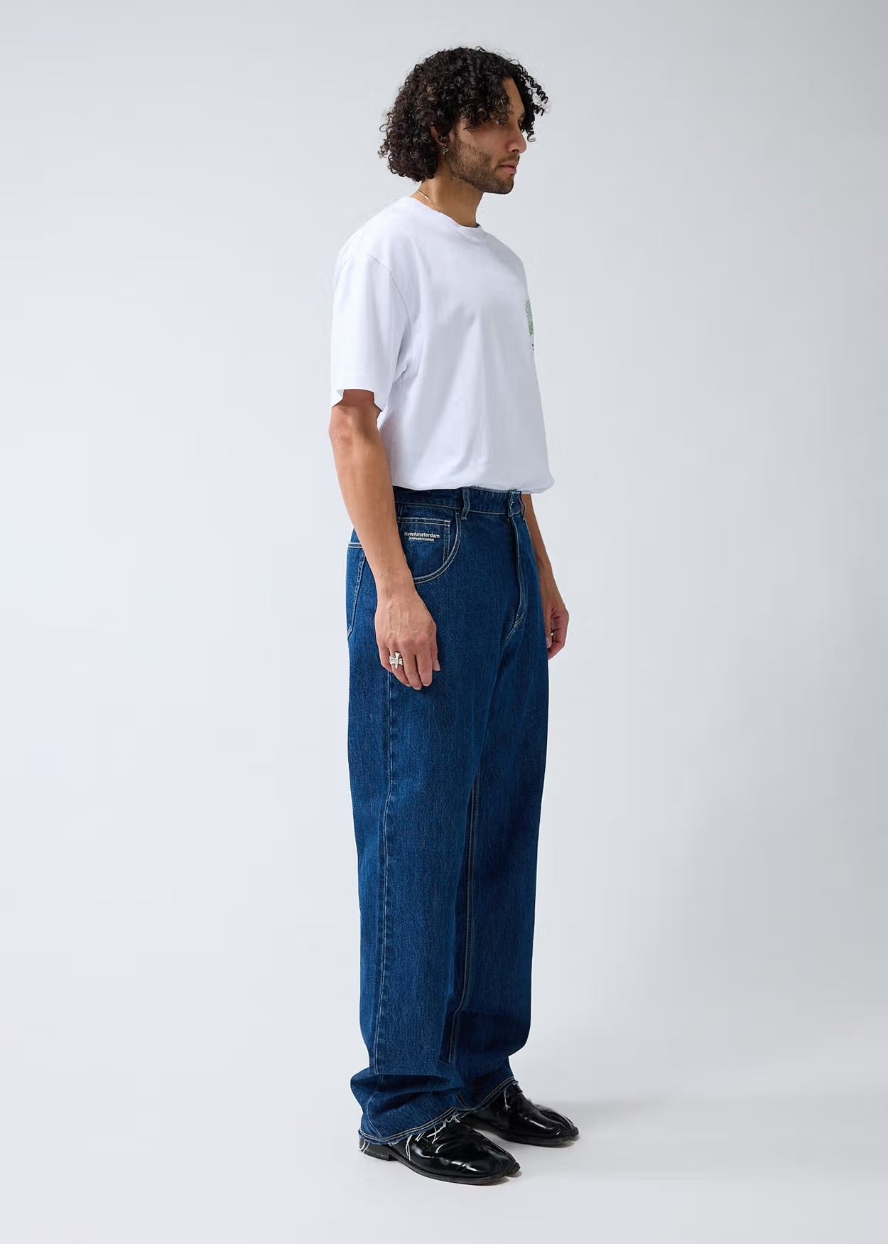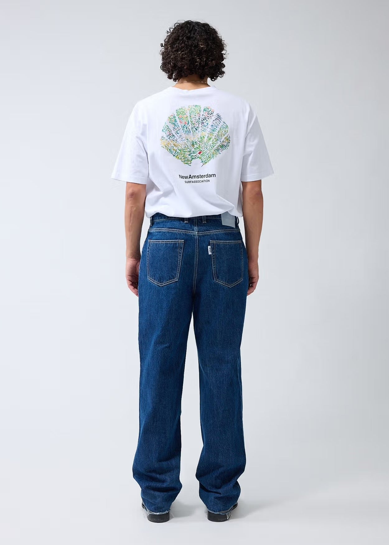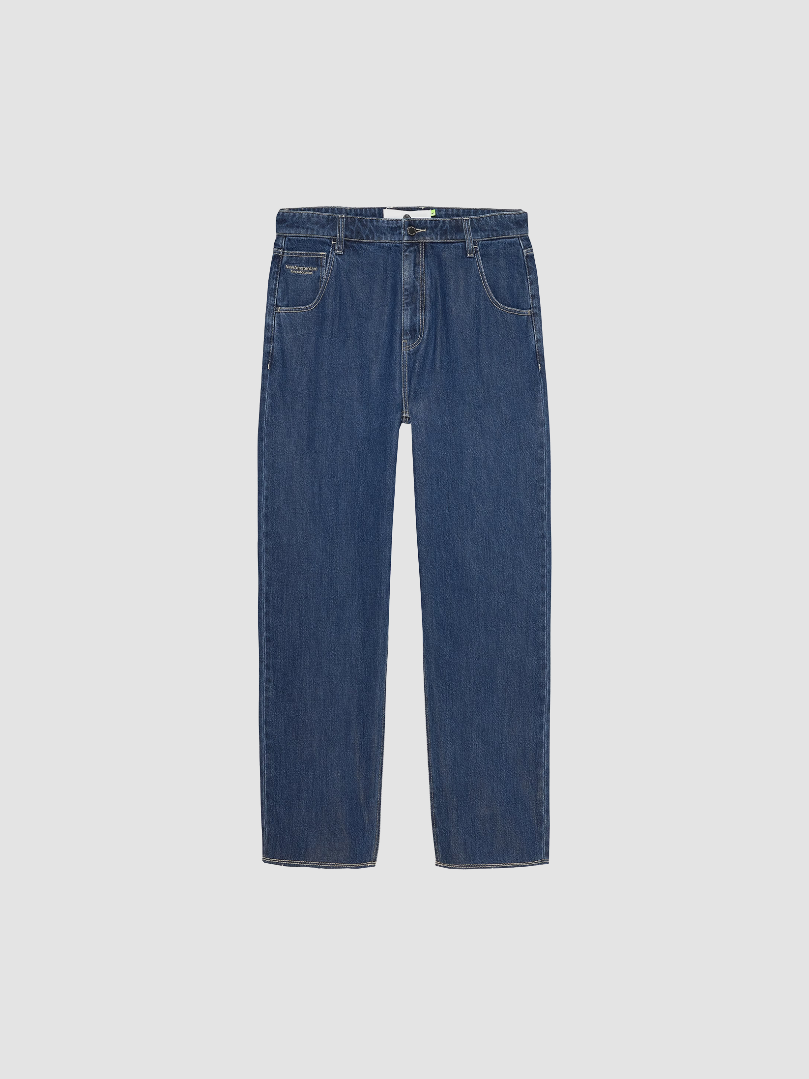 Denim jeans cut to a relaxed fit with a mid waist and a straight leg. The garment has a fixed waistband and is available in two lenghts. Detailed with a Metal branded button, raw edge bottom hem and New Amsterdam name embroidery above the left pocket. These pants are made out of a cotton denim.