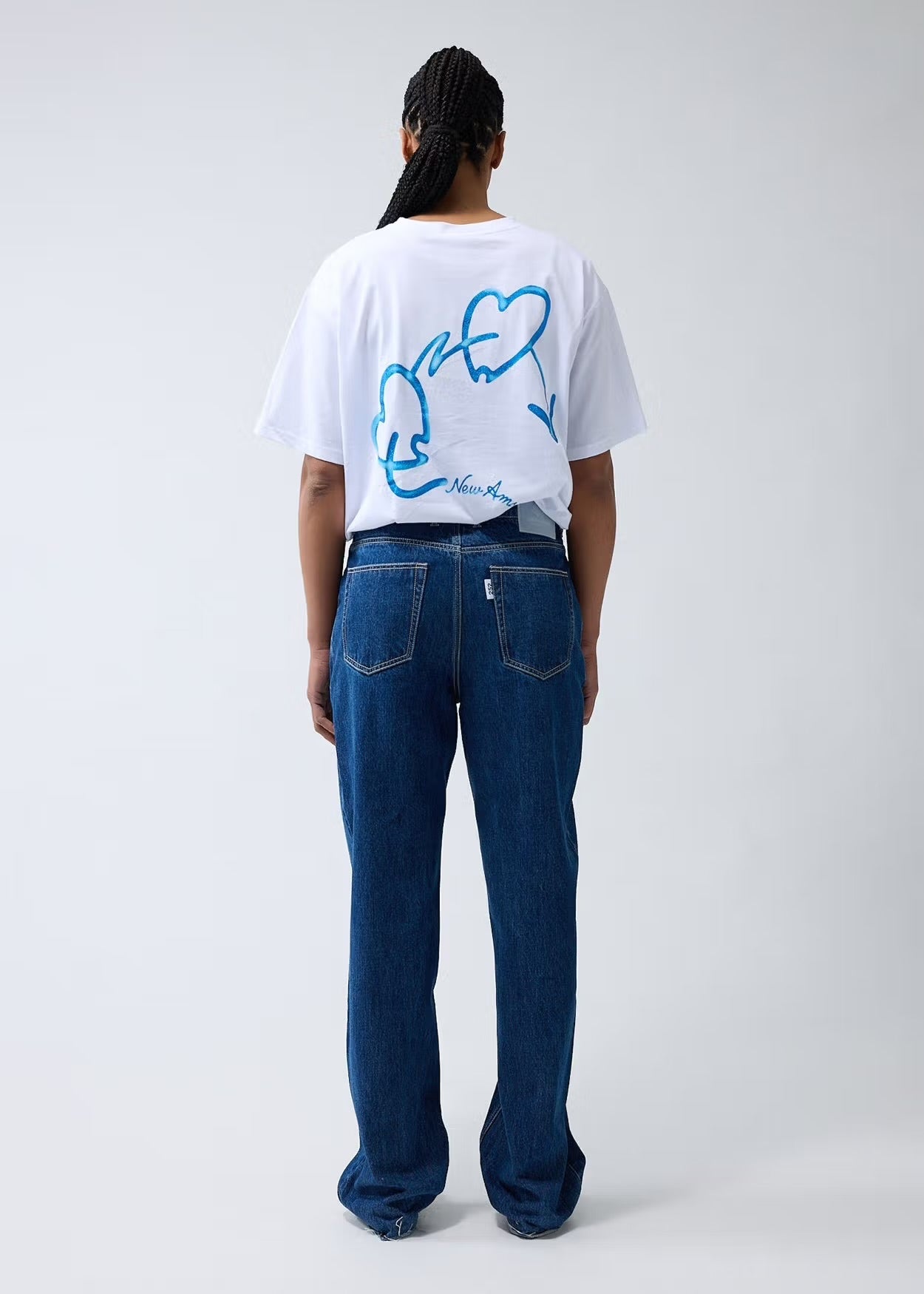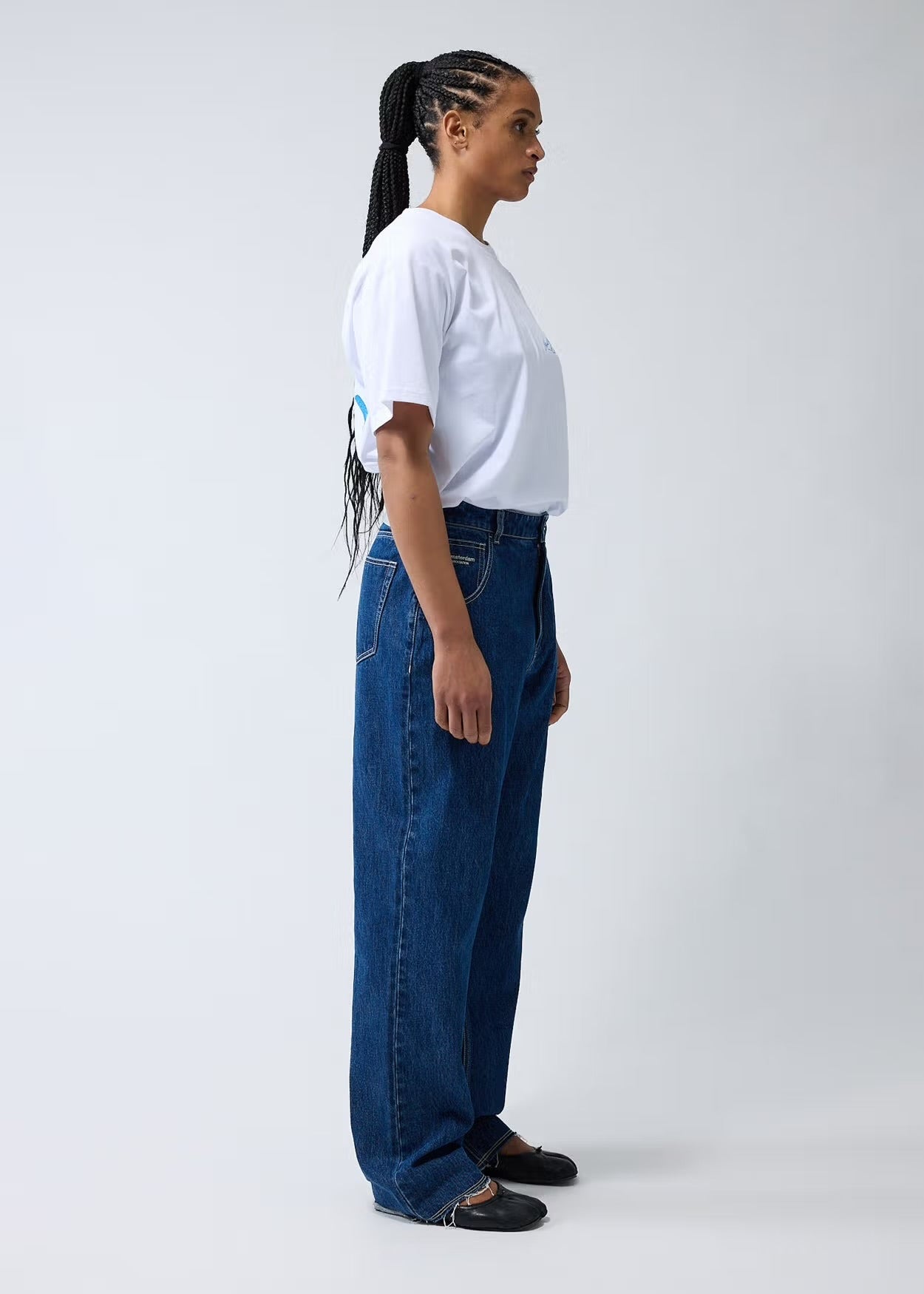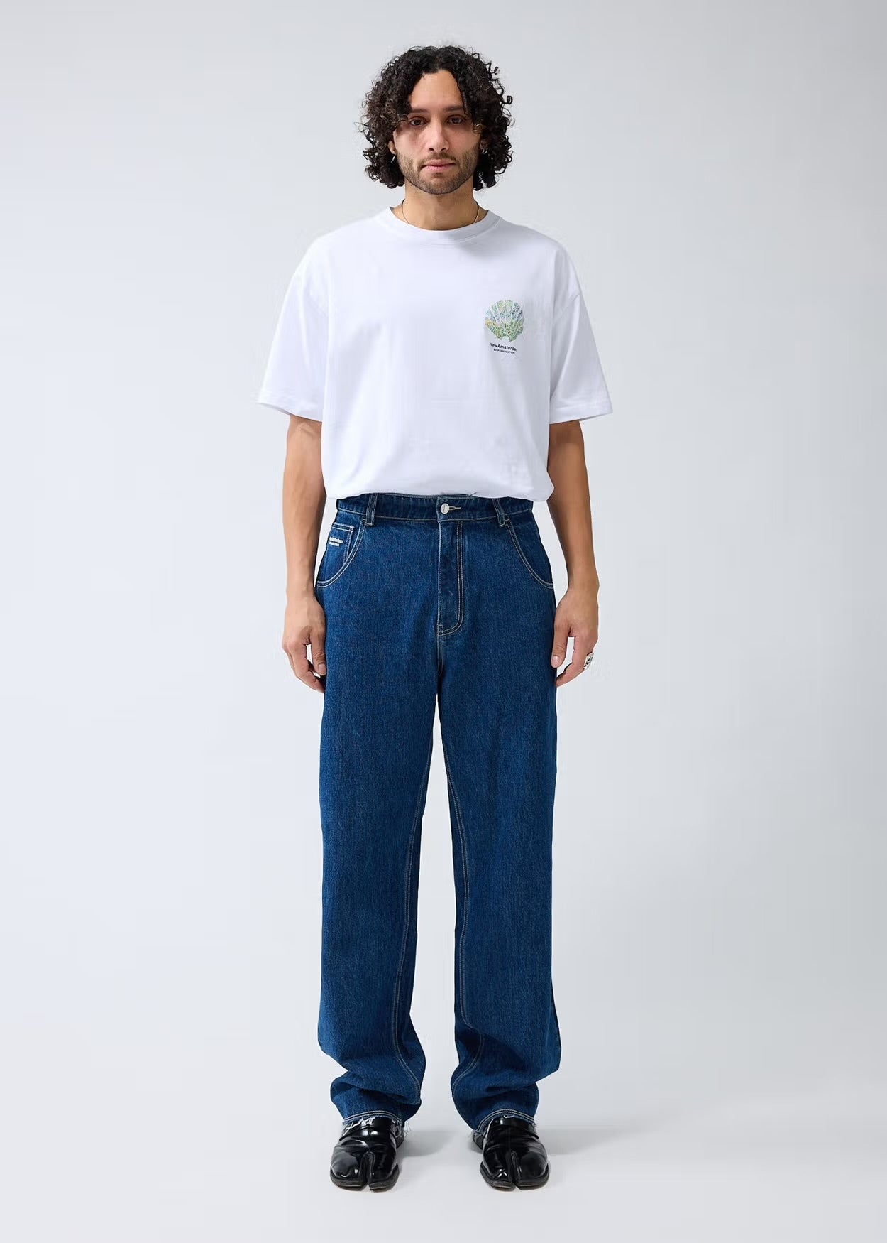 Denim jeans cut to a relaxed fit with a mid waist and a straight leg. The garment has a fixed waistband and is available in two lenghts. Detailed with a Metal branded button, raw edge bottom hem and New Amsterdam name embroidery above the left pocket. These pants are made out of a cotton denim.