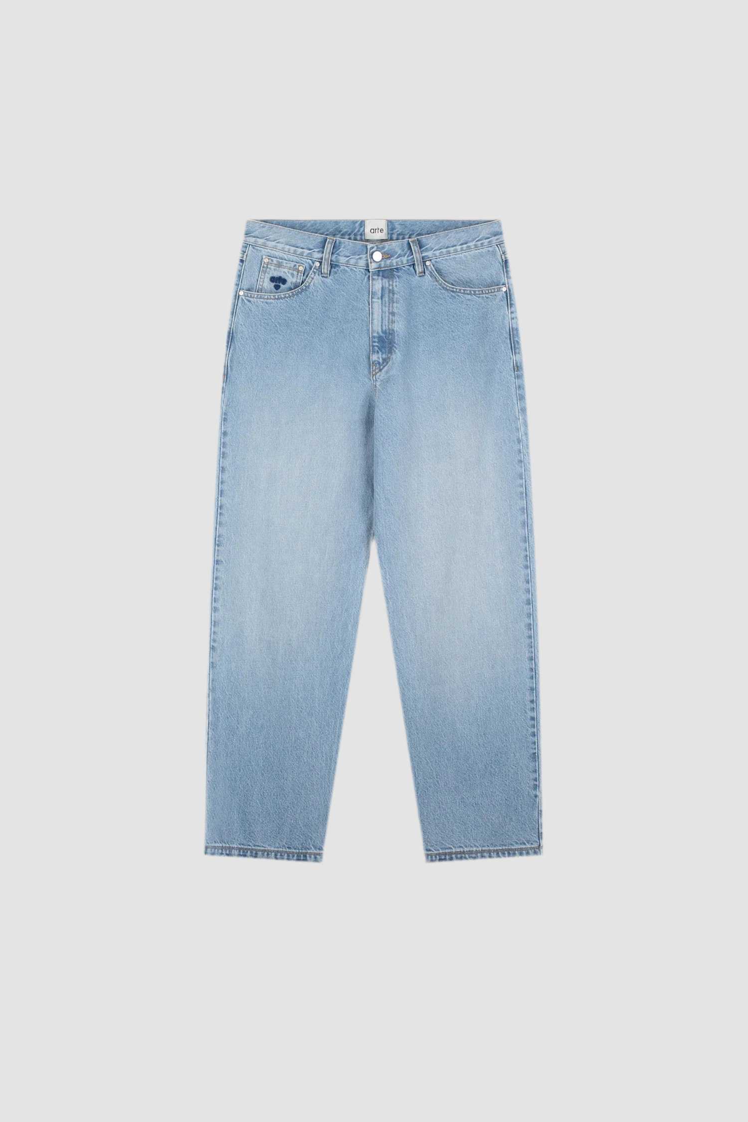 The denim trousers are an everyday pair of pants that feature an embroidered seasonal Arte logo on the right small pocket in blue.
