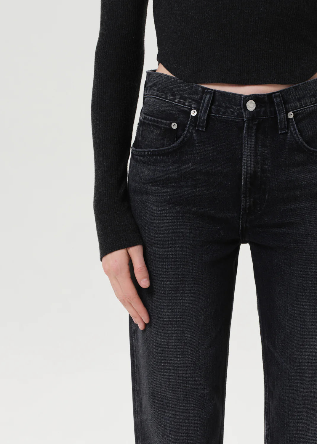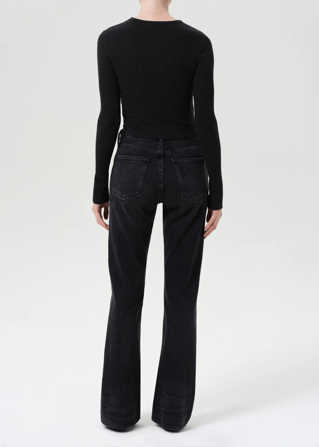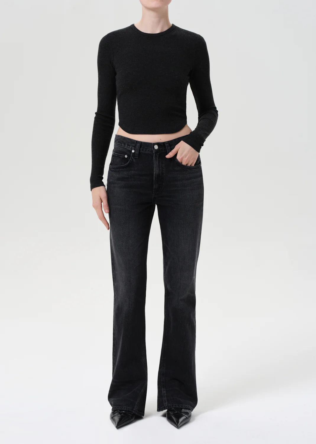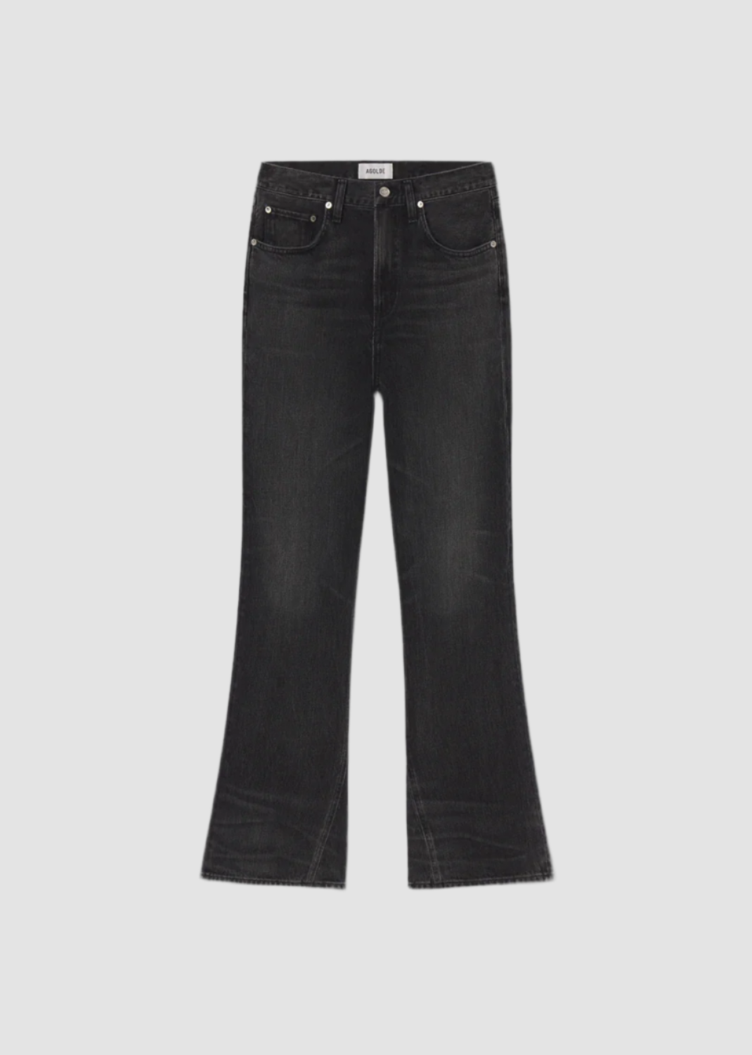 This mid-rise bootcut hugs through the hips before opening into a subtle kick at the hem. Cut in our weightless, non-stretch regenerative cotton denim and washed down for an ultra-soft feel, it features a worn-in black finish with fading and whiskering for a vintage-inspired look.