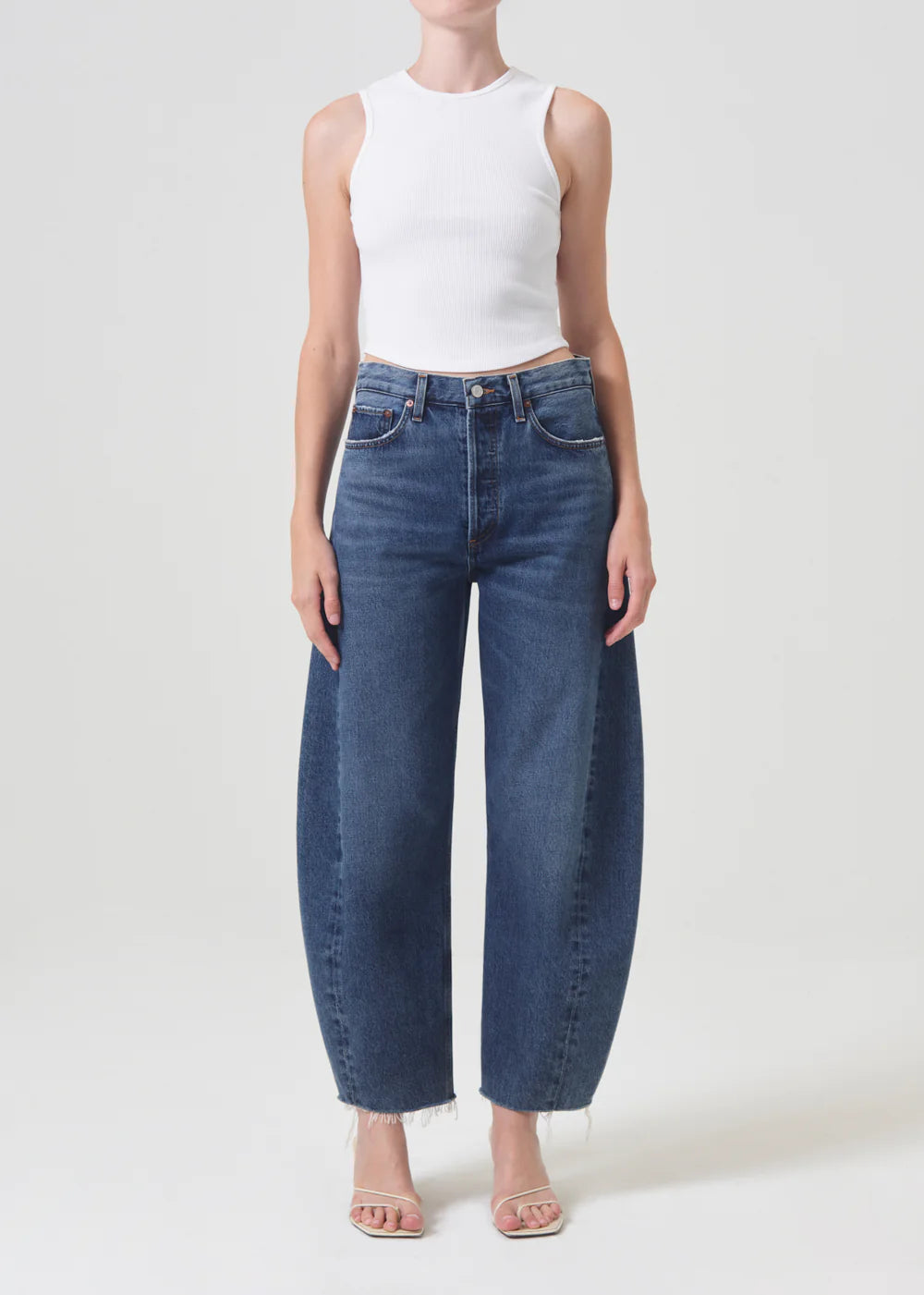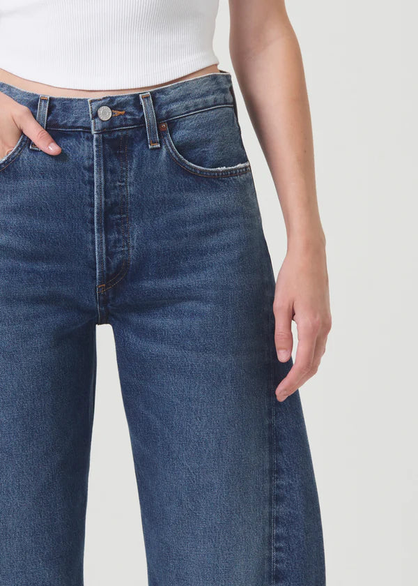 Organic cotton. The Luna is designed with a waist-accentuating high-rise and a full-length relaxed leg. The pieced insert detailing at the outseam creates a bowed leg silhouette, ideal for taking your everyday denim to the next level.