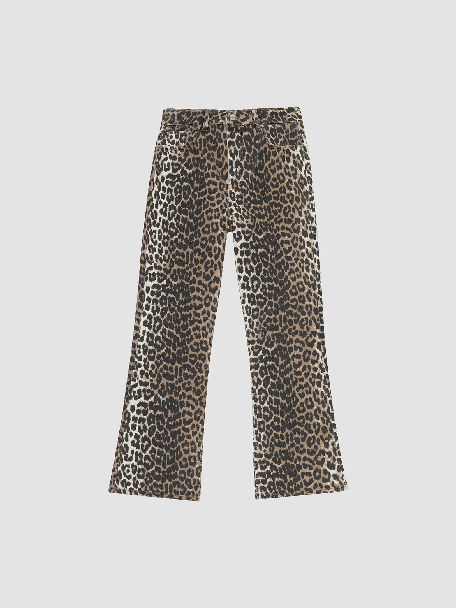 These jeans in leopard printed denim feature a zip and button closure, 5 pockets, belt loops and a GANNI logo at the back pocket.