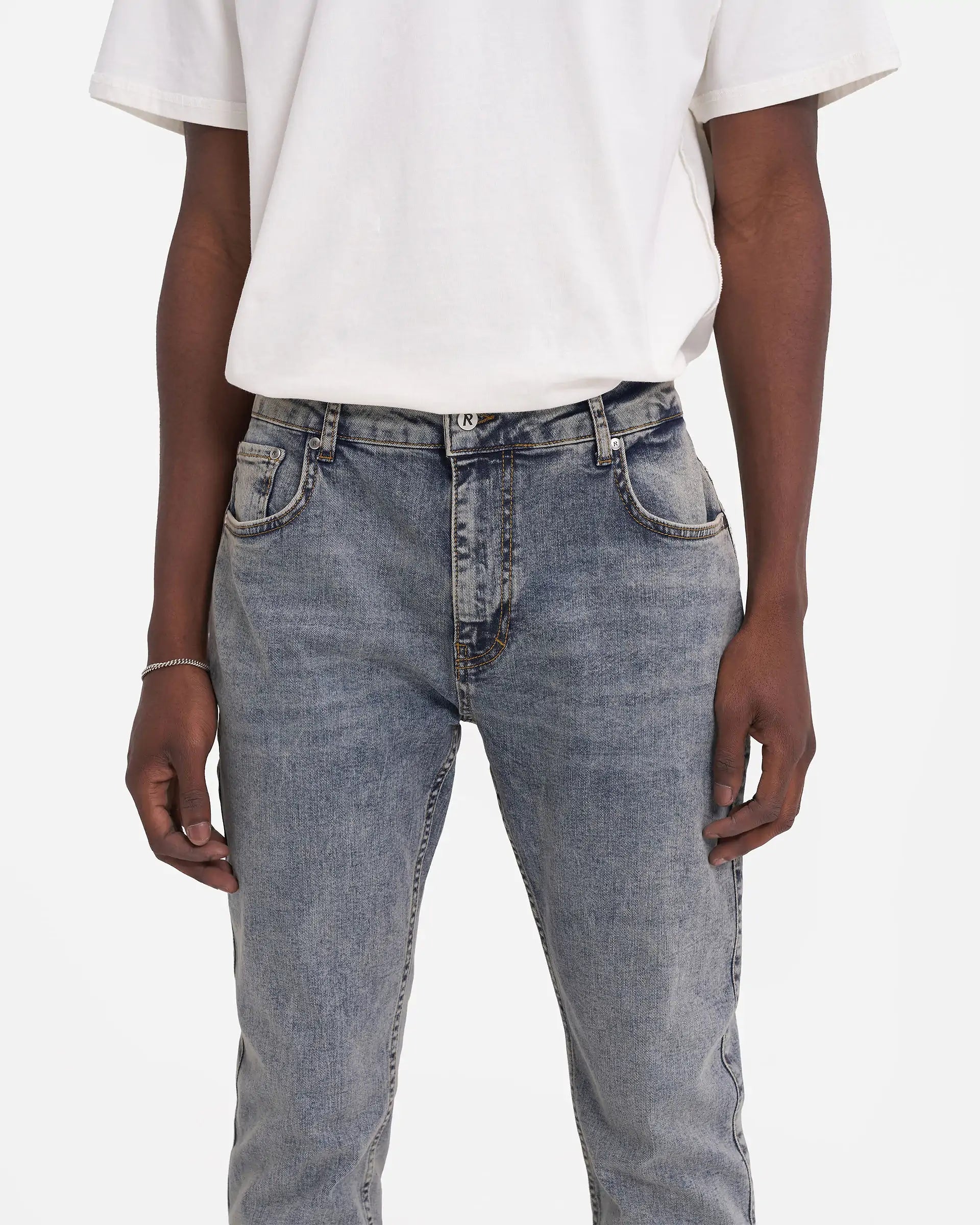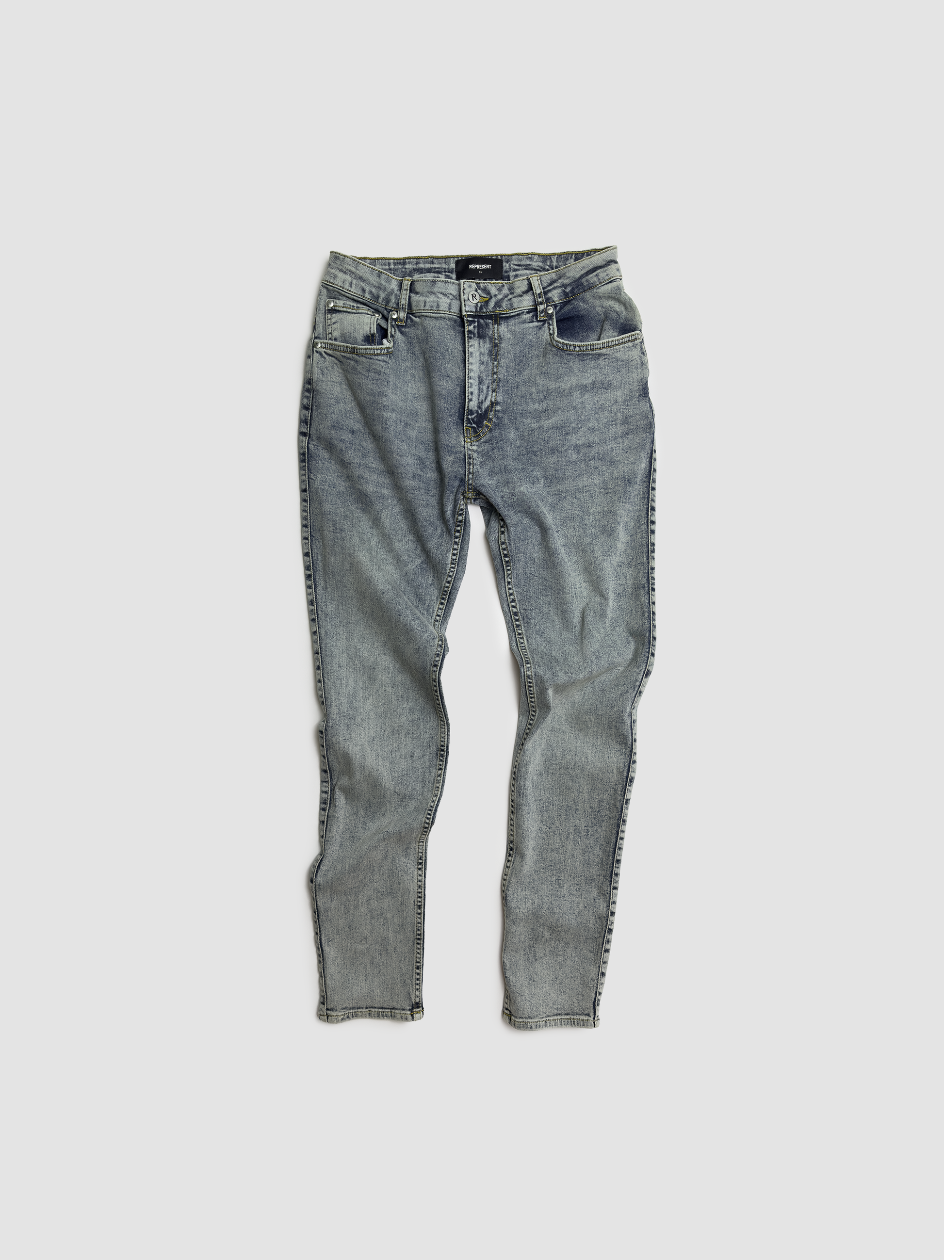 Slim fit from a new fabric which affords a softer hand feel, these jeans are a heavy wash blue in colour and have a high degree of fade to the garment tacking. They have an Initial branded button and rivets.