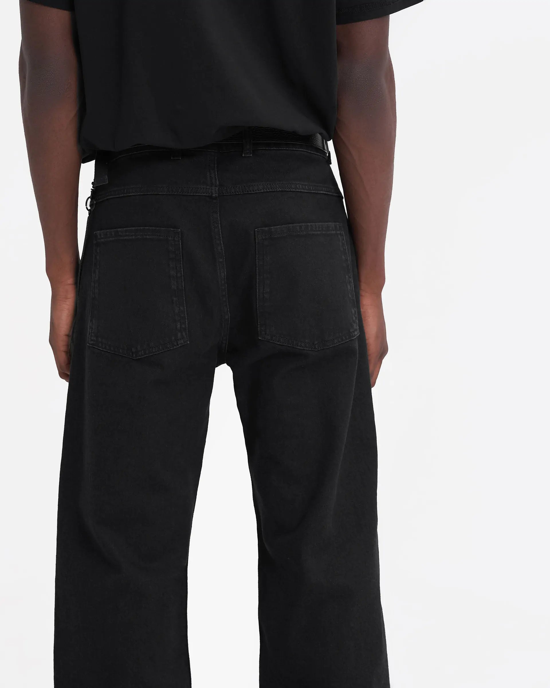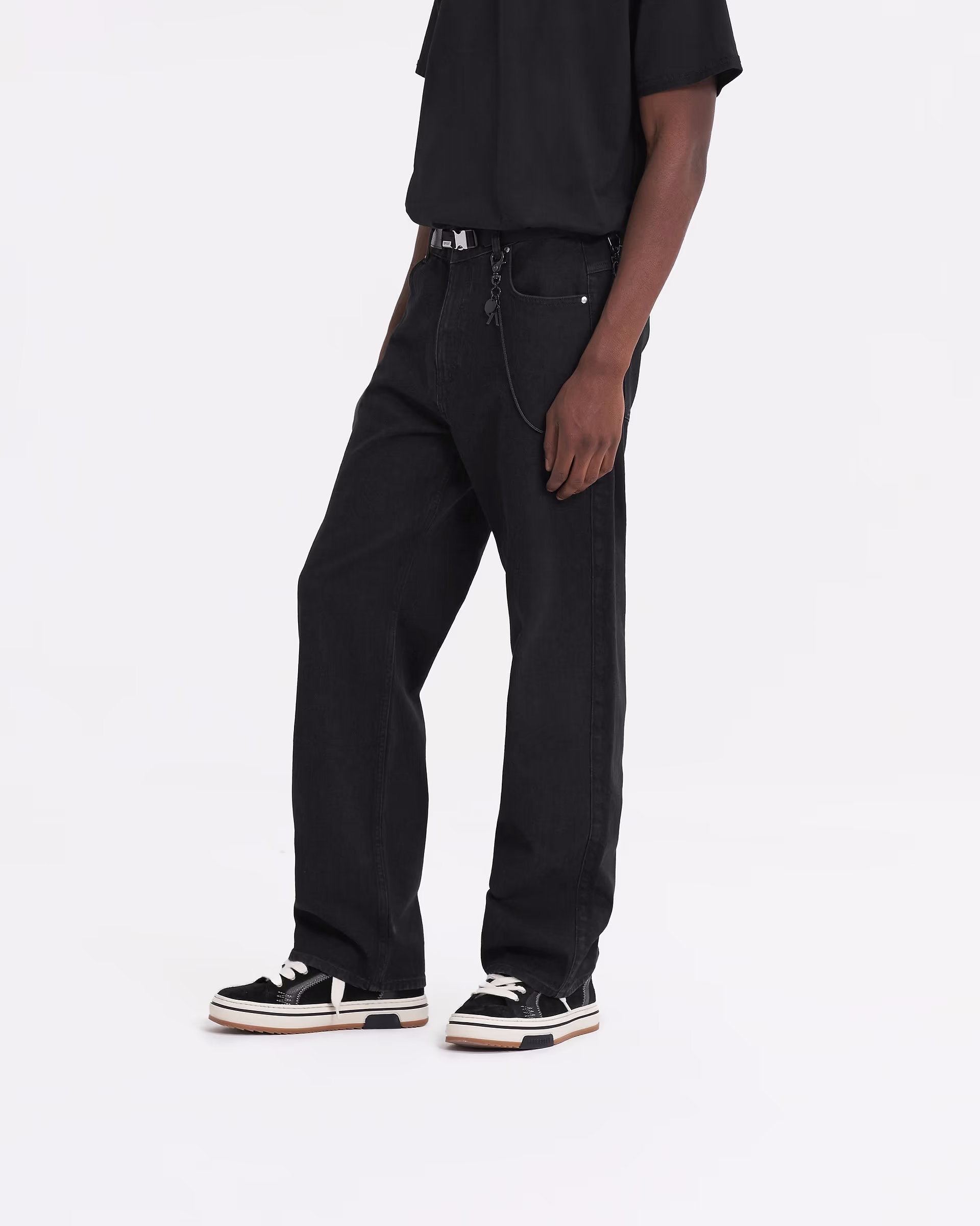 These black jeans have a relaxed fit throughout the leg. They feature an Initial branded button and rivets.