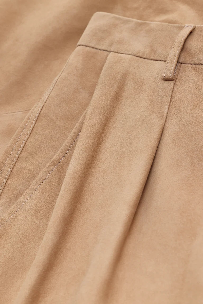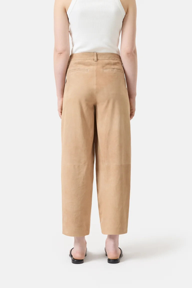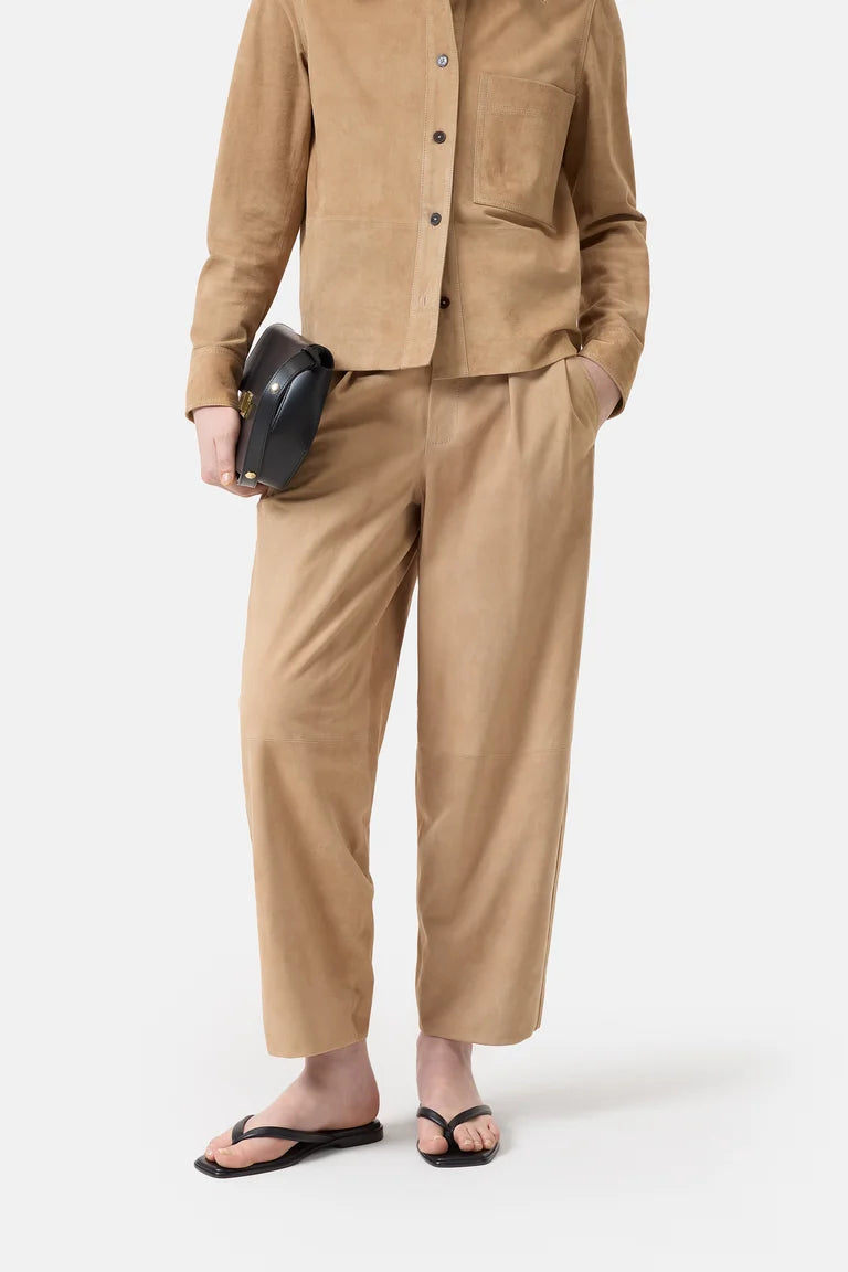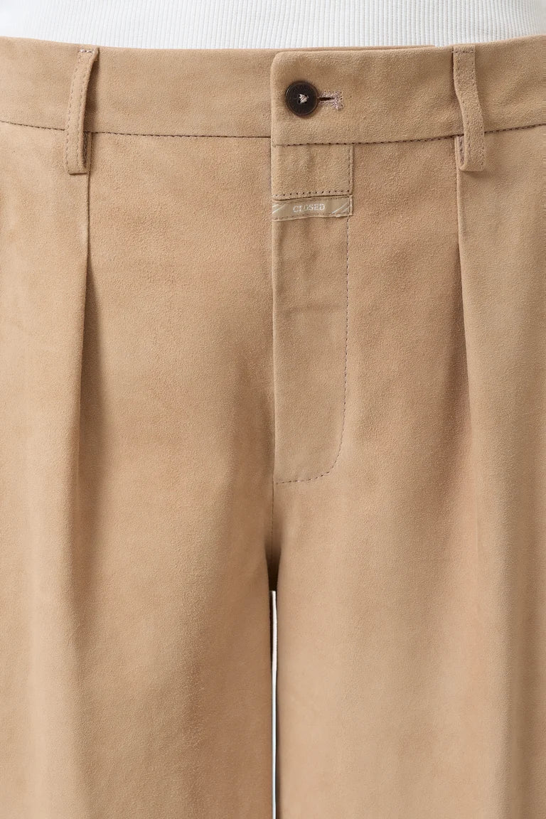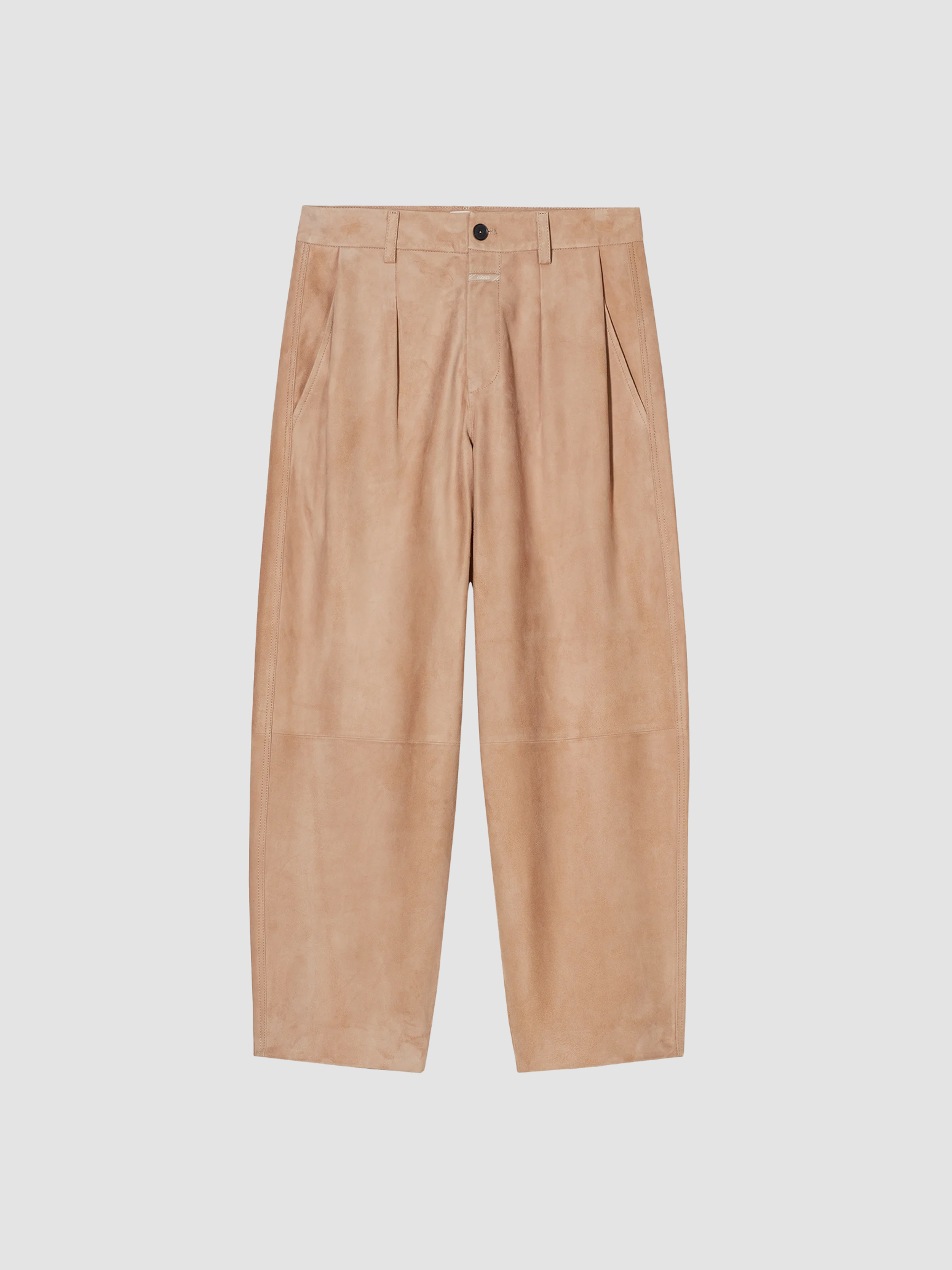 Made from 100 per cent finest, soft velour leather: Pants in a relaxed fit with pleat details at the waistband, mid-rise, wide-leg shape, and cropped length. The premium leather is chrome-free tanned. This style features side pockets, horn-effect buttons, and back pockets. Can be paired with the matching shirt for a complete leather suit look.