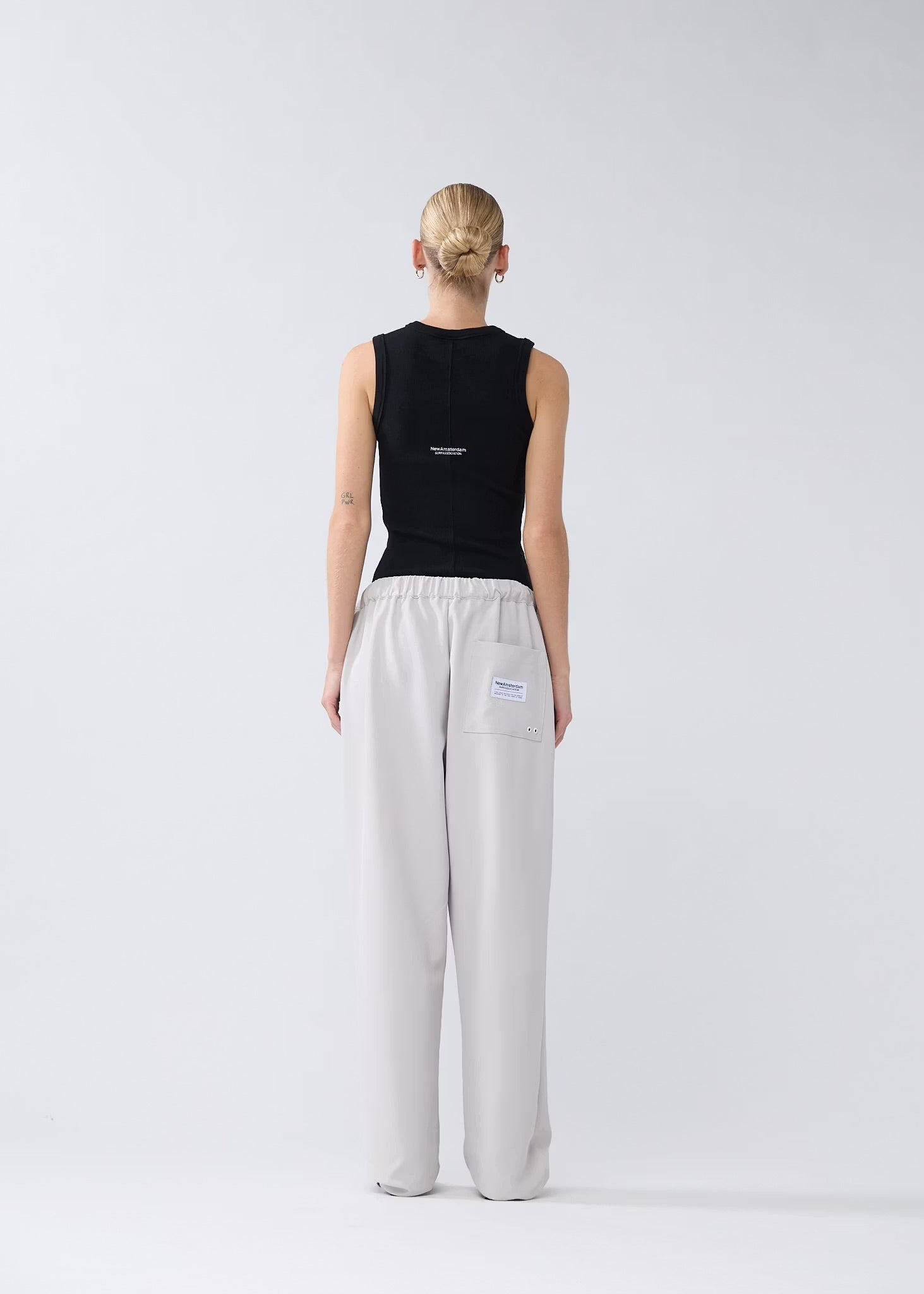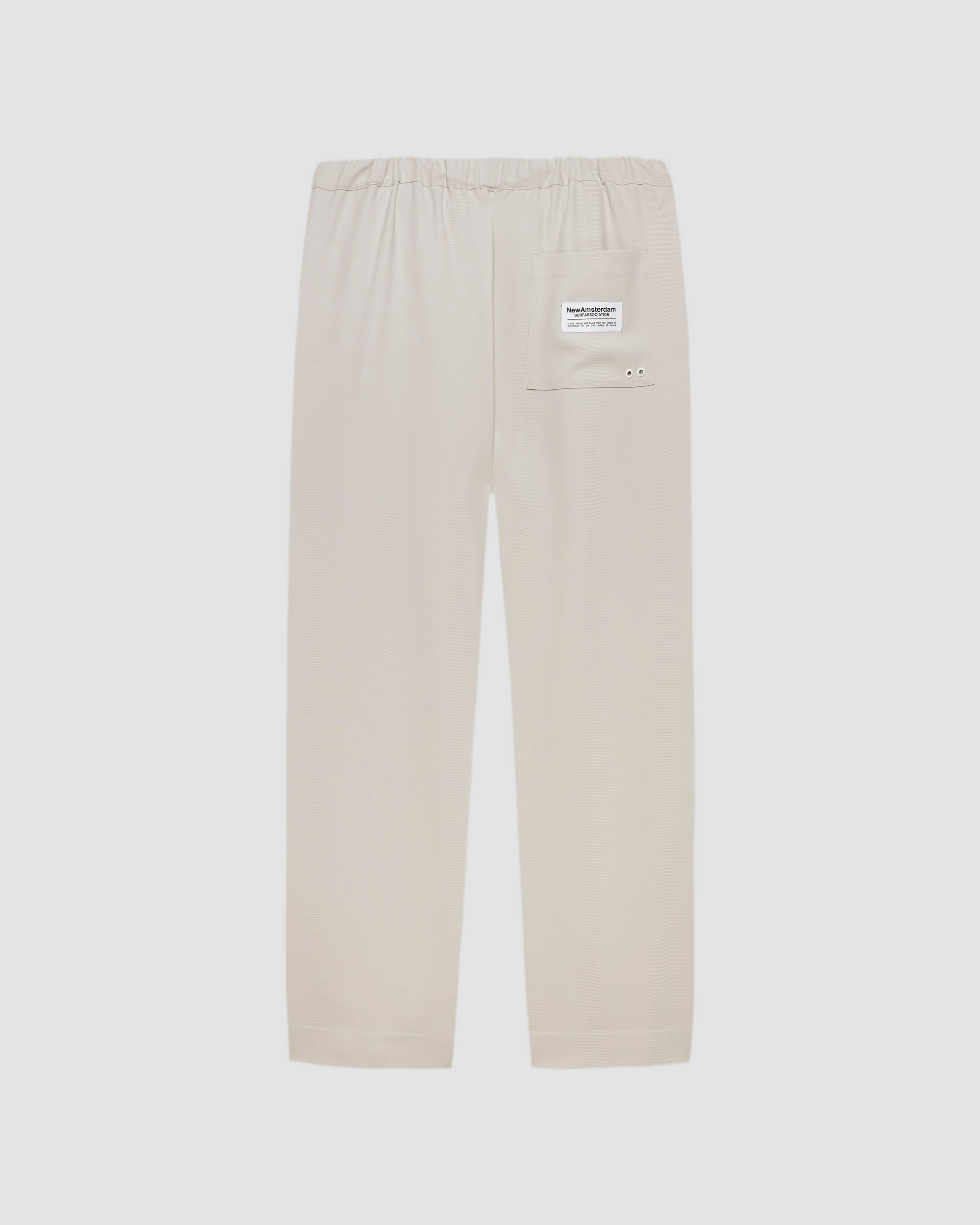 Pants cut to a relaxed fit with a mid waist, elasticated waistband, straight leg. Detailed with metal branded eyelets, a patch pocket and woven label on the back pocket.