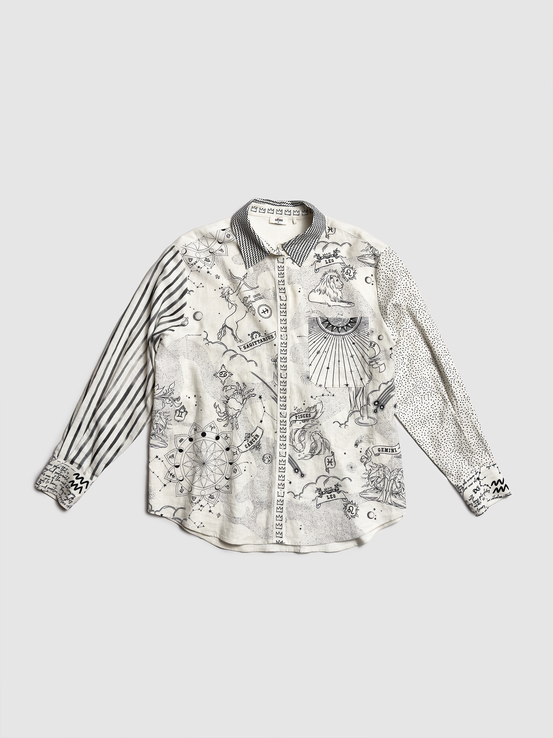 Linen long sleeve Isabel shirt in Zodiac pattern. Collar, cuffs, sleeves and body of shirt, both front and back, are all represented by different Zodiac patterns. Shirt reads “THE MAGIC IS IN YOU” across back.