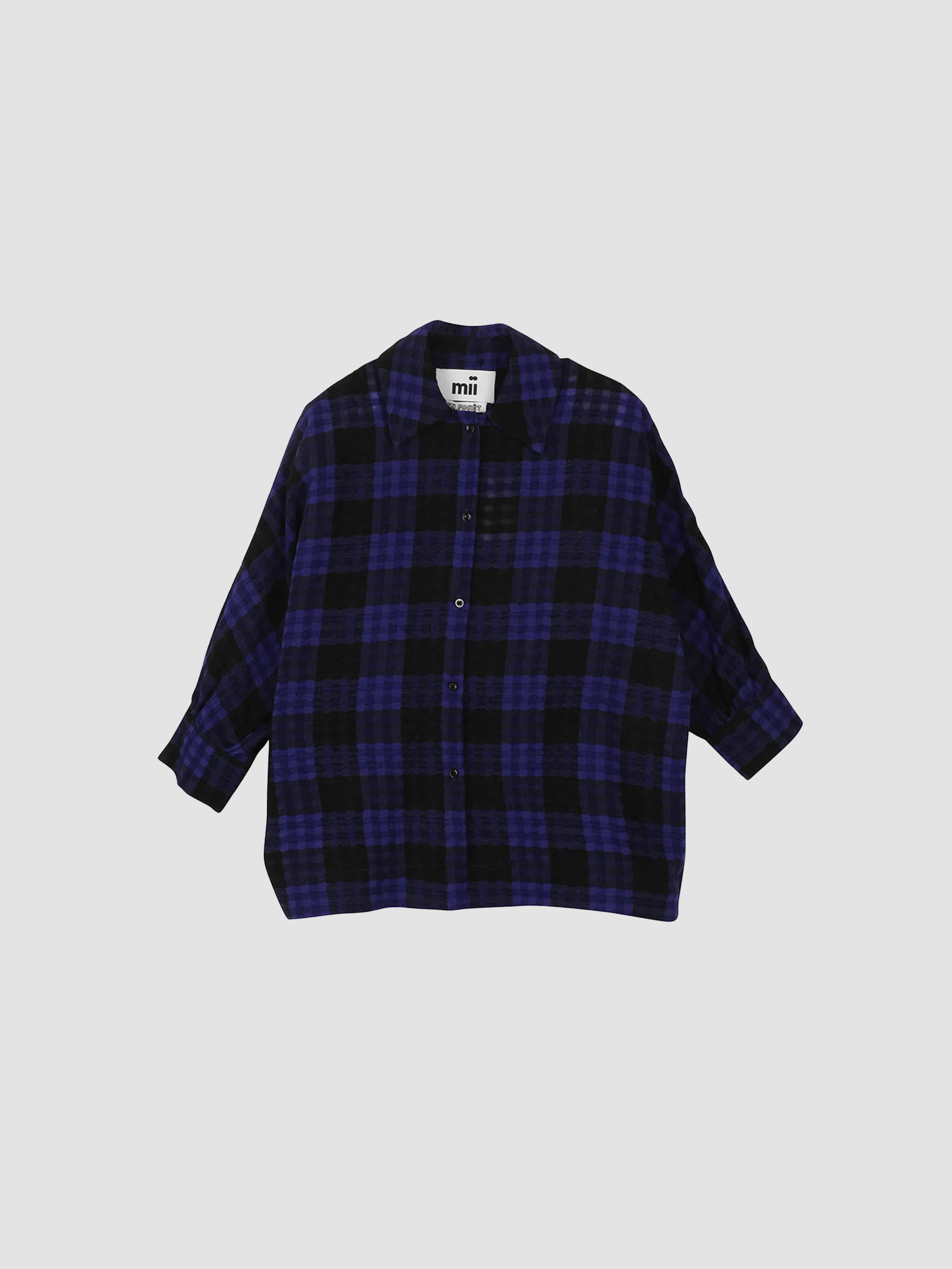 The Manuela shirt is an oversized shirt with three-quarter sleeves that combines lightness and warmth. Hand-woven in wool and cotton, its geometric and graphic check pattern brings relief to the piece.