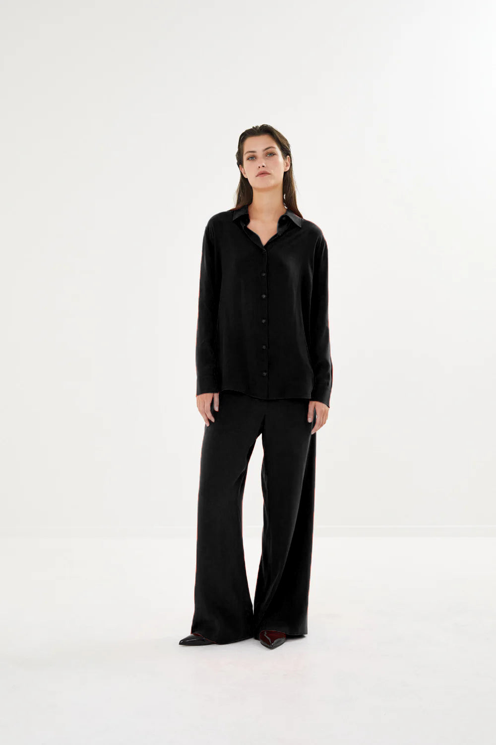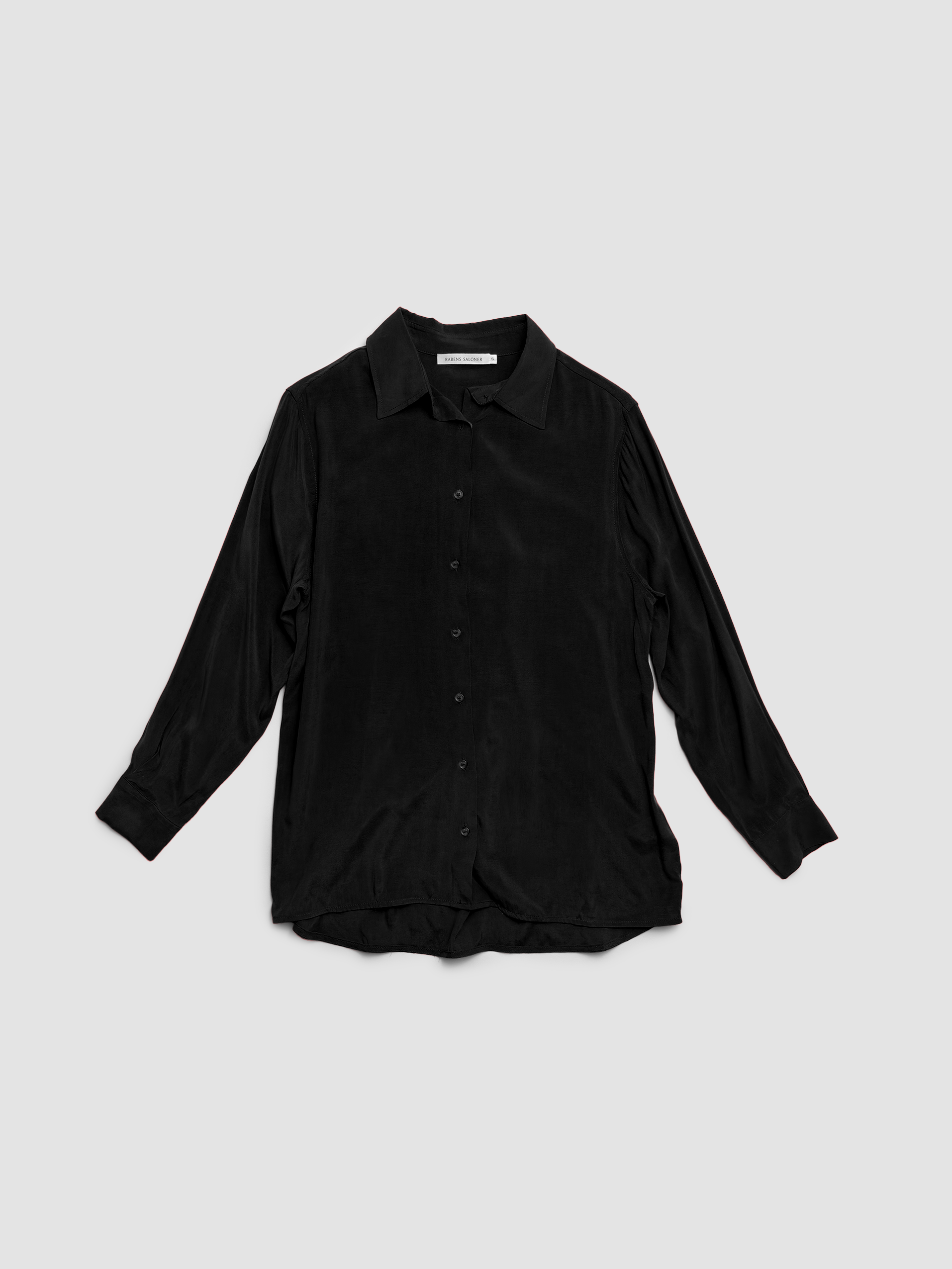 Made in Indonesia from a light, pleasant fabric falling beautifully on the body, the classic shirt is defined by a relaxed boyfriend shape with a small collar and a button-down front. It features box pleats in the back and long cuffed sleeves with buttons.