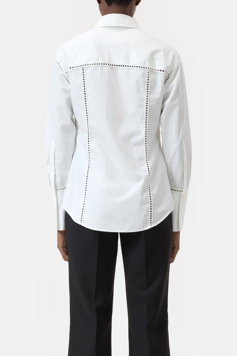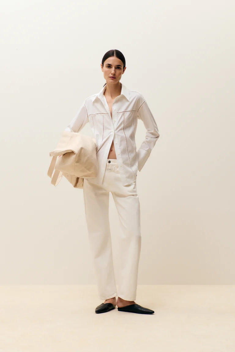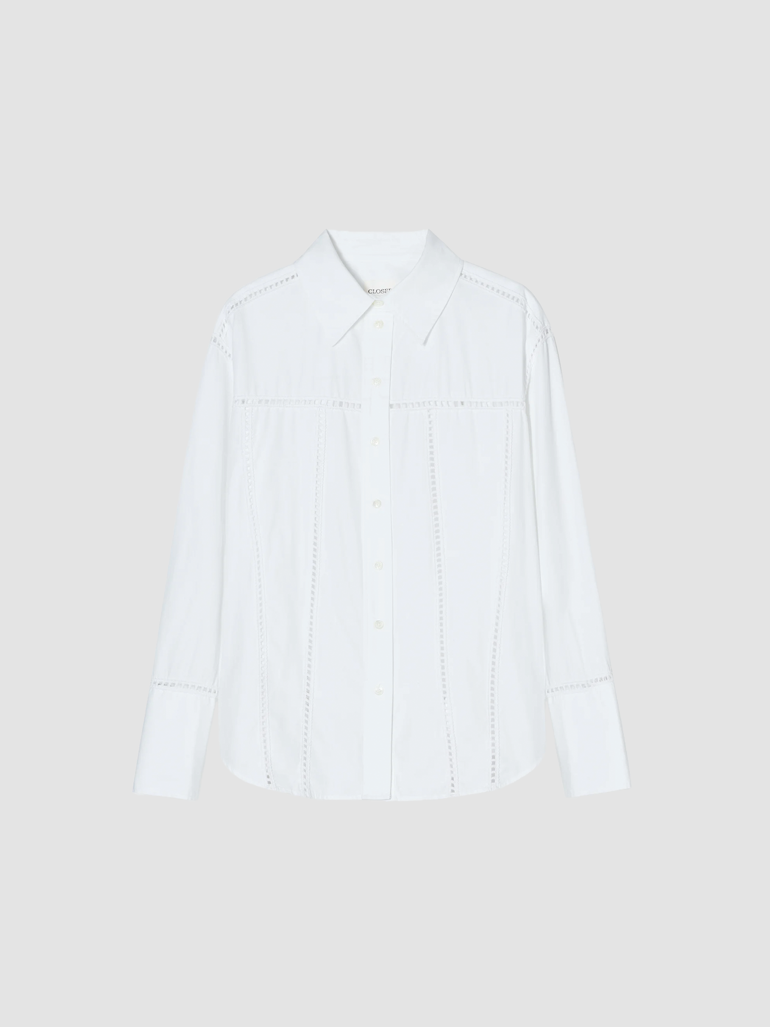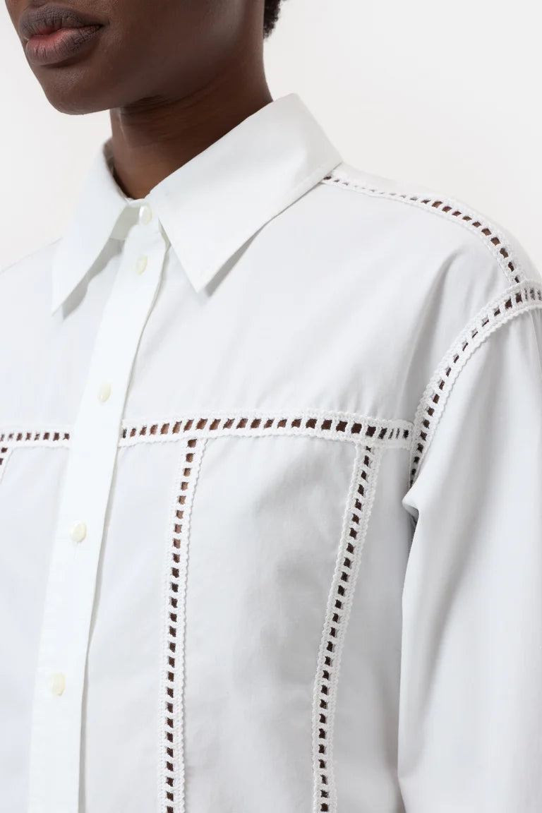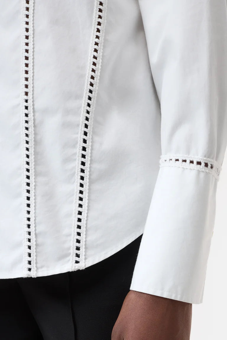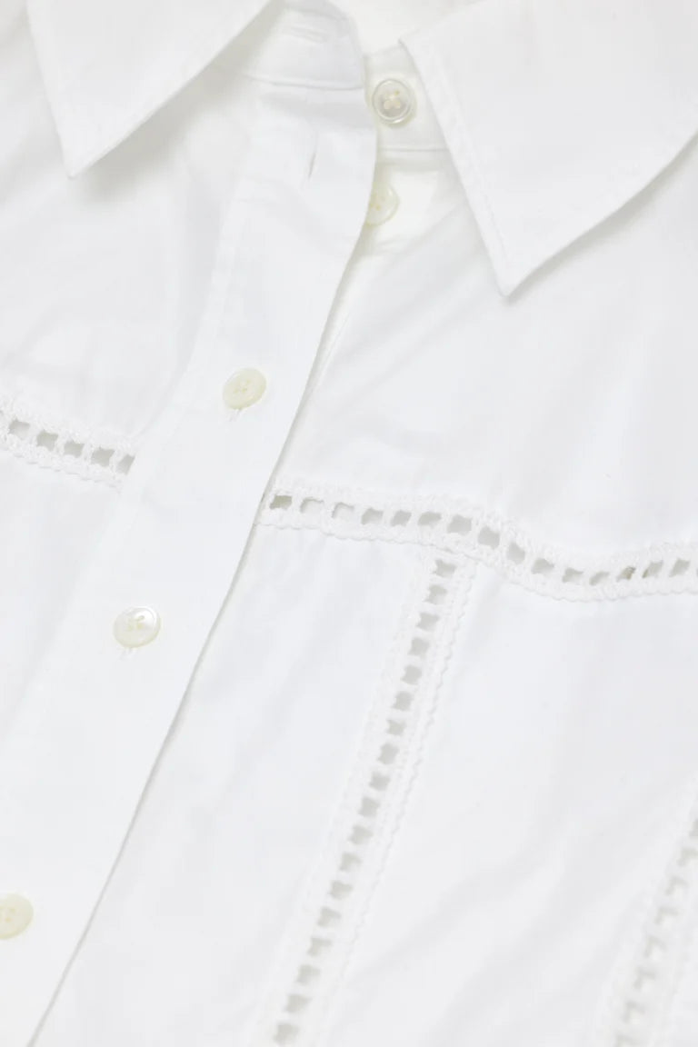 Fitted summer blouse in lightweight, clean cotton poplin with a touch of lyocell for exceptional comfort. Embellished with intricate crochet details, the blouse features a shirt collar, wide cuffs, mother-of-pearl buttons, and a rounded hem.