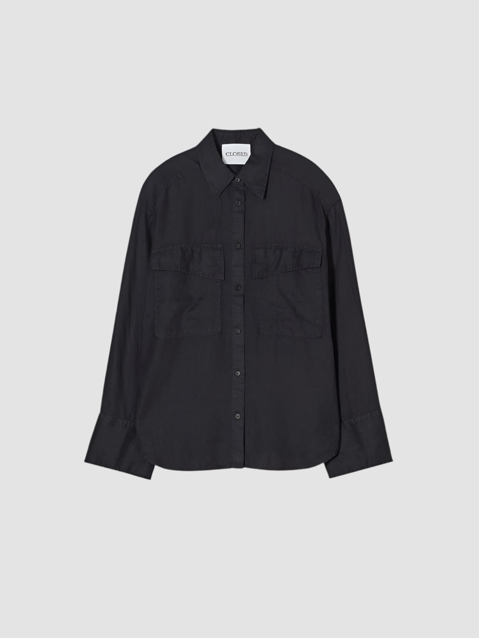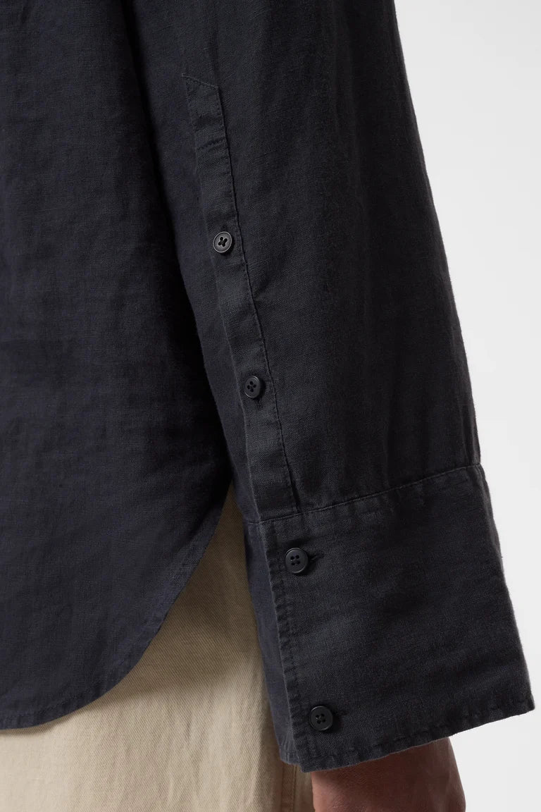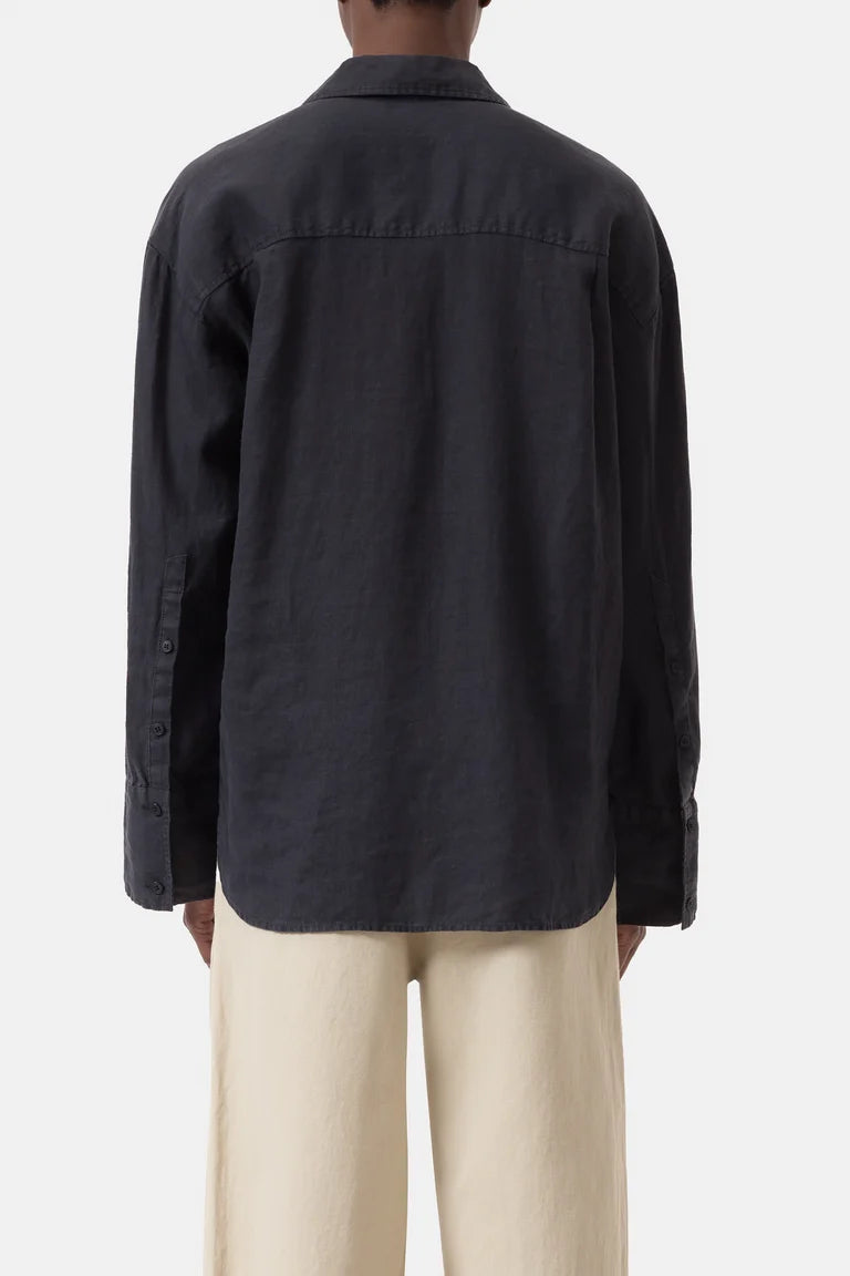 A shirt with a casual summer look, featuring long sleeves, wide cuffs, and utility-style breast pockets. Made of 100% linen, it offers authentic quality, a cool touch, and a soft feel. The hem is rounded.