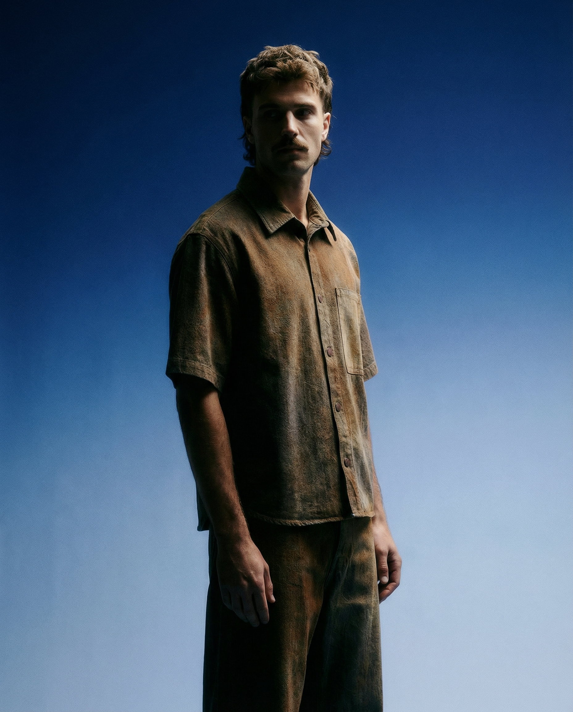 A rinsed-out copper short sleeve shirt with mixed rust tones and a single front pocket. Made from softly structured comfort-stretch denim that moves with you while holding its shape.