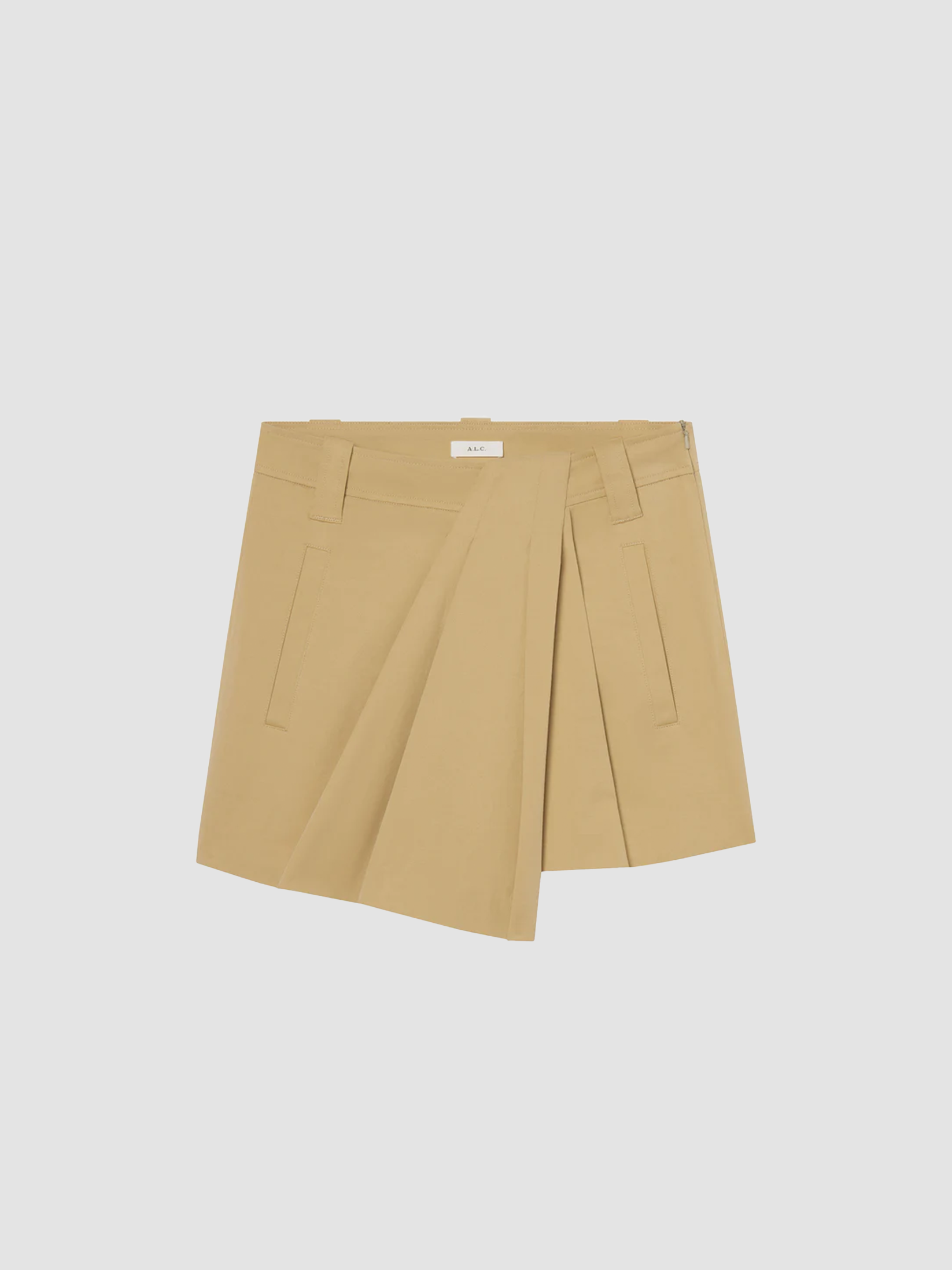 The Brody Short is crafted from soft cotton gabardine — a refined Italian fabric produced in Tuscany using select raw materials, with meticulous spinning, weaving, dyeing, and finishing to achieve its smooth, breathable feel — in desert beige. This high-rise silhouette blends tailored polish with utilitarian influence, featuring slash pockets, a clean back with welt details, and front pleats that drape over a hidden short for a skort-style finish.