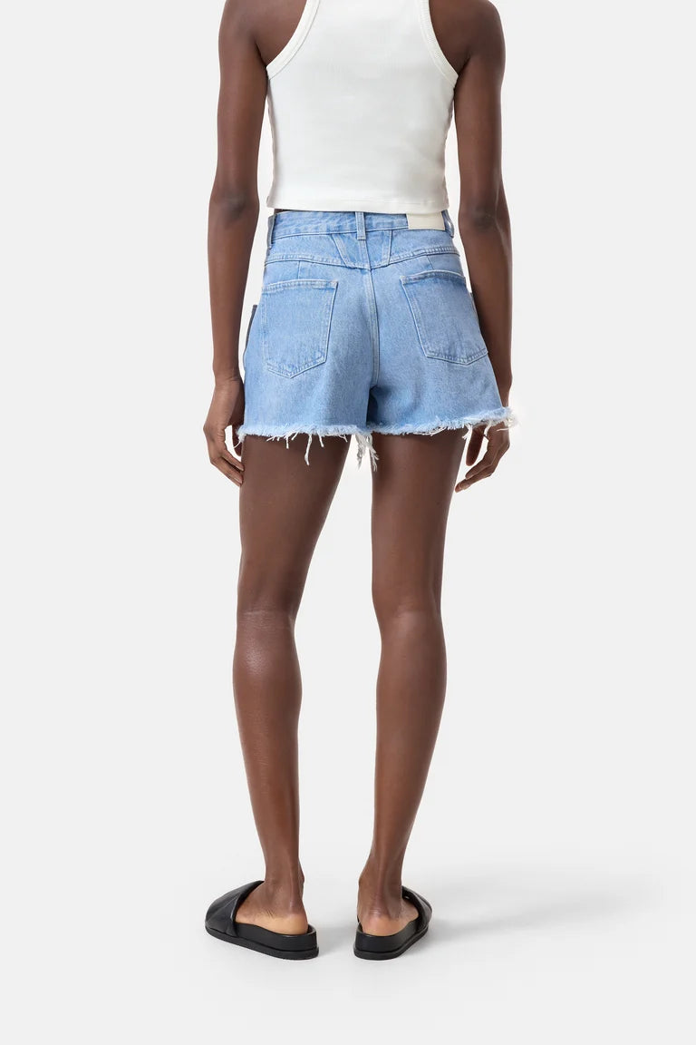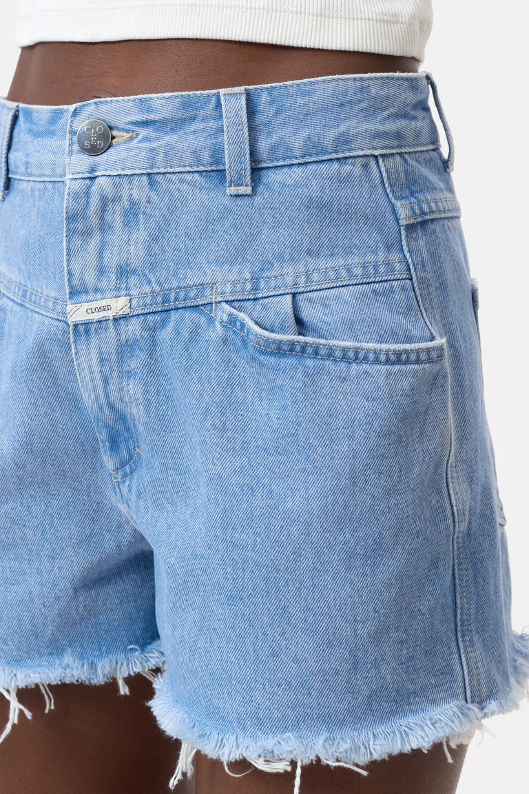 Our loose-fit shorts feature a high waist, X-pockets, and wide legs with a raw hem. Crafted from strong and authentic rigid denim (13.5 oz.) with a special light blue wash. The denim used is pure cotton. Made in Italy.