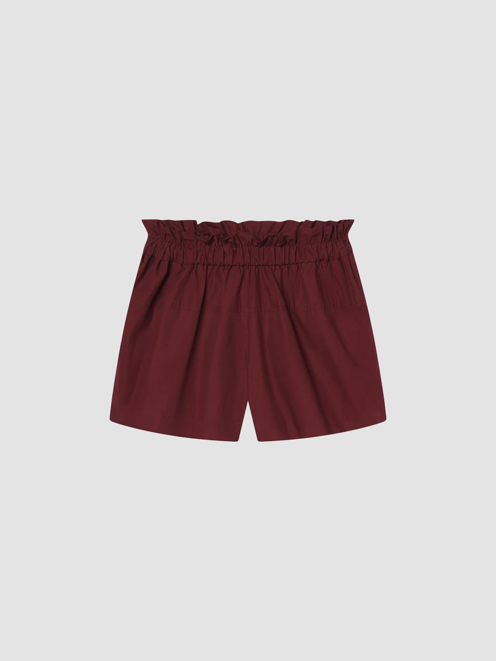The Nate Short is crafted from Italian polished cotton poplin—a crisp, breathable fabric with gentle structure and a refined, smooth hand—in a rich burgundy hue. This relaxed silhouette features an elastic waistband, side seam pockets, and a clean hem.