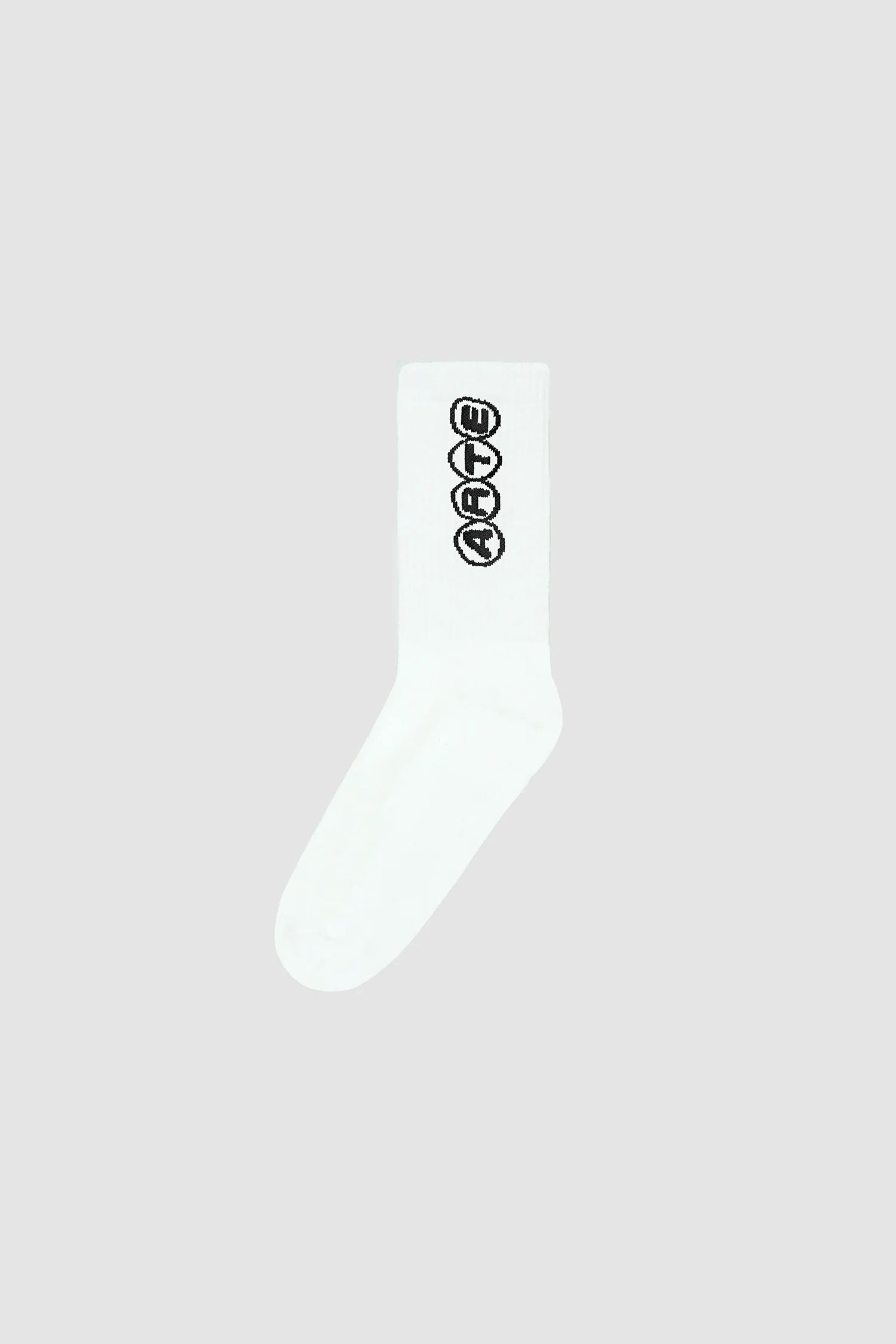 The pair of socks has comfort at its core. It's cut from a stretchy cotton mix to provide a fresh feeling from day to night. Made in a one-size-fits-all, the white ribbed socks are topped off with an Arte logo in black at the ankle.