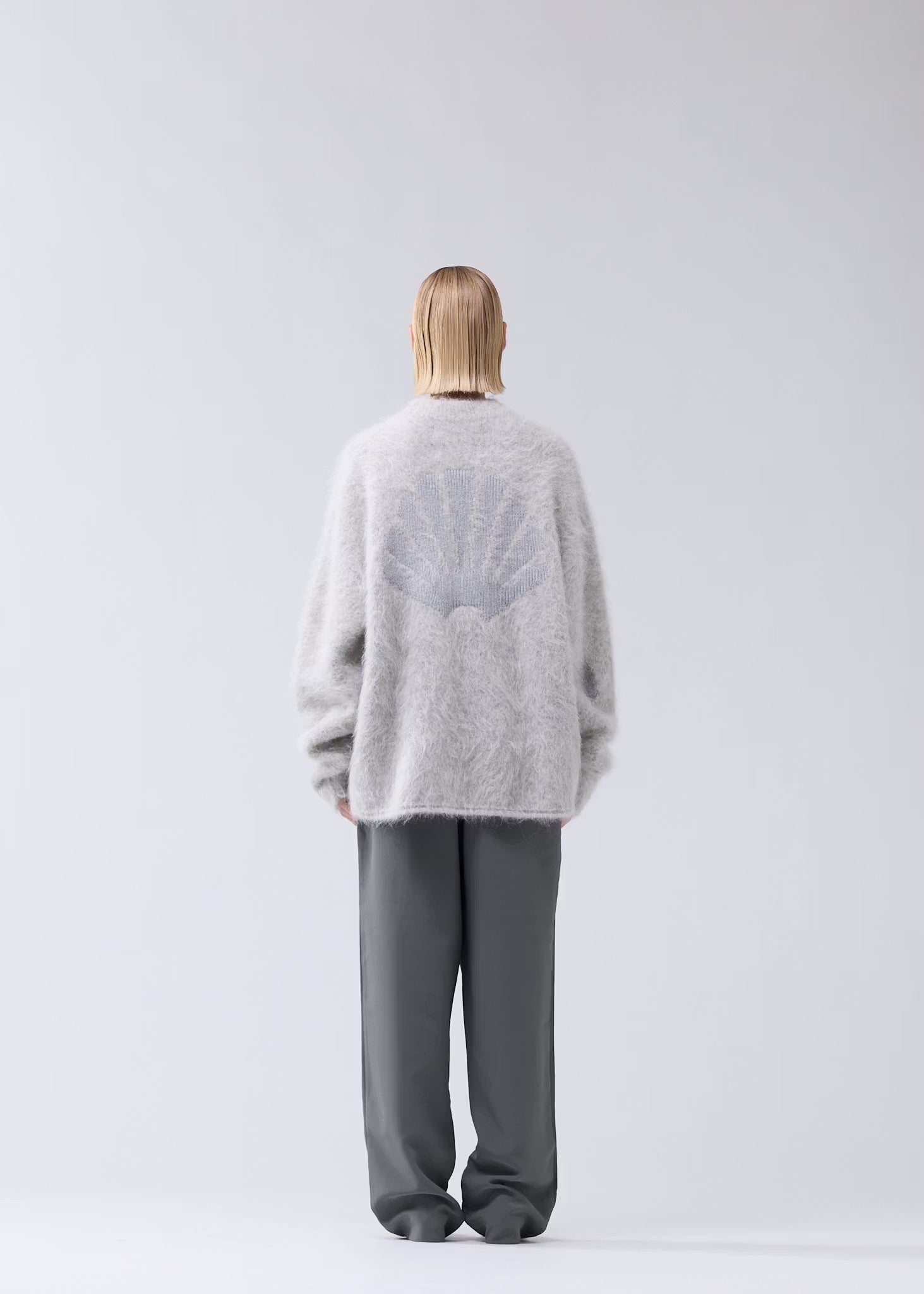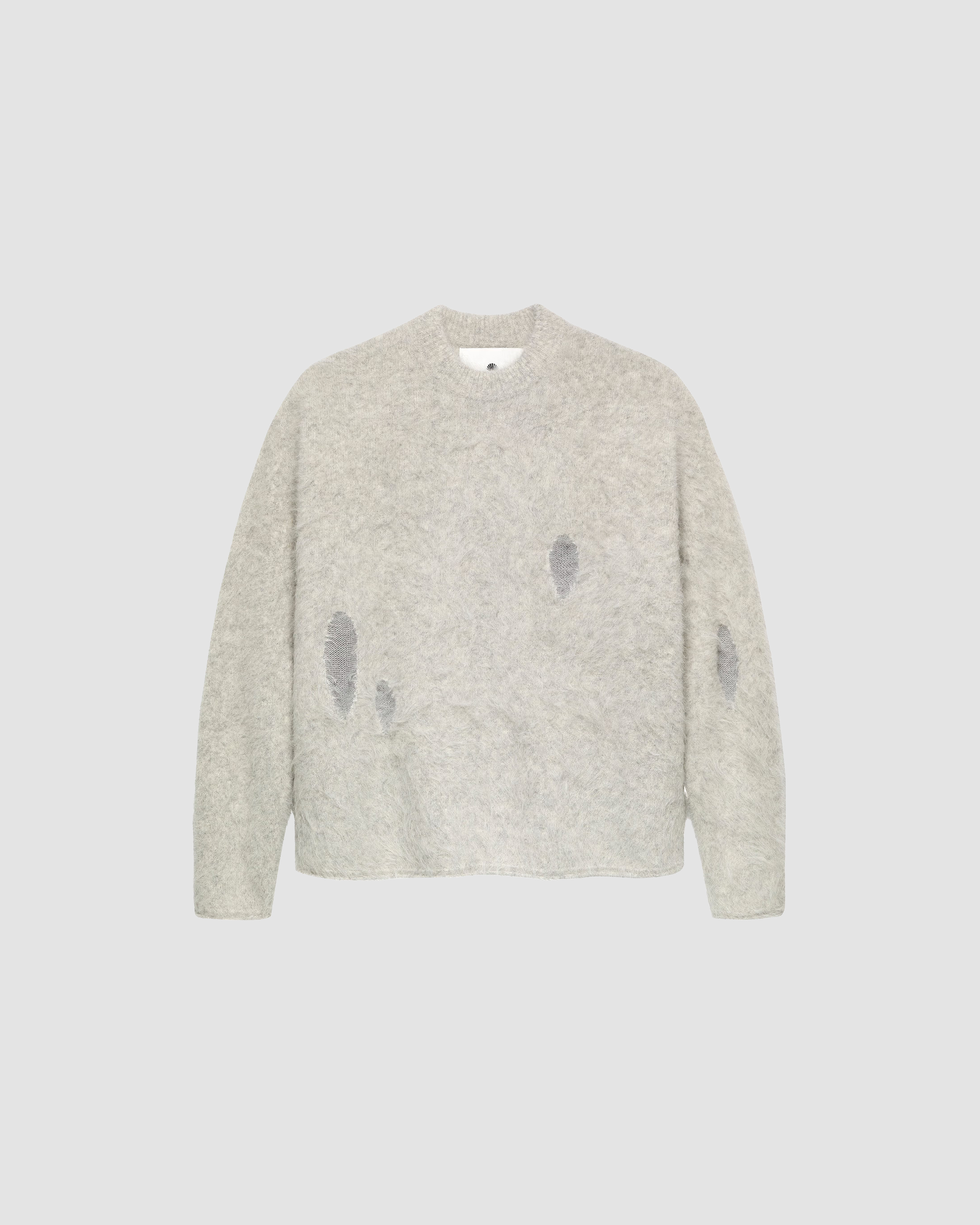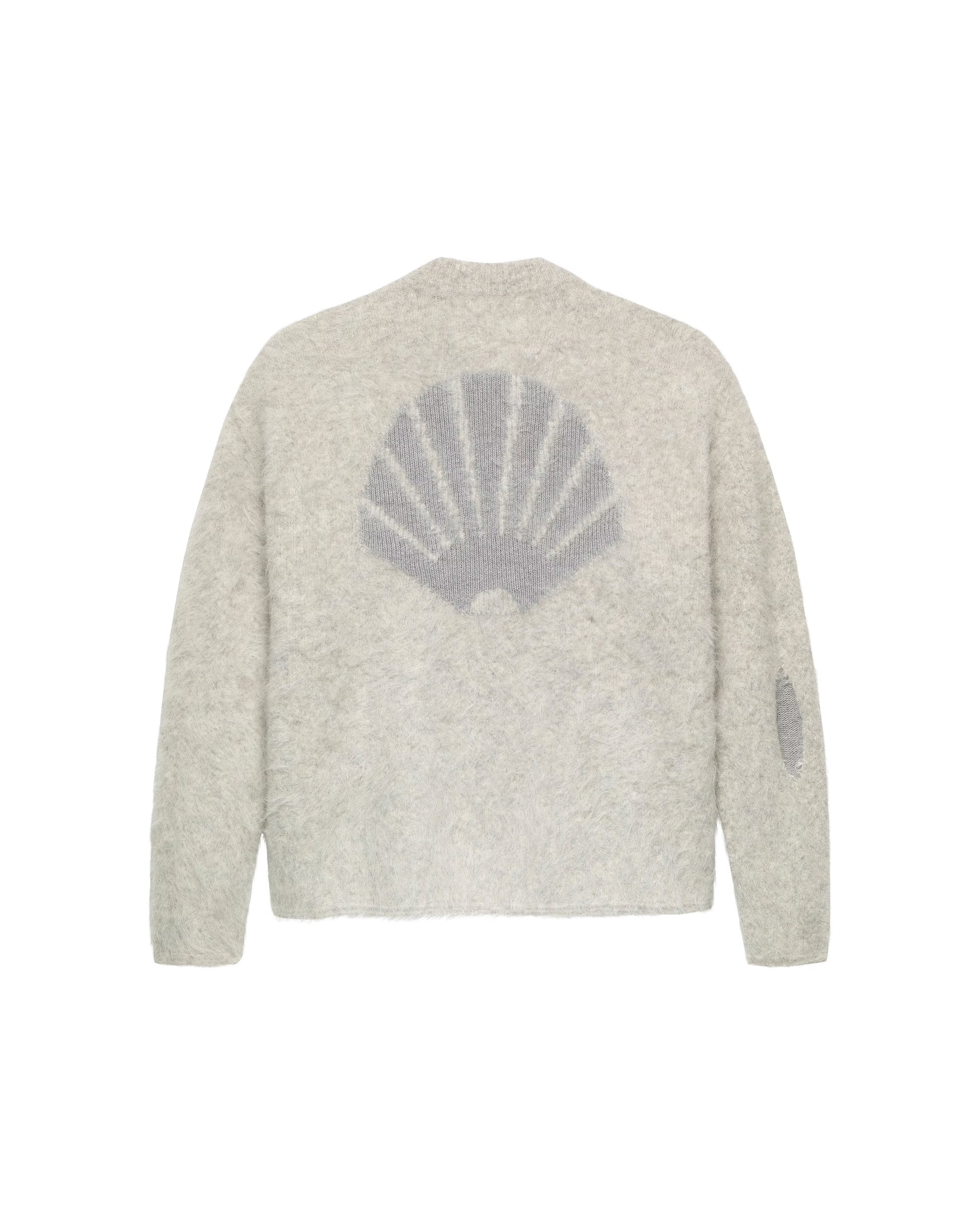 Experience ultimate comfort with this oversized crewneck sweater, crafted from a soft alpaca wool blend. Designed with subtle distressed details for a modern, edgy look, it features a bold shell logo intarsia on the back. Perfect as a standout piece or a cozy addition to your wardrobe.